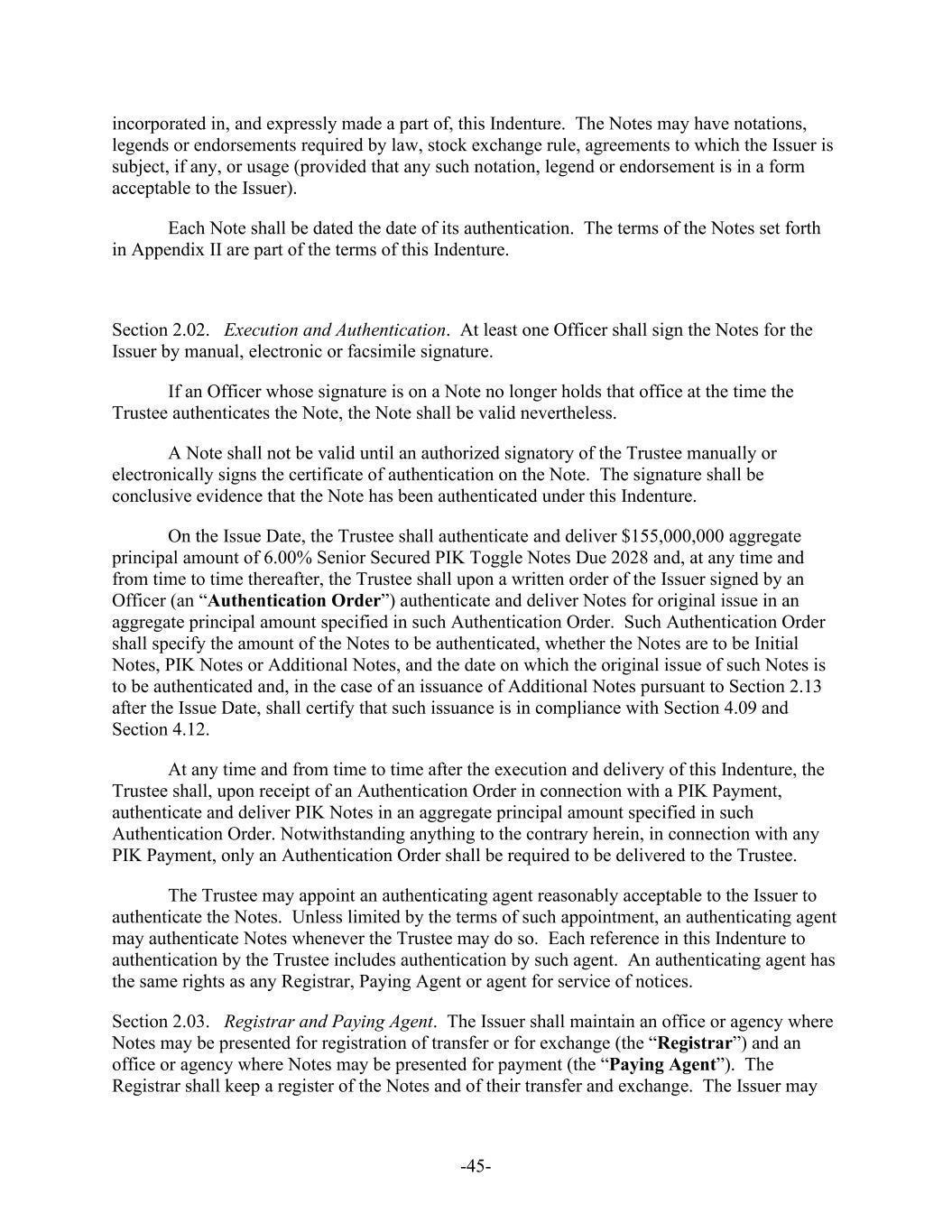 -45- incorporated in, and expressly made a part of, this Indenture. The Notes may have notations, legends or endorsements required by law, stock exchange rule, agreements to which the Issuer is subject, if any, or usage (provided that any such notation, legend or endorsement is in a form acceptable to the Issuer). Each Note shall be dated the date of its authentication. The terms of the Notes set forth in Appendix II are part of the terms of this Indenture. Section 2.02. Execution and Authentication. At least one Officer shall sign the Notes for the Issuer by manual, electronic or facsimile signature. If an Officer whose signature is on a Note no longer holds that office at the time the Trustee authenticates the Note, the Note shall be valid nevertheless. A Note shall not be valid until an authorized signatory of the Trustee manually or electronically signs the certificate of authentication on the Note. The signature shall be conclusive evidence that the Note has been authenticated under this Indenture. On the Issue Date, the Trustee shall authenticate and deliver $155,000,000 aggregate principal amount of 6.00% Senior Secured PIK Toggle Notes Due 2028 and, at any time and from time to time thereafter, the Trustee shall upon a written order of the Issuer signed by an Officer (an “Authentication Order”) authenticate and deliver Notes for original issue in an aggregate principal amount specified in such Authentication Order. Such Authentication Order shall specify the amount of the Notes to be authenticated, whether the Notes are to be Initial Notes, PIK Notes or Additional Notes, and the date on which the original issue of such Notes is to be authenticated and, in the case of an issuance of Additional Notes pursuant to Section 2.13 after the Issue Date, shall certify that such issuance is in compliance with Section 4.09 and Section 4.12. At any time and from time to time after the execution and delivery of this Indenture, the Trustee shall, upon receipt of an Authentication Order in connection with a PIK Payment, authenticate and deliver PIK Notes in an aggregate principal amount specified in such Authentication Order. Notwithstanding anything to the contrary herein, in connection with any PIK Payment, only an Authentication Order shall be required to be delivered to the Trustee. The Trustee may appoint an authenticating agent reasonably acceptable to the Issuer to authenticate the Notes. Unless limited by the terms of such appointment, an authenticating agent may authenticate Notes whenever the Trustee may do so. Each reference in this Indenture to authentication by the Trustee includes authentication by such agent. An authenticating agent has the same rights as any Registrar, Paying Agent or agent for service of notices. Section 2.03. Registrar and Paying Agent. The Issuer shall maintain an office or agency where Notes may be presented for registration of transfer or for exchange (the “Registrar”) and an office or agency where Notes may be presented for payment (the “Paying Agent”). The Registrar shall keep a register of the Notes and of their transfer and exchange. The Issuer may