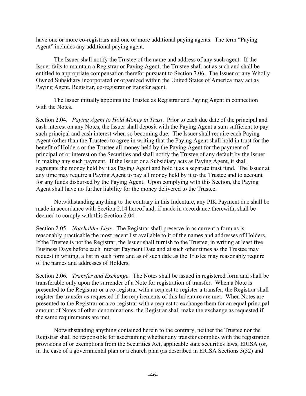 -46- have one or more co-registrars and one or more additional paying agents. The term “Paying Agent” includes any additional paying agent. The Issuer shall notify the Trustee of the name and address of any such agent. If the Issuer fails to maintain a Registrar or Paying Agent, the Trustee shall act as such and shall be entitled to appropriate compensation therefor pursuant to Section 7.06. The Issuer or any Wholly Owned Subsidiary incorporated or organized within the United States of America may act as Paying Agent, Registrar, co-registrar or transfer agent. The Issuer initially appoints the Trustee as Registrar and Paying Agent in connection with the Notes. Section 2.04. Paying Agent to Hold Money in Trust. Prior to each due date of the principal and cash interest on any Notes, the Issuer shall deposit with the Paying Agent a sum sufficient to pay such principal and cash interest when so becoming due. The Issuer shall require each Paying Agent (other than the Trustee) to agree in writing that the Paying Agent shall hold in trust for the benefit of Holders or the Trustee all money held by the Paying Agent for the payment of principal of or interest on the Securities and shall notify the Trustee of any default by the Issuer in making any such payment. If the Issuer or a Subsidiary acts as Paying Agent, it shall segregate the money held by it as Paying Agent and hold it as a separate trust fund. The Issuer at any time may require a Paying Agent to pay all money held by it to the Trustee and to account for any funds disbursed by the Paying Agent. Upon complying with this Section, the Paying Agent shall have no further liability for the money delivered to the Trustee. Notwithstanding anything to the contrary in this Indenture, any PIK Payment due shall be made in accordance with Section 2.14 hereof and, if made in accordance therewith, shall be deemed to comply with this Section 2.04. Section 2.05. Noteholder Lists. The Registrar shall preserve in as current a form as is reasonably practicable the most recent list available to it of the names and addresses of Holders. If the Trustee is not the Registrar, the Issuer shall furnish to the Trustee, in writing at least five Business Days before each Interest Payment Date and at such other times as the Trustee may request in writing, a list in such form and as of such date as the Trustee may reasonably require of the names and addresses of Holders. Section 2.06. Transfer and Exchange. The Notes shall be issued in registered form and shall be transferable only upon the surrender of a Note for registration of transfer. When a Note is presented to the Registrar or a co-registrar with a request to register a transfer, the Registrar shall register the transfer as requested if the requirements of this Indenture are met. When Notes are presented to the Registrar or a co-registrar with a request to exchange them for an equal principal amount of Notes of other denominations, the Registrar shall make the exchange as requested if the same requirements are met. Notwithstanding anything contained herein to the contrary, neither the Trustee nor the Registrar shall be responsible for ascertaining whether any transfer complies with the registration provisions of or exemptions from the Securities Act, applicable state securities laws, ERISA (or, in the case of a governmental plan or a church plan (as described in ERISA Sections 3(32) and