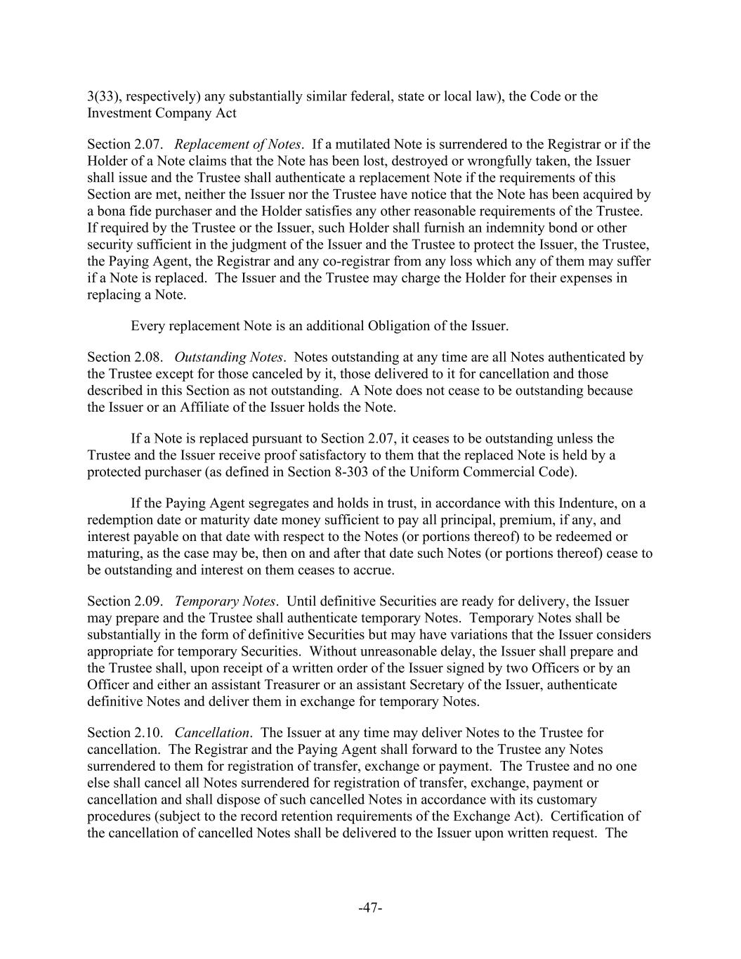 -47- 3(33), respectively) any substantially similar federal, state or local law), the Code or the Investment Company Act Section 2.07. Replacement of Notes. If a mutilated Note is surrendered to the Registrar or if the Holder of a Note claims that the Note has been lost, destroyed or wrongfully taken, the Issuer shall issue and the Trustee shall authenticate a replacement Note if the requirements of this Section are met, neither the Issuer nor the Trustee have notice that the Note has been acquired by a bona fide purchaser and the Holder satisfies any other reasonable requirements of the Trustee. If required by the Trustee or the Issuer, such Holder shall furnish an indemnity bond or other security sufficient in the judgment of the Issuer and the Trustee to protect the Issuer, the Trustee, the Paying Agent, the Registrar and any co-registrar from any loss which any of them may suffer if a Note is replaced. The Issuer and the Trustee may charge the Holder for their expenses in replacing a Note. Every replacement Note is an additional Obligation of the Issuer. Section 2.08. Outstanding Notes. Notes outstanding at any time are all Notes authenticated by the Trustee except for those canceled by it, those delivered to it for cancellation and those described in this Section as not outstanding. A Note does not cease to be outstanding because the Issuer or an Affiliate of the Issuer holds the Note. If a Note is replaced pursuant to Section 2.07, it ceases to be outstanding unless the Trustee and the Issuer receive proof satisfactory to them that the replaced Note is held by a protected purchaser (as defined in Section 8-303 of the Uniform Commercial Code). If the Paying Agent segregates and holds in trust, in accordance with this Indenture, on a redemption date or maturity date money sufficient to pay all principal, premium, if any, and interest payable on that date with respect to the Notes (or portions thereof) to be redeemed or maturing, as the case may be, then on and after that date such Notes (or portions thereof) cease to be outstanding and interest on them ceases to accrue. Section 2.09. Temporary Notes. Until definitive Securities are ready for delivery, the Issuer may prepare and the Trustee shall authenticate temporary Notes. Temporary Notes shall be substantially in the form of definitive Securities but may have variations that the Issuer considers appropriate for temporary Securities. Without unreasonable delay, the Issuer shall prepare and the Trustee shall, upon receipt of a written order of the Issuer signed by two Officers or by an Officer and either an assistant Treasurer or an assistant Secretary of the Issuer, authenticate definitive Notes and deliver them in exchange for temporary Notes. Section 2.10. Cancellation. The Issuer at any time may deliver Notes to the Trustee for cancellation. The Registrar and the Paying Agent shall forward to the Trustee any Notes surrendered to them for registration of transfer, exchange or payment. The Trustee and no one else shall cancel all Notes surrendered for registration of transfer, exchange, payment or cancellation and shall dispose of such cancelled Notes in accordance with its customary procedures (subject to the record retention requirements of the Exchange Act). Certification of the cancellation of cancelled Notes shall be delivered to the Issuer upon written request. The