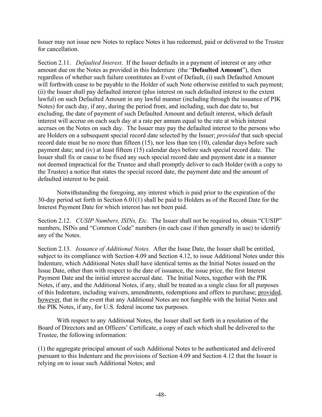 -48- Issuer may not issue new Notes to replace Notes it has redeemed, paid or delivered to the Trustee for cancellation. Section 2.11. Defaulted Interest. If the Issuer defaults in a payment of interest or any other amount due on the Notes as provided in this Indenture (the “Defaulted Amount”), then regardless of whether such failure constitutes an Event of Default, (i) such Defaulted Amount will forthwith cease to be payable to the Holder of such Note otherwise entitled to such payment; (ii) the Issuer shall pay defaulted interest (plus interest on such defaulted interest to the extent lawful) on such Defaulted Amount in any lawful manner (including through the issuance of PIK Notes) for each day, if any, during the period from, and including, such due date to, but excluding, the date of payment of such Defaulted Amount and default interest, which default interest will accrue on each such day at a rate per annum equal to the rate at which interest accrues on the Notes on such day. The Issuer may pay the defaulted interest to the persons who are Holders on a subsequent special record date selected by the Issuer; provided that such special record date must be no more than fifteen (15), nor less than ten (10), calendar days before such payment date; and (iv) at least fifteen (15) calendar days before such special record date. The Issuer shall fix or cause to be fixed any such special record date and payment date in a manner not deemed impractical for the Trustee and shall promptly deliver to each Holder (with a copy to the Trustee) a notice that states the special record date, the payment date and the amount of defaulted interest to be paid. Notwithstanding the foregoing, any interest which is paid prior to the expiration of the 30-day period set forth in Section 6.01(1) shall be paid to Holders as of the Record Date for the Interest Payment Date for which interest has not been paid. Section 2.12. CUSIP Numbers, ISINs, Etc. The Issuer shall not be required to, obtain “CUSIP” numbers, ISINs and “Common Code” numbers (in each case if then generally in use) to identify any of the Notes. Section 2.13. Issuance of Additional Notes. After the Issue Date, the Issuer shall be entitled, subject to its compliance with Section 4.09 and Section 4.12, to issue Additional Notes under this Indenture, which Additional Notes shall have identical terms as the Initial Notes issued on the Issue Date, other than with respect to the date of issuance, the issue price, the first Interest Payment Date and the initial interest accrual date. The Initial Notes, together with the PIK Notes, if any, and the Additional Notes, if any, shall be treated as a single class for all purposes of this Indenture, including waivers, amendments, redemptions and offers to purchase; provided, however, that in the event that any Additional Notes are not fungible with the Initial Notes and the PIK Notes, if any, for U.S. federal income tax purposes. With respect to any Additional Notes, the Issuer shall set forth in a resolution of the Board of Directors and an Officers’ Certificate, a copy of each which shall be delivered to the Trustee, the following information: (1) the aggregate principal amount of such Additional Notes to be authenticated and delivered pursuant to this Indenture and the provisions of Section 4.09 and Section 4.12 that the Issuer is relying on to issue such Additional Notes; and