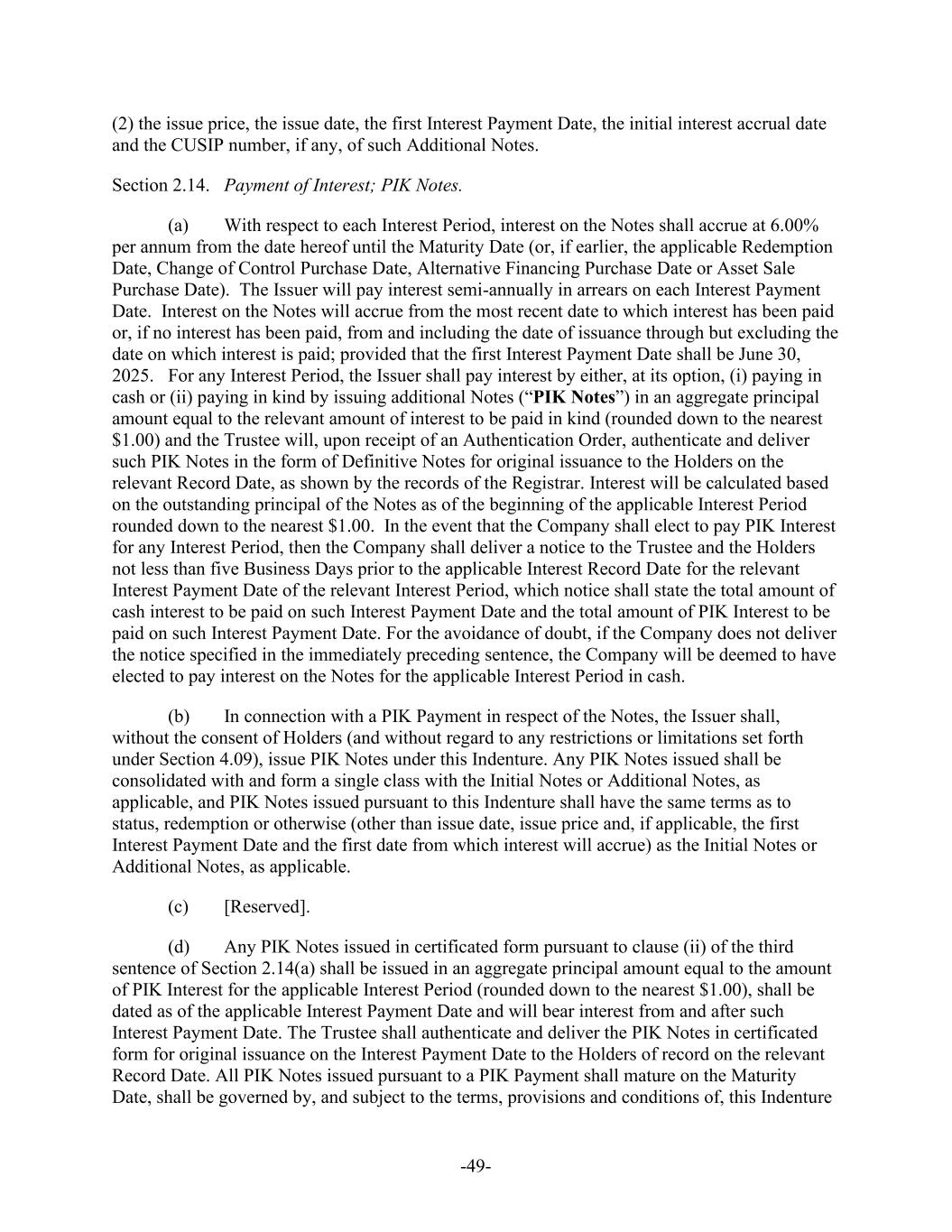 -49- (2) the issue price, the issue date, the first Interest Payment Date, the initial interest accrual date and the CUSIP number, if any, of such Additional Notes. Section 2.14. Payment of Interest; PIK Notes. (a) With respect to each Interest Period, interest on the Notes shall accrue at 6.00% per annum from the date hereof until the Maturity Date (or, if earlier, the applicable Redemption Date, Change of Control Purchase Date, Alternative Financing Purchase Date or Asset Sale Purchase Date). The Issuer will pay interest semi-annually in arrears on each Interest Payment Date. Interest on the Notes will accrue from the most recent date to which interest has been paid or, if no interest has been paid, from and including the date of issuance through but excluding the date on which interest is paid; provided that the first Interest Payment Date shall be June 30, 2025. For any Interest Period, the Issuer shall pay interest by either, at its option, (i) paying in cash or (ii) paying in kind by issuing additional Notes (“PIK Notes”) in an aggregate principal amount equal to the relevant amount of interest to be paid in kind (rounded down to the nearest $1.00) and the Trustee will, upon receipt of an Authentication Order, authenticate and deliver such PIK Notes in the form of Definitive Notes for original issuance to the Holders on the relevant Record Date, as shown by the records of the Registrar. Interest will be calculated based on the outstanding principal of the Notes as of the beginning of the applicable Interest Period rounded down to the nearest $1.00. In the event that the Company shall elect to pay PIK Interest for any Interest Period, then the Company shall deliver a notice to the Trustee and the Holders not less than five Business Days prior to the applicable Interest Record Date for the relevant Interest Payment Date of the relevant Interest Period, which notice shall state the total amount of cash interest to be paid on such Interest Payment Date and the total amount of PIK Interest to be paid on such Interest Payment Date. For the avoidance of doubt, if the Company does not deliver the notice specified in the immediately preceding sentence, the Company will be deemed to have elected to pay interest on the Notes for the applicable Interest Period in cash. (b) In connection with a PIK Payment in respect of the Notes, the Issuer shall, without the consent of Holders (and without regard to any restrictions or limitations set forth under Section 4.09), issue PIK Notes under this Indenture. Any PIK Notes issued shall be consolidated with and form a single class with the Initial Notes or Additional Notes, as applicable, and PIK Notes issued pursuant to this Indenture shall have the same terms as to status, redemption or otherwise (other than issue date, issue price and, if applicable, the first Interest Payment Date and the first date from which interest will accrue) as the Initial Notes or Additional Notes, as applicable. (c) [Reserved]. (d) Any PIK Notes issued in certificated form pursuant to clause (ii) of the third sentence of Section 2.14(a) shall be issued in an aggregate principal amount equal to the amount of PIK Interest for the applicable Interest Period (rounded down to the nearest $1.00), shall be dated as of the applicable Interest Payment Date and will bear interest from and after such Interest Payment Date. The Trustee shall authenticate and deliver the PIK Notes in certificated form for original issuance on the Interest Payment Date to the Holders of record on the relevant Record Date. All PIK Notes issued pursuant to a PIK Payment shall mature on the Maturity Date, shall be governed by, and subject to the terms, provisions and conditions of, this Indenture