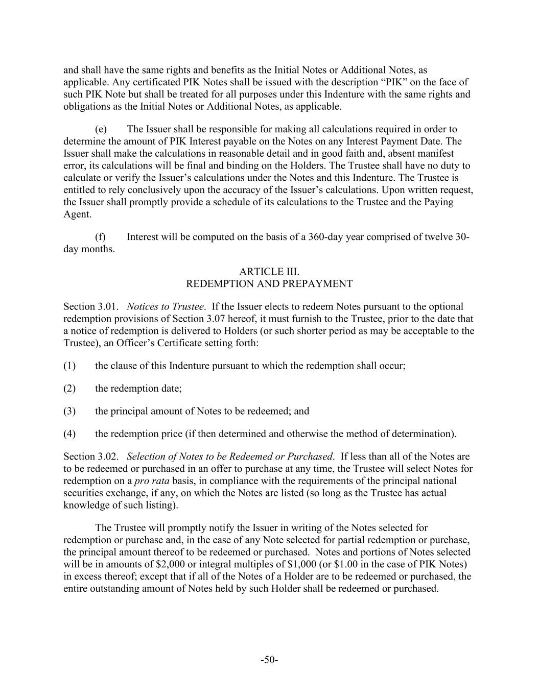 -50- and shall have the same rights and benefits as the Initial Notes or Additional Notes, as applicable. Any certificated PIK Notes shall be issued with the description “PIK” on the face of such PIK Note but shall be treated for all purposes under this Indenture with the same rights and obligations as the Initial Notes or Additional Notes, as applicable. (e) The Issuer shall be responsible for making all calculations required in order to determine the amount of PIK Interest payable on the Notes on any Interest Payment Date. The Issuer shall make the calculations in reasonable detail and in good faith and, absent manifest error, its calculations will be final and binding on the Holders. The Trustee shall have no duty to calculate or verify the Issuer’s calculations under the Notes and this Indenture. The Trustee is entitled to rely conclusively upon the accuracy of the Issuer’s calculations. Upon written request, the Issuer shall promptly provide a schedule of its calculations to the Trustee and the Paying Agent. (f) Interest will be computed on the basis of a 360-day year comprised of twelve 30- day months. ARTICLE III. REDEMPTION AND PREPAYMENT Section 3.01. Notices to Trustee. If the Issuer elects to redeem Notes pursuant to the optional redemption provisions of Section 3.07 hereof, it must furnish to the Trustee, prior to the date that a notice of redemption is delivered to Holders (or such shorter period as may be acceptable to the Trustee), an Officer’s Certificate setting forth: (1) the clause of this Indenture pursuant to which the redemption shall occur; (2) the redemption date; (3) the principal amount of Notes to be redeemed; and (4) the redemption price (if then determined and otherwise the method of determination). Section 3.02. Selection of Notes to be Redeemed or Purchased. If less than all of the Notes are to be redeemed or purchased in an offer to purchase at any time, the Trustee will select Notes for redemption on a pro rata basis, in compliance with the requirements of the principal national securities exchange, if any, on which the Notes are listed (so long as the Trustee has actual knowledge of such listing). The Trustee will promptly notify the Issuer in writing of the Notes selected for redemption or purchase and, in the case of any Note selected for partial redemption or purchase, the principal amount thereof to be redeemed or purchased. Notes and portions of Notes selected will be in amounts of $2,000 or integral multiples of $1,000 (or $1.00 in the case of PIK Notes) in excess thereof; except that if all of the Notes of a Holder are to be redeemed or purchased, the entire outstanding amount of Notes held by such Holder shall be redeemed or purchased.