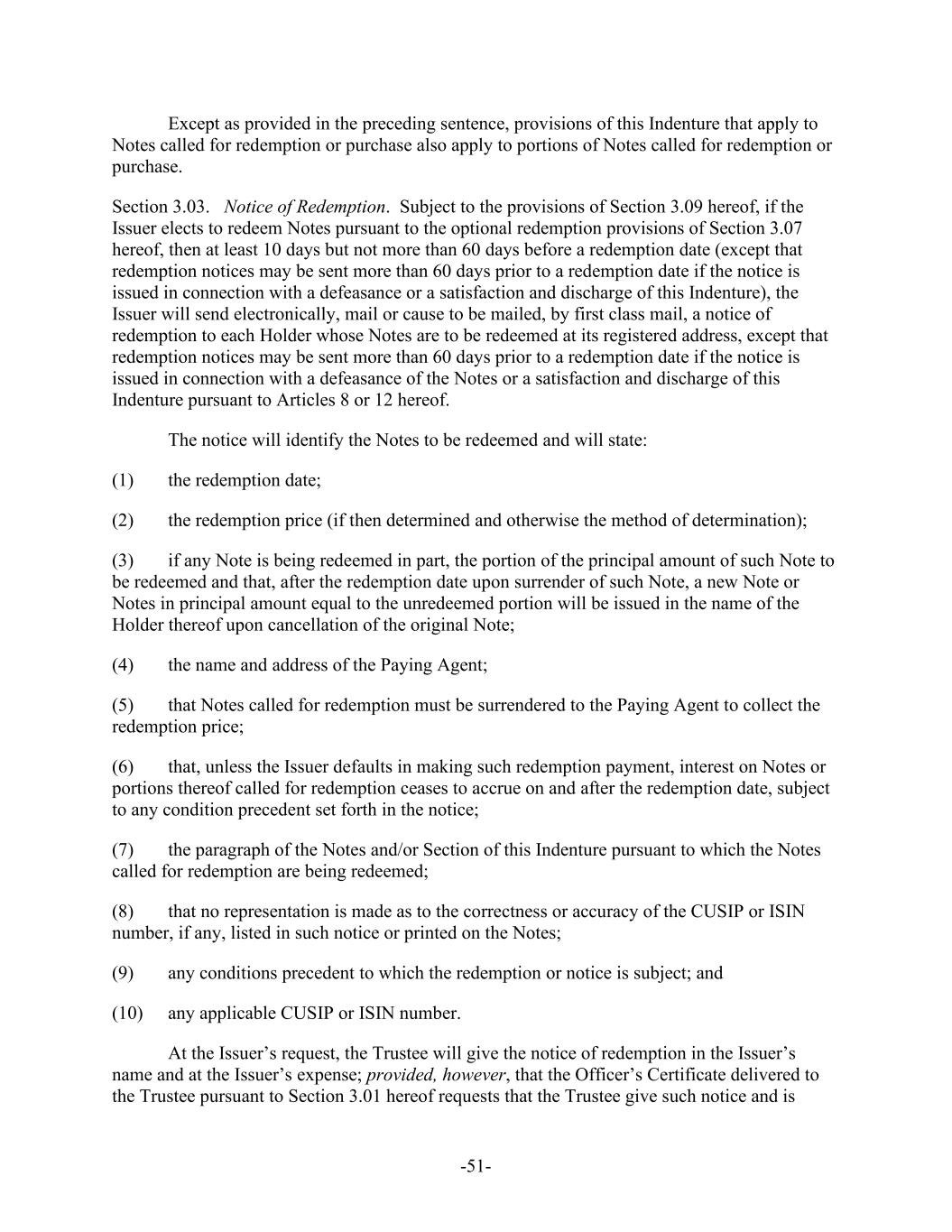 -51- Except as provided in the preceding sentence, provisions of this Indenture that apply to Notes called for redemption or purchase also apply to portions of Notes called for redemption or purchase. Section 3.03. Notice of Redemption. Subject to the provisions of Section 3.09 hereof, if the Issuer elects to redeem Notes pursuant to the optional redemption provisions of Section 3.07 hereof, then at least 10 days but not more than 60 days before a redemption date (except that redemption notices may be sent more than 60 days prior to a redemption date if the notice is issued in connection with a defeasance or a satisfaction and discharge of this Indenture), the Issuer will send electronically, mail or cause to be mailed, by first class mail, a notice of redemption to each Holder whose Notes are to be redeemed at its registered address, except that redemption notices may be sent more than 60 days prior to a redemption date if the notice is issued in connection with a defeasance of the Notes or a satisfaction and discharge of this Indenture pursuant to Articles 8 or 12 hereof. The notice will identify the Notes to be redeemed and will state: (1) the redemption date; (2) the redemption price (if then determined and otherwise the method of determination); (3) if any Note is being redeemed in part, the portion of the principal amount of such Note to be redeemed and that, after the redemption date upon surrender of such Note, a new Note or Notes in principal amount equal to the unredeemed portion will be issued in the name of the Holder thereof upon cancellation of the original Note; (4) the name and address of the Paying Agent; (5) that Notes called for redemption must be surrendered to the Paying Agent to collect the redemption price; (6) that, unless the Issuer defaults in making such redemption payment, interest on Notes or portions thereof called for redemption ceases to accrue on and after the redemption date, subject to any condition precedent set forth in the notice; (7) the paragraph of the Notes and/or Section of this Indenture pursuant to which the Notes called for redemption are being redeemed; (8) that no representation is made as to the correctness or accuracy of the CUSIP or ISIN number, if any, listed in such notice or printed on the Notes; (9) any conditions precedent to which the redemption or notice is subject; and (10) any applicable CUSIP or ISIN number. At the Issuer’s request, the Trustee will give the notice of redemption in the Issuer’s name and at the Issuer’s expense; provided, however, that the Officer’s Certificate delivered to the Trustee pursuant to Section 3.01 hereof requests that the Trustee give such notice and is
