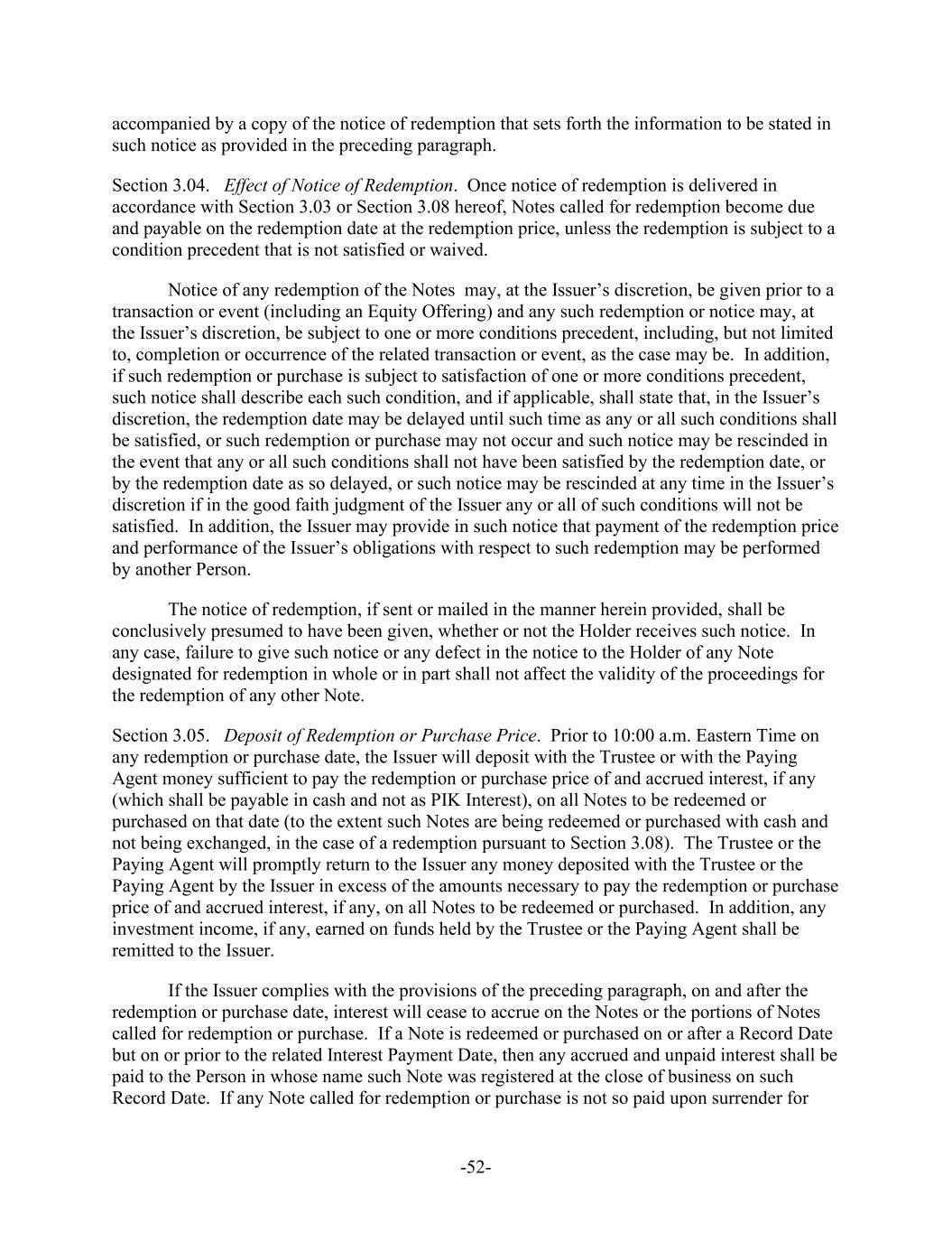 -52- accompanied by a copy of the notice of redemption that sets forth the information to be stated in such notice as provided in the preceding paragraph. Section 3.04. Effect of Notice of Redemption. Once notice of redemption is delivered in accordance with Section 3.03 or Section 3.08 hereof, Notes called for redemption become due and payable on the redemption date at the redemption price, unless the redemption is subject to a condition precedent that is not satisfied or waived. Notice of any redemption of the Notes may, at the Issuer’s discretion, be given prior to a transaction or event (including an Equity Offering) and any such redemption or notice may, at the Issuer’s discretion, be subject to one or more conditions precedent, including, but not limited to, completion or occurrence of the related transaction or event, as the case may be. In addition, if such redemption or purchase is subject to satisfaction of one or more conditions precedent, such notice shall describe each such condition, and if applicable, shall state that, in the Issuer’s discretion, the redemption date may be delayed until such time as any or all such conditions shall be satisfied, or such redemption or purchase may not occur and such notice may be rescinded in the event that any or all such conditions shall not have been satisfied by the redemption date, or by the redemption date as so delayed, or such notice may be rescinded at any time in the Issuer’s discretion if in the good faith judgment of the Issuer any or all of such conditions will not be satisfied. In addition, the Issuer may provide in such notice that payment of the redemption price and performance of the Issuer’s obligations with respect to such redemption may be performed by another Person. The notice of redemption, if sent or mailed in the manner herein provided, shall be conclusively presumed to have been given, whether or not the Holder receives such notice. In any case, failure to give such notice or any defect in the notice to the Holder of any Note designated for redemption in whole or in part shall not affect the validity of the proceedings for the redemption of any other Note. Section 3.05. Deposit of Redemption or Purchase Price. Prior to 10:00 a.m. Eastern Time on any redemption or purchase date, the Issuer will deposit with the Trustee or with the Paying Agent money sufficient to pay the redemption or purchase price of and accrued interest, if any (which shall be payable in cash and not as PIK Interest), on all Notes to be redeemed or purchased on that date (to the extent such Notes are being redeemed or purchased with cash and not being exchanged, in the case of a redemption pursuant to Section 3.08). The Trustee or the Paying Agent will promptly return to the Issuer any money deposited with the Trustee or the Paying Agent by the Issuer in excess of the amounts necessary to pay the redemption or purchase price of and accrued interest, if any, on all Notes to be redeemed or purchased. In addition, any investment income, if any, earned on funds held by the Trustee or the Paying Agent shall be remitted to the Issuer. If the Issuer complies with the provisions of the preceding paragraph, on and after the redemption or purchase date, interest will cease to accrue on the Notes or the portions of Notes called for redemption or purchase. If a Note is redeemed or purchased on or after a Record Date but on or prior to the related Interest Payment Date, then any accrued and unpaid interest shall be paid to the Person in whose name such Note was registered at the close of business on such Record Date. If any Note called for redemption or purchase is not so paid upon surrender for