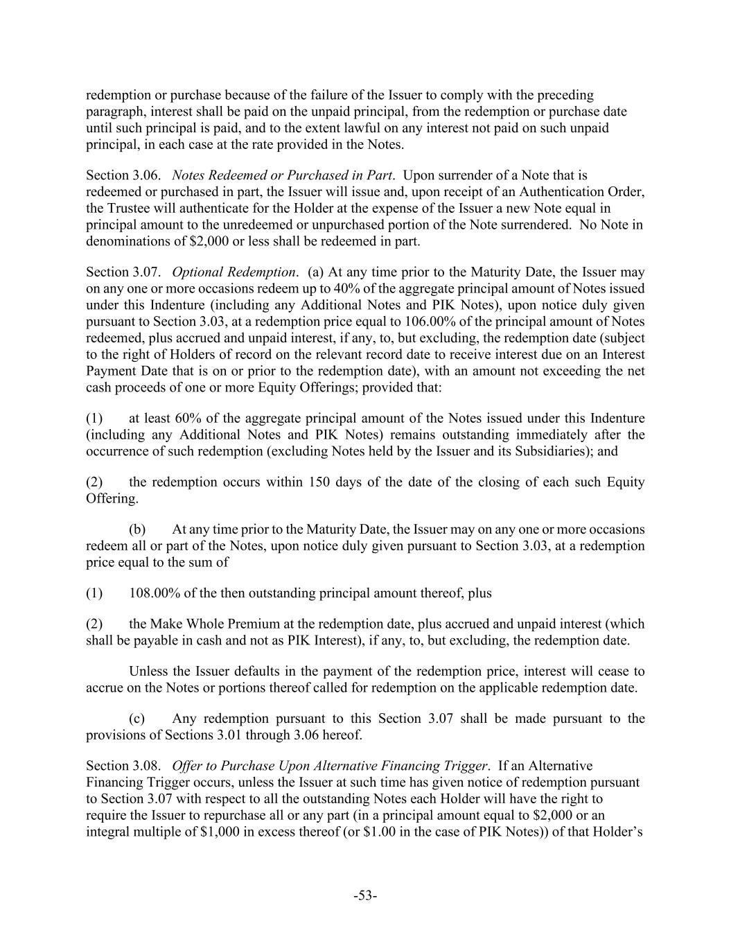 -53- redemption or purchase because of the failure of the Issuer to comply with the preceding paragraph, interest shall be paid on the unpaid principal, from the redemption or purchase date until such principal is paid, and to the extent lawful on any interest not paid on such unpaid principal, in each case at the rate provided in the Notes. Section 3.06. Notes Redeemed or Purchased in Part. Upon surrender of a Note that is redeemed or purchased in part, the Issuer will issue and, upon receipt of an Authentication Order, the Trustee will authenticate for the Holder at the expense of the Issuer a new Note equal in principal amount to the unredeemed or unpurchased portion of the Note surrendered. No Note in denominations of $2,000 or less shall be redeemed in part. Section 3.07. Optional Redemption. (a) At any time prior to the Maturity Date, the Issuer may on any one or more occasions redeem up to 40% of the aggregate principal amount of Notes issued under this Indenture (including any Additional Notes and PIK Notes), upon notice duly given pursuant to Section 3.03, at a redemption price equal to 106.00% of the principal amount of Notes redeemed, plus accrued and unpaid interest, if any, to, but excluding, the redemption date (subject to the right of Holders of record on the relevant record date to receive interest due on an Interest Payment Date that is on or prior to the redemption date), with an amount not exceeding the net cash proceeds of one or more Equity Offerings; provided that: (1) at least 60% of the aggregate principal amount of the Notes issued under this Indenture (including any Additional Notes and PIK Notes) remains outstanding immediately after the occurrence of such redemption (excluding Notes held by the Issuer and its Subsidiaries); and (2) the redemption occurs within 150 days of the date of the closing of each such Equity Offering. (b) At any time prior to the Maturity Date, the Issuer may on any one or more occasions redeem all or part of the Notes, upon notice duly given pursuant to Section 3.03, at a redemption price equal to the sum of (1) 108.00% of the then outstanding principal amount thereof, plus (2) the Make Whole Premium at the redemption date, plus accrued and unpaid interest (which shall be payable in cash and not as PIK Interest), if any, to, but excluding, the redemption date. Unless the Issuer defaults in the payment of the redemption price, interest will cease to accrue on the Notes or portions thereof called for redemption on the applicable redemption date. (c) Any redemption pursuant to this Section 3.07 shall be made pursuant to the provisions of Sections 3.01 through 3.06 hereof. Section 3.08. Offer to Purchase Upon Alternative Financing Trigger. If an Alternative Financing Trigger occurs, unless the Issuer at such time has given notice of redemption pursuant to Section 3.07 with respect to all the outstanding Notes each Holder will have the right to require the Issuer to repurchase all or any part (in a principal amount equal to $2,000 or an integral multiple of $1,000 in excess thereof (or $1.00 in the case of PIK Notes)) of that Holder’s