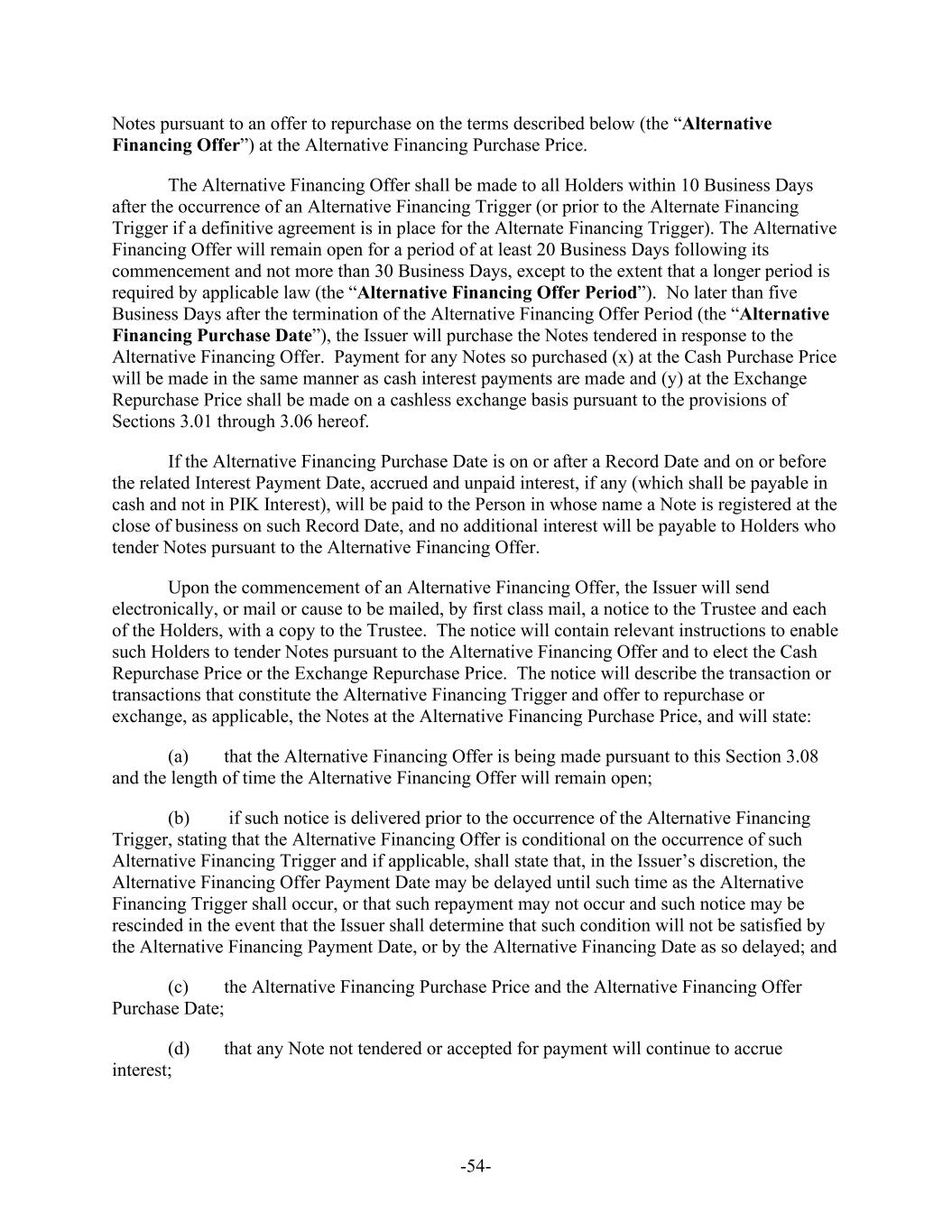 -54- Notes pursuant to an offer to repurchase on the terms described below (the “Alternative Financing Offer”) at the Alternative Financing Purchase Price. The Alternative Financing Offer shall be made to all Holders within 10 Business Days after the occurrence of an Alternative Financing Trigger (or prior to the Alternate Financing Trigger if a definitive agreement is in place for the Alternate Financing Trigger). The Alternative Financing Offer will remain open for a period of at least 20 Business Days following its commencement and not more than 30 Business Days, except to the extent that a longer period is required by applicable law (the “Alternative Financing Offer Period”). No later than five Business Days after the termination of the Alternative Financing Offer Period (the “Alternative Financing Purchase Date”), the Issuer will purchase the Notes tendered in response to the Alternative Financing Offer. Payment for any Notes so purchased (x) at the Cash Purchase Price will be made in the same manner as cash interest payments are made and (y) at the Exchange Repurchase Price shall be made on a cashless exchange basis pursuant to the provisions of Sections 3.01 through 3.06 hereof. If the Alternative Financing Purchase Date is on or after a Record Date and on or before the related Interest Payment Date, accrued and unpaid interest, if any (which shall be payable in cash and not in PIK Interest), will be paid to the Person in whose name a Note is registered at the close of business on such Record Date, and no additional interest will be payable to Holders who tender Notes pursuant to the Alternative Financing Offer. Upon the commencement of an Alternative Financing Offer, the Issuer will send electronically, or mail or cause to be mailed, by first class mail, a notice to the Trustee and each of the Holders, with a copy to the Trustee. The notice will contain relevant instructions to enable such Holders to tender Notes pursuant to the Alternative Financing Offer and to elect the Cash Repurchase Price or the Exchange Repurchase Price. The notice will describe the transaction or transactions that constitute the Alternative Financing Trigger and offer to repurchase or exchange, as applicable, the Notes at the Alternative Financing Purchase Price, and will state: (a) that the Alternative Financing Offer is being made pursuant to this Section 3.08 and the length of time the Alternative Financing Offer will remain open; (b) if such notice is delivered prior to the occurrence of the Alternative Financing Trigger, stating that the Alternative Financing Offer is conditional on the occurrence of such Alternative Financing Trigger and if applicable, shall state that, in the Issuer’s discretion, the Alternative Financing Offer Payment Date may be delayed until such time as the Alternative Financing Trigger shall occur, or that such repayment may not occur and such notice may be rescinded in the event that the Issuer shall determine that such condition will not be satisfied by the Alternative Financing Payment Date, or by the Alternative Financing Date as so delayed; and (c) the Alternative Financing Purchase Price and the Alternative Financing Offer Purchase Date; (d) that any Note not tendered or accepted for payment will continue to accrue interest;