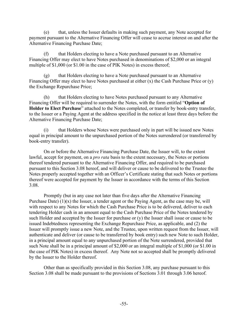 -55- (e) that, unless the Issuer defaults in making such payment, any Note accepted for payment pursuant to the Alternative Financing Offer will cease to accrue interest on and after the Alternative Financing Purchase Date; (f) that Holders electing to have a Note purchased pursuant to an Alternative Financing Offer may elect to have Notes purchased in denominations of $2,000 or an integral multiple of $1,000 (or $1.00 in the case of PIK Notes) in excess thereof; (g) that Holders electing to have a Note purchased pursuant to an Alternative Financing Offer may elect to have Notes purchased at either (x) the Cash Purchase Price or (y) the Exchange Repurchase Price; (h) that Holders electing to have Notes purchased pursuant to any Alternative Financing Offer will be required to surrender the Notes, with the form entitled “Option of Holder to Elect Purchase” attached to the Notes completed, or transfer by book-entry transfer, to the Issuer or a Paying Agent at the address specified in the notice at least three days before the Alternative Financing Purchase Date; (i) that Holders whose Notes were purchased only in part will be issued new Notes equal in principal amount to the unpurchased portion of the Notes surrendered (or transferred by book-entry transfer). On or before the Alternative Financing Purchase Date, the Issuer will, to the extent lawful, accept for payment, on a pro rata basis to the extent necessary, the Notes or portions thereof tendered pursuant to the Alternative Financing Offer, and required to be purchased pursuant to this Section 3.08 hereof, and will deliver or cause to be delivered to the Trustee the Notes properly accepted together with an Officer’s Certificate stating that such Notes or portions thereof were accepted for payment by the Issuer in accordance with the terms of this Section 3.08. Promptly (but in any case not later than five days after the Alternative Financing Purchase Date) (1)(x) the Issuer, a tender agent or the Paying Agent, as the case may be, will with respect to any Notes for which the Cash Purchase Price is to be delivered, deliver to each tendering Holder cash in an amount equal to the Cash Purchase Price of the Notes tendered by such Holder and accepted by the Issuer for purchase or (y) the Issuer shall issue or cause to be issued Indebtedness representing the Exchange Repurchase Price, as applicable, and (2) the Issuer will promptly issue a new Note, and the Trustee, upon written request from the Issuer, will authenticate and deliver (or cause to be transferred by book entry) such new Note to such Holder, in a principal amount equal to any unpurchased portion of the Note surrendered, provided that such Note shall be in a principal amount of $2,000 or an integral multiple of $1,000 (or $1.00 in the case of PIK Notes) in excess thereof. Any Note not so accepted shall be promptly delivered by the Issuer to the Holder thereof. Other than as specifically provided in this Section 3.08, any purchase pursuant to this Section 3.08 shall be made pursuant to the provisions of Sections 3.01 through 3.06 hereof.