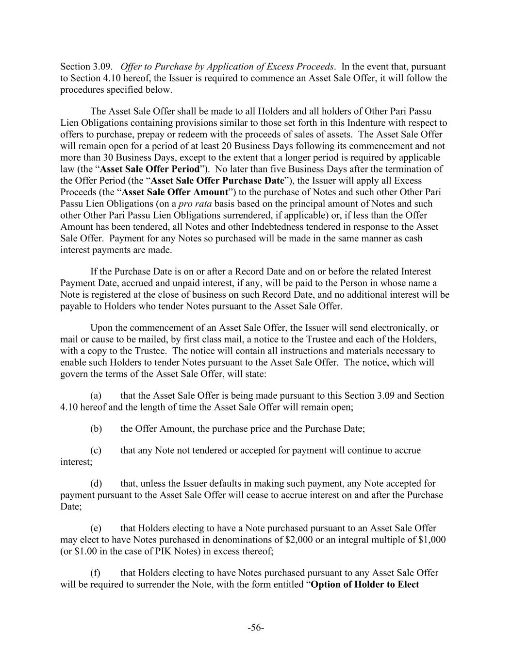 -56- Section 3.09. Offer to Purchase by Application of Excess Proceeds. In the event that, pursuant to Section 4.10 hereof, the Issuer is required to commence an Asset Sale Offer, it will follow the procedures specified below. The Asset Sale Offer shall be made to all Holders and all holders of Other Pari Passu Lien Obligations containing provisions similar to those set forth in this Indenture with respect to offers to purchase, prepay or redeem with the proceeds of sales of assets. The Asset Sale Offer will remain open for a period of at least 20 Business Days following its commencement and not more than 30 Business Days, except to the extent that a longer period is required by applicable law (the “Asset Sale Offer Period”). No later than five Business Days after the termination of the Offer Period (the “Asset Sale Offer Purchase Date”), the Issuer will apply all Excess Proceeds (the “Asset Sale Offer Amount”) to the purchase of Notes and such other Other Pari Passu Lien Obligations (on a pro rata basis based on the principal amount of Notes and such other Other Pari Passu Lien Obligations surrendered, if applicable) or, if less than the Offer Amount has been tendered, all Notes and other Indebtedness tendered in response to the Asset Sale Offer. Payment for any Notes so purchased will be made in the same manner as cash interest payments are made. If the Purchase Date is on or after a Record Date and on or before the related Interest Payment Date, accrued and unpaid interest, if any, will be paid to the Person in whose name a Note is registered at the close of business on such Record Date, and no additional interest will be payable to Holders who tender Notes pursuant to the Asset Sale Offer. Upon the commencement of an Asset Sale Offer, the Issuer will send electronically, or mail or cause to be mailed, by first class mail, a notice to the Trustee and each of the Holders, with a copy to the Trustee. The notice will contain all instructions and materials necessary to enable such Holders to tender Notes pursuant to the Asset Sale Offer. The notice, which will govern the terms of the Asset Sale Offer, will state: (a) that the Asset Sale Offer is being made pursuant to this Section 3.09 and Section 4.10 hereof and the length of time the Asset Sale Offer will remain open; (b) the Offer Amount, the purchase price and the Purchase Date; (c) that any Note not tendered or accepted for payment will continue to accrue interest; (d) that, unless the Issuer defaults in making such payment, any Note accepted for payment pursuant to the Asset Sale Offer will cease to accrue interest on and after the Purchase Date; (e) that Holders electing to have a Note purchased pursuant to an Asset Sale Offer may elect to have Notes purchased in denominations of $2,000 or an integral multiple of $1,000 (or $1.00 in the case of PIK Notes) in excess thereof; (f) that Holders electing to have Notes purchased pursuant to any Asset Sale Offer will be required to surrender the Note, with the form entitled “Option of Holder to Elect
