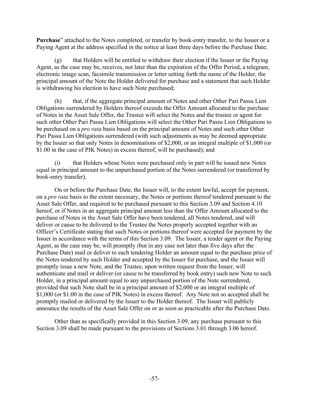 -57- Purchase” attached to the Notes completed, or transfer by book-entry transfer, to the Issuer or a Paying Agent at the address specified in the notice at least three days before the Purchase Date; (g) that Holders will be entitled to withdraw their election if the Issuer or the Paying Agent, as the case may be, receives, not later than the expiration of the Offer Period, a telegram, electronic image scan, facsimile transmission or letter setting forth the name of the Holder, the principal amount of the Note the Holder delivered for purchase and a statement that such Holder is withdrawing his election to have such Note purchased; (h) that, if the aggregate principal amount of Notes and other Other Pari Passu Lien Obligations surrendered by Holders thereof exceeds the Offer Amount allocated to the purchase of Notes in the Asset Sale Offer, the Trustee will select the Notes and the trustee or agent for such other Other Pari Passu Lien Obligations will select the Other Pari Passu Lien Obligations to be purchased on a pro rata basis based on the principal amount of Notes and such other Other Pari Passu Lien Obligations surrendered (with such adjustments as may be deemed appropriate by the Issuer so that only Notes in denominations of $2,000, or an integral multiple of $1,000 (or $1.00 in the case of PIK Notes) in excess thereof, will be purchased); and (i) that Holders whose Notes were purchased only in part will be issued new Notes equal in principal amount to the unpurchased portion of the Notes surrendered (or transferred by book-entry transfer). On or before the Purchase Date, the Issuer will, to the extent lawful, accept for payment, on a pro rata basis to the extent necessary, the Notes or portions thereof tendered pursuant to the Asset Sale Offer, and required to be purchased pursuant to this Section 3.09 and Section 4.10 hereof, or if Notes in an aggregate principal amount less than the Offer Amount allocated to the purchase of Notes in the Asset Sale Offer have been tendered, all Notes tendered, and will deliver or cause to be delivered to the Trustee the Notes properly accepted together with an Officer’s Certificate stating that such Notes or portions thereof were accepted for payment by the Issuer in accordance with the terms of this Section 3.09. The Issuer, a tender agent or the Paying Agent, as the case may be, will promptly (but in any case not later than five days after the Purchase Date) mail or deliver to each tendering Holder an amount equal to the purchase price of the Notes tendered by such Holder and accepted by the Issuer for purchase, and the Issuer will promptly issue a new Note, and the Trustee, upon written request from the Issuer, will authenticate and mail or deliver (or cause to be transferred by book entry) such new Note to such Holder, in a principal amount equal to any unpurchased portion of the Note surrendered, provided that such Note shall be in a principal amount of $2,000 or an integral multiple of $1,000 (or $1.00 in the case of PIK Notes) in excess thereof. Any Note not so accepted shall be promptly mailed or delivered by the Issuer to the Holder thereof. The Issuer will publicly announce the results of the Asset Sale Offer on or as soon as practicable after the Purchase Date. Other than as specifically provided in this Section 3.09, any purchase pursuant to this Section 3.09 shall be made pursuant to the provisions of Sections 3.01 through 3.06 hereof.