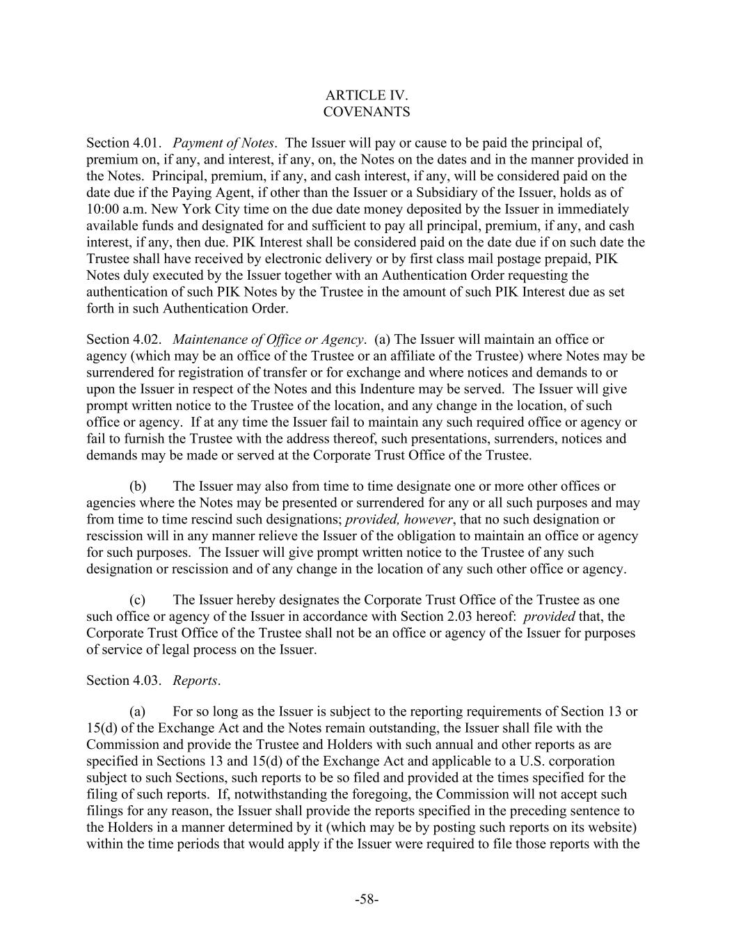 -58- ARTICLE IV. COVENANTS Section 4.01. Payment of Notes. The Issuer will pay or cause to be paid the principal of, premium on, if any, and interest, if any, on, the Notes on the dates and in the manner provided in the Notes. Principal, premium, if any, and cash interest, if any, will be considered paid on the date due if the Paying Agent, if other than the Issuer or a Subsidiary of the Issuer, holds as of 10:00 a.m. New York City time on the due date money deposited by the Issuer in immediately available funds and designated for and sufficient to pay all principal, premium, if any, and cash interest, if any, then due. PIK Interest shall be considered paid on the date due if on such date the Trustee shall have received by electronic delivery or by first class mail postage prepaid, PIK Notes duly executed by the Issuer together with an Authentication Order requesting the authentication of such PIK Notes by the Trustee in the amount of such PIK Interest due as set forth in such Authentication Order. Section 4.02. Maintenance of Office or Agency. (a) The Issuer will maintain an office or agency (which may be an office of the Trustee or an affiliate of the Trustee) where Notes may be surrendered for registration of transfer or for exchange and where notices and demands to or upon the Issuer in respect of the Notes and this Indenture may be served. The Issuer will give prompt written notice to the Trustee of the location, and any change in the location, of such office or agency. If at any time the Issuer fail to maintain any such required office or agency or fail to furnish the Trustee with the address thereof, such presentations, surrenders, notices and demands may be made or served at the Corporate Trust Office of the Trustee. (b) The Issuer may also from time to time designate one or more other offices or agencies where the Notes may be presented or surrendered for any or all such purposes and may from time to time rescind such designations; provided, however, that no such designation or rescission will in any manner relieve the Issuer of the obligation to maintain an office or agency for such purposes. The Issuer will give prompt written notice to the Trustee of any such designation or rescission and of any change in the location of any such other office or agency. (c) The Issuer hereby designates the Corporate Trust Office of the Trustee as one such office or agency of the Issuer in accordance with Section 2.03 hereof: provided that, the Corporate Trust Office of the Trustee shall not be an office or agency of the Issuer for purposes of service of legal process on the Issuer. Section 4.03. Reports. (a) For so long as the Issuer is subject to the reporting requirements of Section 13 or 15(d) of the Exchange Act and the Notes remain outstanding, the Issuer shall file with the Commission and provide the Trustee and Holders with such annual and other reports as are specified in Sections 13 and 15(d) of the Exchange Act and applicable to a U.S. corporation subject to such Sections, such reports to be so filed and provided at the times specified for the filing of such reports. If, notwithstanding the foregoing, the Commission will not accept such filings for any reason, the Issuer shall provide the reports specified in the preceding sentence to the Holders in a manner determined by it (which may be by posting such reports on its website) within the time periods that would apply if the Issuer were required to file those reports with the