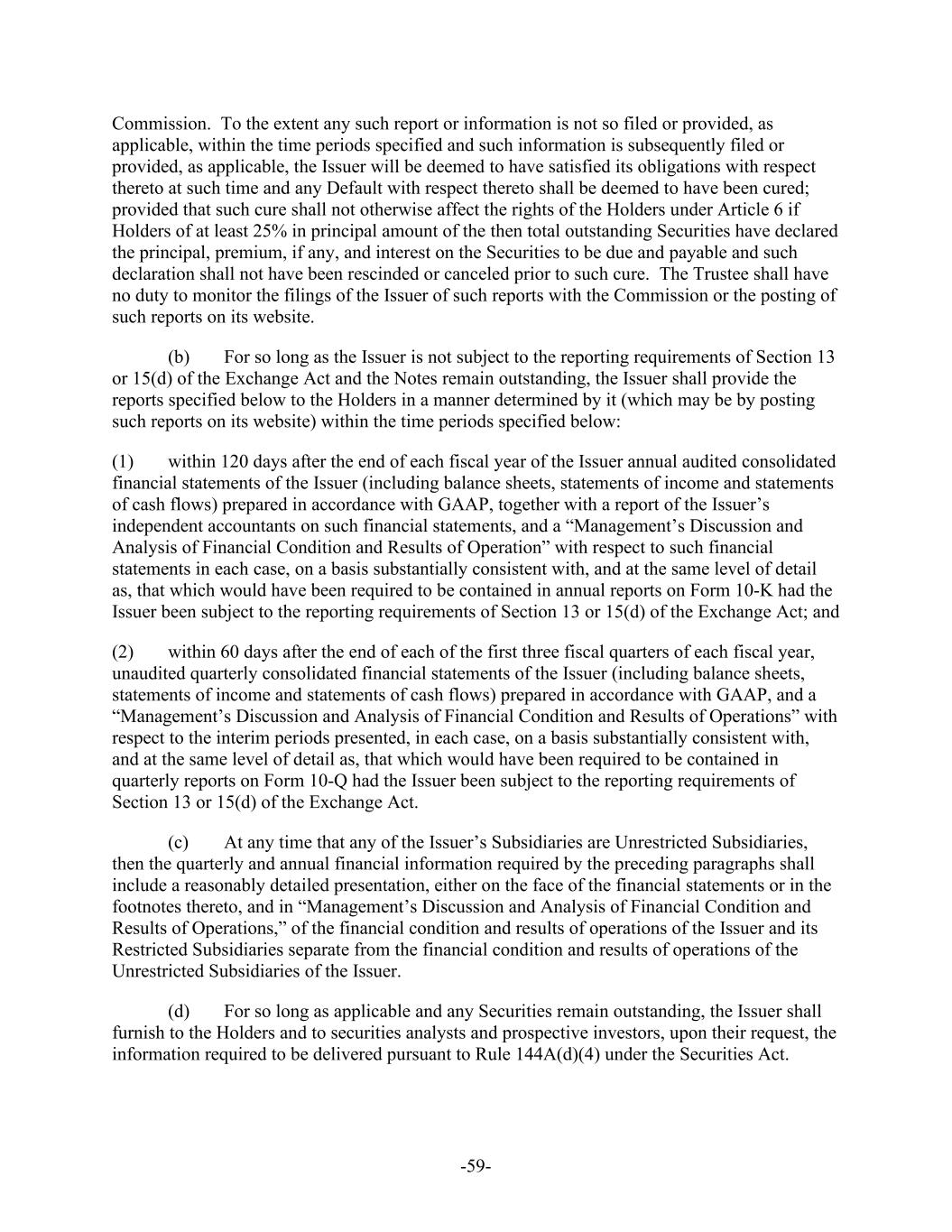-59- Commission. To the extent any such report or information is not so filed or provided, as applicable, within the time periods specified and such information is subsequently filed or provided, as applicable, the Issuer will be deemed to have satisfied its obligations with respect thereto at such time and any Default with respect thereto shall be deemed to have been cured; provided that such cure shall not otherwise affect the rights of the Holders under Article 6 if Holders of at least 25% in principal amount of the then total outstanding Securities have declared the principal, premium, if any, and interest on the Securities to be due and payable and such declaration shall not have been rescinded or canceled prior to such cure. The Trustee shall have no duty to monitor the filings of the Issuer of such reports with the Commission or the posting of such reports on its website. (b) For so long as the Issuer is not subject to the reporting requirements of Section 13 or 15(d) of the Exchange Act and the Notes remain outstanding, the Issuer shall provide the reports specified below to the Holders in a manner determined by it (which may be by posting such reports on its website) within the time periods specified below: (1) within 120 days after the end of each fiscal year of the Issuer annual audited consolidated financial statements of the Issuer (including balance sheets, statements of income and statements of cash flows) prepared in accordance with GAAP, together with a report of the Issuer’s independent accountants on such financial statements, and a “Management’s Discussion and Analysis of Financial Condition and Results of Operation” with respect to such financial statements in each case, on a basis substantially consistent with, and at the same level of detail as, that which would have been required to be contained in annual reports on Form 10-K had the Issuer been subject to the reporting requirements of Section 13 or 15(d) of the Exchange Act; and (2) within 60 days after the end of each of the first three fiscal quarters of each fiscal year, unaudited quarterly consolidated financial statements of the Issuer (including balance sheets, statements of income and statements of cash flows) prepared in accordance with GAAP, and a “Management’s Discussion and Analysis of Financial Condition and Results of Operations” with respect to the interim periods presented, in each case, on a basis substantially consistent with, and at the same level of detail as, that which would have been required to be contained in quarterly reports on Form 10-Q had the Issuer been subject to the reporting requirements of Section 13 or 15(d) of the Exchange Act. (c) At any time that any of the Issuer’s Subsidiaries are Unrestricted Subsidiaries, then the quarterly and annual financial information required by the preceding paragraphs shall include a reasonably detailed presentation, either on the face of the financial statements or in the footnotes thereto, and in “Management’s Discussion and Analysis of Financial Condition and Results of Operations,” of the financial condition and results of operations of the Issuer and its Restricted Subsidiaries separate from the financial condition and results of operations of the Unrestricted Subsidiaries of the Issuer. (d) For so long as applicable and any Securities remain outstanding, the Issuer shall furnish to the Holders and to securities analysts and prospective investors, upon their request, the information required to be delivered pursuant to Rule 144A(d)(4) under the Securities Act.