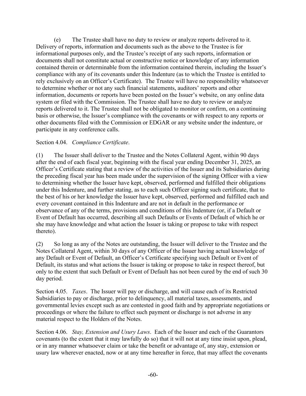 -60- (e) The Trustee shall have no duty to review or analyze reports delivered to it. Delivery of reports, information and documents such as the above to the Trustee is for informational purposes only, and the Trustee’s receipt of any such reports, information or documents shall not constitute actual or constructive notice or knowledge of any information contained therein or determinable from the information contained therein, including the Issuer’s compliance with any of its covenants under this Indenture (as to which the Trustee is entitled to rely exclusively on an Officer’s Certificate). The Trustee will have no responsibility whatsoever to determine whether or not any such financial statements, auditors’ reports and other information, documents or reports have been posted on the Issuer’s website, on any online data system or filed with the Commission. The Trustee shall have no duty to review or analyze reports delivered to it. The Trustee shall not be obligated to monitor or confirm, on a continuing basis or otherwise, the Issuer’s compliance with the covenants or with respect to any reports or other documents filed with the Commission or EDGAR or any website under the indenture, or participate in any conference calls. Section 4.04. Compliance Certificate. (1) The Issuer shall deliver to the Trustee and the Notes Collateral Agent, within 90 days after the end of each fiscal year, beginning with the fiscal year ending December 31, 2025, an Officer’s Certificate stating that a review of the activities of the Issuer and its Subsidiaries during the preceding fiscal year has been made under the supervision of the signing Officer with a view to determining whether the Issuer have kept, observed, performed and fulfilled their obligations under this Indenture, and further stating, as to each such Officer signing such certificate, that to the best of his or her knowledge the Issuer have kept, observed, performed and fulfilled each and every covenant contained in this Indenture and are not in default in the performance or observance of any of the terms, provisions and conditions of this Indenture (or, if a Default or Event of Default has occurred, describing all such Defaults or Events of Default of which he or she may have knowledge and what action the Issuer is taking or propose to take with respect thereto). (2) So long as any of the Notes are outstanding, the Issuer will deliver to the Trustee and the Notes Collateral Agent, within 30 days of any Officer of the Issuer having actual knowledge of any Default or Event of Default, an Officer’s Certificate specifying such Default or Event of Default, its status and what actions the Issuer is taking or propose to take in respect thereof, but only to the extent that such Default or Event of Default has not been cured by the end of such 30 day period. Section 4.05. Taxes. The Issuer will pay or discharge, and will cause each of its Restricted Subsidiaries to pay or discharge, prior to delinquency, all material taxes, assessments, and governmental levies except such as are contested in good faith and by appropriate negotiations or proceedings or where the failure to effect such payment or discharge is not adverse in any material respect to the Holders of the Notes. Section 4.06. Stay, Extension and Usury Laws. Each of the Issuer and each of the Guarantors covenants (to the extent that it may lawfully do so) that it will not at any time insist upon, plead, or in any manner whatsoever claim or take the benefit or advantage of, any stay, extension or usury law wherever enacted, now or at any time hereafter in force, that may affect the covenants