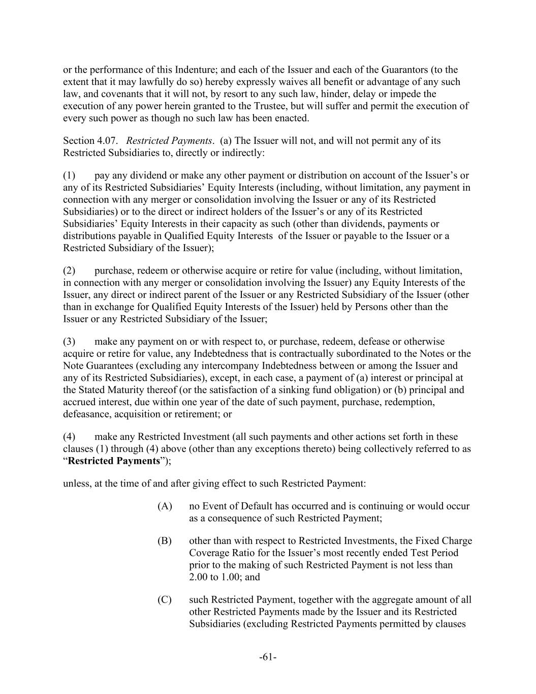 -61- or the performance of this Indenture; and each of the Issuer and each of the Guarantors (to the extent that it may lawfully do so) hereby expressly waives all benefit or advantage of any such law, and covenants that it will not, by resort to any such law, hinder, delay or impede the execution of any power herein granted to the Trustee, but will suffer and permit the execution of every such power as though no such law has been enacted. Section 4.07. Restricted Payments. (a) The Issuer will not, and will not permit any of its Restricted Subsidiaries to, directly or indirectly: (1) pay any dividend or make any other payment or distribution on account of the Issuer’s or any of its Restricted Subsidiaries’ Equity Interests (including, without limitation, any payment in connection with any merger or consolidation involving the Issuer or any of its Restricted Subsidiaries) or to the direct or indirect holders of the Issuer’s or any of its Restricted Subsidiaries’ Equity Interests in their capacity as such (other than dividends, payments or distributions payable in Qualified Equity Interests of the Issuer or payable to the Issuer or a Restricted Subsidiary of the Issuer); (2) purchase, redeem or otherwise acquire or retire for value (including, without limitation, in connection with any merger or consolidation involving the Issuer) any Equity Interests of the Issuer, any direct or indirect parent of the Issuer or any Restricted Subsidiary of the Issuer (other than in exchange for Qualified Equity Interests of the Issuer) held by Persons other than the Issuer or any Restricted Subsidiary of the Issuer; (3) make any payment on or with respect to, or purchase, redeem, defease or otherwise acquire or retire for value, any Indebtedness that is contractually subordinated to the Notes or the Note Guarantees (excluding any intercompany Indebtedness between or among the Issuer and any of its Restricted Subsidiaries), except, in each case, a payment of (a) interest or principal at the Stated Maturity thereof (or the satisfaction of a sinking fund obligation) or (b) principal and accrued interest, due within one year of the date of such payment, purchase, redemption, defeasance, acquisition or retirement; or (4) make any Restricted Investment (all such payments and other actions set forth in these clauses (1) through (4) above (other than any exceptions thereto) being collectively referred to as “Restricted Payments”); unless, at the time of and after giving effect to such Restricted Payment: (A) no Event of Default has occurred and is continuing or would occur as a consequence of such Restricted Payment; (B) other than with respect to Restricted Investments, the Fixed Charge Coverage Ratio for the Issuer’s most recently ended Test Period prior to the making of such Restricted Payment is not less than 2.00 to 1.00; and (C) such Restricted Payment, together with the aggregate amount of all other Restricted Payments made by the Issuer and its Restricted Subsidiaries (excluding Restricted Payments permitted by clauses