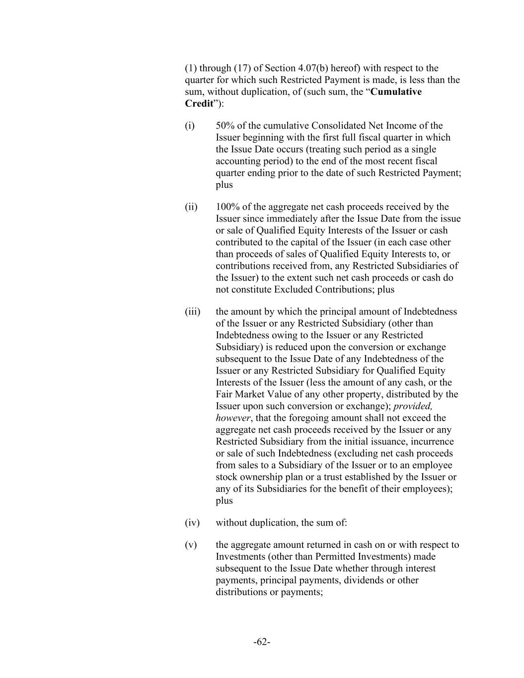 -62- (1) through (17) of Section 4.07(b) hereof) with respect to the quarter for which such Restricted Payment is made, is less than the sum, without duplication, of (such sum, the “Cumulative Credit”): (i) 50% of the cumulative Consolidated Net Income of the Issuer beginning with the first full fiscal quarter in which the Issue Date occurs (treating such period as a single accounting period) to the end of the most recent fiscal quarter ending prior to the date of such Restricted Payment; plus (ii) 100% of the aggregate net cash proceeds received by the Issuer since immediately after the Issue Date from the issue or sale of Qualified Equity Interests of the Issuer or cash contributed to the capital of the Issuer (in each case other than proceeds of sales of Qualified Equity Interests to, or contributions received from, any Restricted Subsidiaries of the Issuer) to the extent such net cash proceeds or cash do not constitute Excluded Contributions; plus (iii) the amount by which the principal amount of Indebtedness of the Issuer or any Restricted Subsidiary (other than Indebtedness owing to the Issuer or any Restricted Subsidiary) is reduced upon the conversion or exchange subsequent to the Issue Date of any Indebtedness of the Issuer or any Restricted Subsidiary for Qualified Equity Interests of the Issuer (less the amount of any cash, or the Fair Market Value of any other property, distributed by the Issuer upon such conversion or exchange); provided, however, that the foregoing amount shall not exceed the aggregate net cash proceeds received by the Issuer or any Restricted Subsidiary from the initial issuance, incurrence or sale of such Indebtedness (excluding net cash proceeds from sales to a Subsidiary of the Issuer or to an employee stock ownership plan or a trust established by the Issuer or any of its Subsidiaries for the benefit of their employees); plus (iv) without duplication, the sum of: (v) the aggregate amount returned in cash on or with respect to Investments (other than Permitted Investments) made subsequent to the Issue Date whether through interest payments, principal payments, dividends or other distributions or payments;