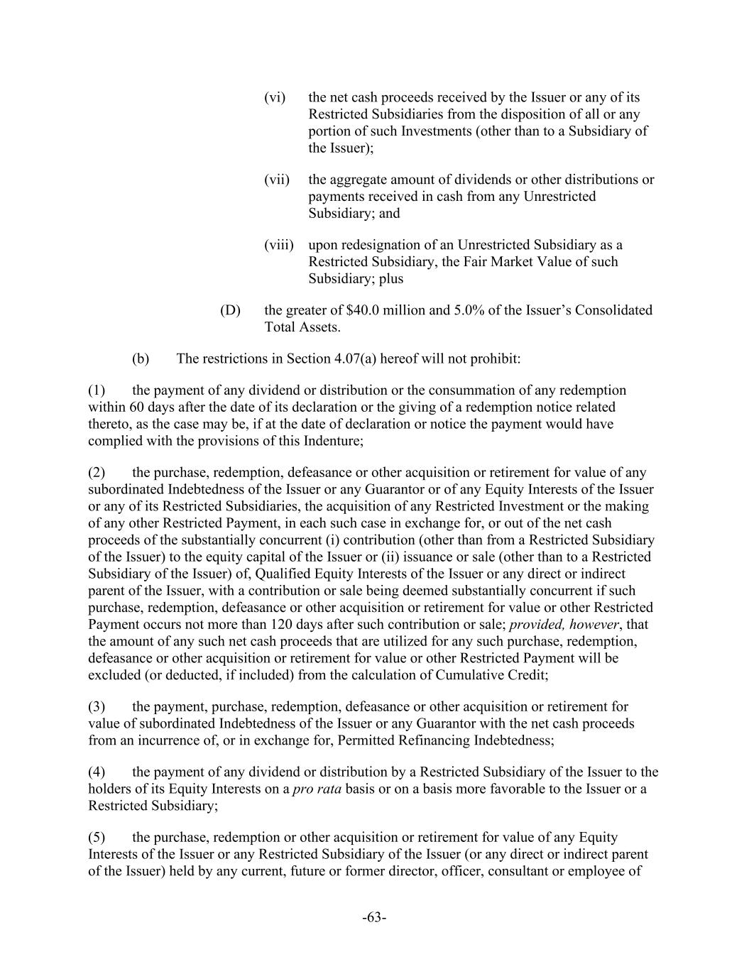 -63- (vi) the net cash proceeds received by the Issuer or any of its Restricted Subsidiaries from the disposition of all or any portion of such Investments (other than to a Subsidiary of the Issuer); (vii) the aggregate amount of dividends or other distributions or payments received in cash from any Unrestricted Subsidiary; and (viii) upon redesignation of an Unrestricted Subsidiary as a Restricted Subsidiary, the Fair Market Value of such Subsidiary; plus (D) the greater of $40.0 million and 5.0% of the Issuer’s Consolidated Total Assets. (b) The restrictions in Section 4.07(a) hereof will not prohibit: (1) the payment of any dividend or distribution or the consummation of any redemption within 60 days after the date of its declaration or the giving of a redemption notice related thereto, as the case may be, if at the date of declaration or notice the payment would have complied with the provisions of this Indenture; (2) the purchase, redemption, defeasance or other acquisition or retirement for value of any subordinated Indebtedness of the Issuer or any Guarantor or of any Equity Interests of the Issuer or any of its Restricted Subsidiaries, the acquisition of any Restricted Investment or the making of any other Restricted Payment, in each such case in exchange for, or out of the net cash proceeds of the substantially concurrent (i) contribution (other than from a Restricted Subsidiary of the Issuer) to the equity capital of the Issuer or (ii) issuance or sale (other than to a Restricted Subsidiary of the Issuer) of, Qualified Equity Interests of the Issuer or any direct or indirect parent of the Issuer, with a contribution or sale being deemed substantially concurrent if such purchase, redemption, defeasance or other acquisition or retirement for value or other Restricted Payment occurs not more than 120 days after such contribution or sale; provided, however, that the amount of any such net cash proceeds that are utilized for any such purchase, redemption, defeasance or other acquisition or retirement for value or other Restricted Payment will be excluded (or deducted, if included) from the calculation of Cumulative Credit; (3) the payment, purchase, redemption, defeasance or other acquisition or retirement for value of subordinated Indebtedness of the Issuer or any Guarantor with the net cash proceeds from an incurrence of, or in exchange for, Permitted Refinancing Indebtedness; (4) the payment of any dividend or distribution by a Restricted Subsidiary of the Issuer to the holders of its Equity Interests on a pro rata basis or on a basis more favorable to the Issuer or a Restricted Subsidiary; (5) the purchase, redemption or other acquisition or retirement for value of any Equity Interests of the Issuer or any Restricted Subsidiary of the Issuer (or any direct or indirect parent of the Issuer) held by any current, future or former director, officer, consultant or employee of