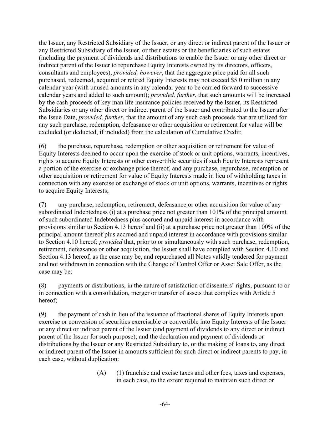 -64- the Issuer, any Restricted Subsidiary of the Issuer, or any direct or indirect parent of the Issuer or any Restricted Subsidiary of the Issuer, or their estates or the beneficiaries of such estates (including the payment of dividends and distributions to enable the Issuer or any other direct or indirect parent of the Issuer to repurchase Equity Interests owned by its directors, officers, consultants and employees), provided, however, that the aggregate price paid for all such purchased, redeemed, acquired or retired Equity Interests may not exceed $5.0 million in any calendar year (with unused amounts in any calendar year to be carried forward to successive calendar years and added to such amount); provided, further, that such amounts will be increased by the cash proceeds of key man life insurance policies received by the Issuer, its Restricted Subsidiaries or any other direct or indirect parent of the Issuer and contributed to the Issuer after the Issue Date, provided, further, that the amount of any such cash proceeds that are utilized for any such purchase, redemption, defeasance or other acquisition or retirement for value will be excluded (or deducted, if included) from the calculation of Cumulative Credit; (6) the purchase, repurchase, redemption or other acquisition or retirement for value of Equity Interests deemed to occur upon the exercise of stock or unit options, warrants, incentives, rights to acquire Equity Interests or other convertible securities if such Equity Interests represent a portion of the exercise or exchange price thereof, and any purchase, repurchase, redemption or other acquisition or retirement for value of Equity Interests made in lieu of withholding taxes in connection with any exercise or exchange of stock or unit options, warrants, incentives or rights to acquire Equity Interests; (7) any purchase, redemption, retirement, defeasance or other acquisition for value of any subordinated Indebtedness (i) at a purchase price not greater than 101% of the principal amount of such subordinated Indebtedness plus accrued and unpaid interest in accordance with provisions similar to Section 4.13 hereof and (ii) at a purchase price not greater than 100% of the principal amount thereof plus accrued and unpaid interest in accordance with provisions similar to Section 4.10 hereof; provided that, prior to or simultaneously with such purchase, redemption, retirement, defeasance or other acquisition, the Issuer shall have complied with Section 4.10 and Section 4.13 hereof, as the case may be, and repurchased all Notes validly tendered for payment and not withdrawn in connection with the Change of Control Offer or Asset Sale Offer, as the case may be; (8) payments or distributions, in the nature of satisfaction of dissenters’ rights, pursuant to or in connection with a consolidation, merger or transfer of assets that complies with Article 5 hereof; (9) the payment of cash in lieu of the issuance of fractional shares of Equity Interests upon exercise or conversion of securities exercisable or convertible into Equity Interests of the Issuer or any direct or indirect parent of the Issuer (and payment of dividends to any direct or indirect parent of the Issuer for such purpose); and the declaration and payment of dividends or distributions by the Issuer or any Restricted Subsidiary to, or the making of loans to, any direct or indirect parent of the Issuer in amounts sufficient for such direct or indirect parents to pay, in each case, without duplication: (A) (1) franchise and excise taxes and other fees, taxes and expenses, in each case, to the extent required to maintain such direct or