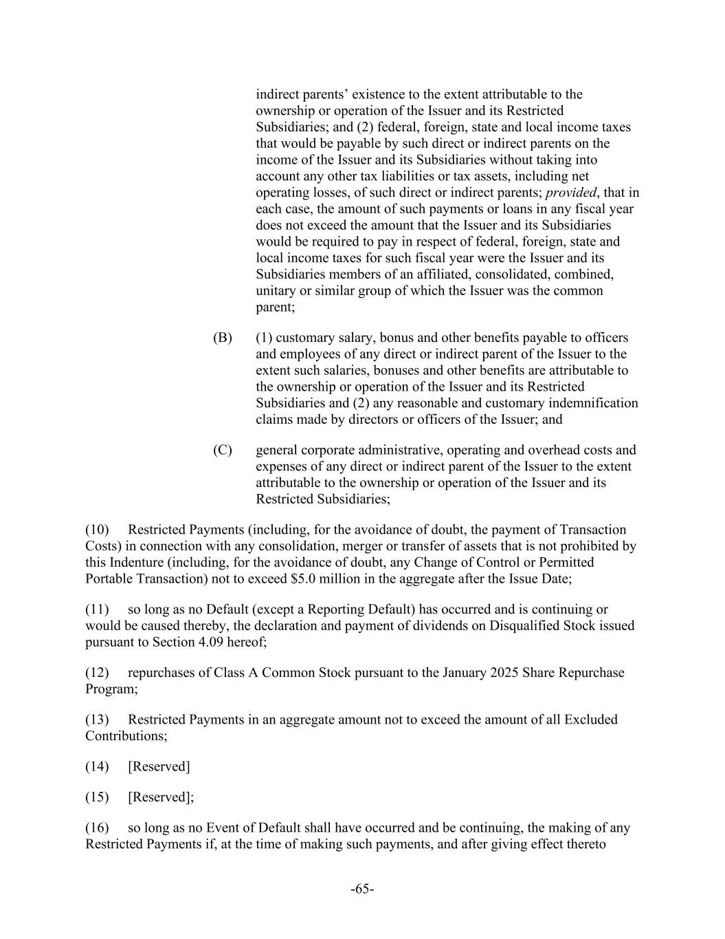 -65- indirect parents’ existence to the extent attributable to the ownership or operation of the Issuer and its Restricted Subsidiaries; and (2) federal, foreign, state and local income taxes that would be payable by such direct or indirect parents on the income of the Issuer and its Subsidiaries without taking into account any other tax liabilities or tax assets, including net operating losses, of such direct or indirect parents; provided, that in each case, the amount of such payments or loans in any fiscal year does not exceed the amount that the Issuer and its Subsidiaries would be required to pay in respect of federal, foreign, state and local income taxes for such fiscal year were the Issuer and its Subsidiaries members of an affiliated, consolidated, combined, unitary or similar group of which the Issuer was the common parent; (B) (1) customary salary, bonus and other benefits payable to officers and employees of any direct or indirect parent of the Issuer to the extent such salaries, bonuses and other benefits are attributable to the ownership or operation of the Issuer and its Restricted Subsidiaries and (2) any reasonable and customary indemnification claims made by directors or officers of the Issuer; and (C) general corporate administrative, operating and overhead costs and expenses of any direct or indirect parent of the Issuer to the extent attributable to the ownership or operation of the Issuer and its Restricted Subsidiaries; (10) Restricted Payments (including, for the avoidance of doubt, the payment of Transaction Costs) in connection with any consolidation, merger or transfer of assets that is not prohibited by this Indenture (including, for the avoidance of doubt, any Change of Control or Permitted Portable Transaction) not to exceed $5.0 million in the aggregate after the Issue Date; (11) so long as no Default (except a Reporting Default) has occurred and is continuing or would be caused thereby, the declaration and payment of dividends on Disqualified Stock issued pursuant to Section 4.09 hereof; (12) repurchases of Class A Common Stock pursuant to the January 2025 Share Repurchase Program; (13) Restricted Payments in an aggregate amount not to exceed the amount of all Excluded Contributions; (14) [Reserved] (15) [Reserved]; (16) so long as no Event of Default shall have occurred and be continuing, the making of any Restricted Payments if, at the time of making such payments, and after giving effect thereto