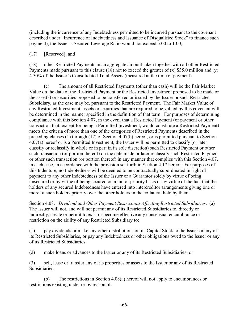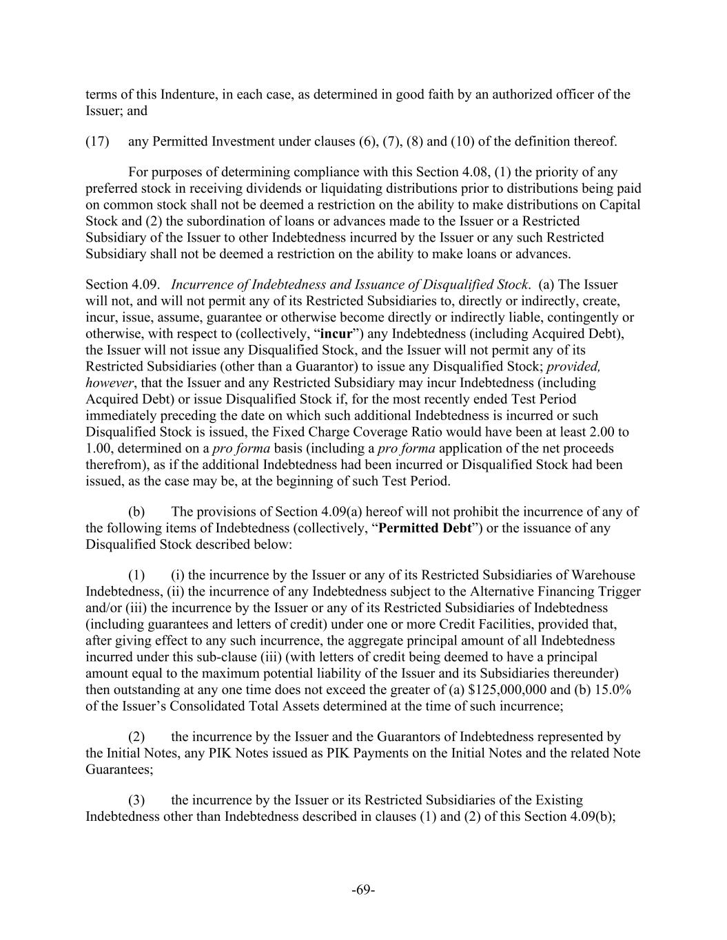 -69- terms of this Indenture, in each case, as determined in good faith by an authorized officer of the Issuer; and (17) any Permitted Investment under clauses (6), (7), (8) and (10) of the definition thereof. For purposes of determining compliance with this Section 4.08, (1) the priority of any preferred stock in receiving dividends or liquidating distributions prior to distributions being paid on common stock shall not be deemed a restriction on the ability to make distributions on Capital Stock and (2) the subordination of loans or advances made to the Issuer or a Restricted Subsidiary of the Issuer to other Indebtedness incurred by the Issuer or any such Restricted Subsidiary shall not be deemed a restriction on the ability to make loans or advances. Section 4.09. Incurrence of Indebtedness and Issuance of Disqualified Stock. (a) The Issuer will not, and will not permit any of its Restricted Subsidiaries to, directly or indirectly, create, incur, issue, assume, guarantee or otherwise become directly or indirectly liable, contingently or otherwise, with respect to (collectively, “incur”) any Indebtedness (including Acquired Debt), the Issuer will not issue any Disqualified Stock, and the Issuer will not permit any of its Restricted Subsidiaries (other than a Guarantor) to issue any Disqualified Stock; provided, however, that the Issuer and any Restricted Subsidiary may incur Indebtedness (including Acquired Debt) or issue Disqualified Stock if, for the most recently ended Test Period immediately preceding the date on which such additional Indebtedness is incurred or such Disqualified Stock is issued, the Fixed Charge Coverage Ratio would have been at least 2.00 to 1.00, determined on a pro forma basis (including a pro forma application of the net proceeds therefrom), as if the additional Indebtedness had been incurred or Disqualified Stock had been issued, as the case may be, at the beginning of such Test Period. (b) The provisions of Section 4.09(a) hereof will not prohibit the incurrence of any of the following items of Indebtedness (collectively, “Permitted Debt”) or the issuance of any Disqualified Stock described below: (1) (i) the incurrence by the Issuer or any of its Restricted Subsidiaries of Warehouse Indebtedness, (ii) the incurrence of any Indebtedness subject to the Alternative Financing Trigger and/or (iii) the incurrence by the Issuer or any of its Restricted Subsidiaries of Indebtedness (including guarantees and letters of credit) under one or more Credit Facilities, provided that, after giving effect to any such incurrence, the aggregate principal amount of all Indebtedness incurred under this sub-clause (iii) (with letters of credit being deemed to have a principal amount equal to the maximum potential liability of the Issuer and its Subsidiaries thereunder) then outstanding at any one time does not exceed the greater of (a) $125,000,000 and (b) 15.0% of the Issuer’s Consolidated Total Assets determined at the time of such incurrence; (2) the incurrence by the Issuer and the Guarantors of Indebtedness represented by the Initial Notes, any PIK Notes issued as PIK Payments on the Initial Notes and the related Note Guarantees; (3) the incurrence by the Issuer or its Restricted Subsidiaries of the Existing Indebtedness other than Indebtedness described in clauses (1) and (2) of this Section 4.09(b);
