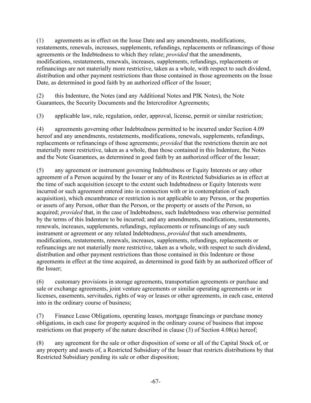 -67- (1) agreements as in effect on the Issue Date and any amendments, modifications, restatements, renewals, increases, supplements, refundings, replacements or refinancings of those agreements or the Indebtedness to which they relate; provided that the amendments, modifications, restatements, renewals, increases, supplements, refundings, replacements or refinancings are not materially more restrictive, taken as a whole, with respect to such dividend, distribution and other payment restrictions than those contained in those agreements on the Issue Date, as determined in good faith by an authorized officer of the Issuer; (2) this Indenture, the Notes (and any Additional Notes and PIK Notes), the Note Guarantees, the Security Documents and the Intercreditor Agreements; (3) applicable law, rule, regulation, order, approval, license, permit or similar restriction; (4) agreements governing other Indebtedness permitted to be incurred under Section 4.09 hereof and any amendments, restatements, modifications, renewals, supplements, refundings, replacements or refinancings of those agreements; provided that the restrictions therein are not materially more restrictive, taken as a whole, than those contained in this Indenture, the Notes and the Note Guarantees, as determined in good faith by an authorized officer of the Issuer; (5) any agreement or instrument governing Indebtedness or Equity Interests or any other agreement of a Person acquired by the Issuer or any of its Restricted Subsidiaries as in effect at the time of such acquisition (except to the extent such Indebtedness or Equity Interests were incurred or such agreement entered into in connection with or in contemplation of such acquisition), which encumbrance or restriction is not applicable to any Person, or the properties or assets of any Person, other than the Person, or the property or assets of the Person, so acquired; provided that, in the case of Indebtedness, such Indebtedness was otherwise permitted by the terms of this Indenture to be incurred; and any amendments, modifications, restatements, renewals, increases, supplements, refundings, replacements or refinancings of any such instrument or agreement or any related Indebtedness, provided that such amendments, modifications, restatements, renewals, increases, supplements, refundings, replacements or refinancings are not materially more restrictive, taken as a whole, with respect to such dividend, distribution and other payment restrictions than those contained in this Indenture or those agreements in effect at the time acquired, as determined in good faith by an authorized officer of the Issuer; (6) customary provisions in storage agreements, transportation agreements or purchase and sale or exchange agreements, joint venture agreements or similar operating agreements or in licenses, easements, servitudes, rights of way or leases or other agreements, in each case, entered into in the ordinary course of business; (7) Finance Lease Obligations, operating leases, mortgage financings or purchase money obligations, in each case for property acquired in the ordinary course of business that impose restrictions on that property of the nature described in clause (3) of Section 4.08(a) hereof; (8) any agreement for the sale or other disposition of some or all of the Capital Stock of, or any property and assets of, a Restricted Subsidiary of the Issuer that restricts distributions by that Restricted Subsidiary pending its sale or other disposition;