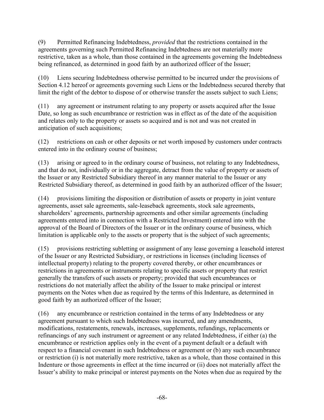 -68- (9) Permitted Refinancing Indebtedness, provided that the restrictions contained in the agreements governing such Permitted Refinancing Indebtedness are not materially more restrictive, taken as a whole, than those contained in the agreements governing the Indebtedness being refinanced, as determined in good faith by an authorized officer of the Issuer; (10) Liens securing Indebtedness otherwise permitted to be incurred under the provisions of Section 4.12 hereof or agreements governing such Liens or the Indebtedness secured thereby that limit the right of the debtor to dispose of or otherwise transfer the assets subject to such Liens; (11) any agreement or instrument relating to any property or assets acquired after the Issue Date, so long as such encumbrance or restriction was in effect as of the date of the acquisition and relates only to the property or assets so acquired and is not and was not created in anticipation of such acquisitions; (12) restrictions on cash or other deposits or net worth imposed by customers under contracts entered into in the ordinary course of business; (13) arising or agreed to in the ordinary course of business, not relating to any Indebtedness, and that do not, individually or in the aggregate, detract from the value of property or assets of the Issuer or any Restricted Subsidiary thereof in any manner material to the Issuer or any Restricted Subsidiary thereof, as determined in good faith by an authorized officer of the Issuer; (14) provisions limiting the disposition or distribution of assets or property in joint venture agreements, asset sale agreements, sale-leaseback agreements, stock sale agreements, shareholders’ agreements, partnership agreements and other similar agreements (including agreements entered into in connection with a Restricted Investment) entered into with the approval of the Board of Directors of the Issuer or in the ordinary course of business, which limitation is applicable only to the assets or property that is the subject of such agreements; (15) provisions restricting subletting or assignment of any lease governing a leasehold interest of the Issuer or any Restricted Subsidiary, or restrictions in licenses (including licenses of intellectual property) relating to the property covered thereby, or other encumbrances or restrictions in agreements or instruments relating to specific assets or property that restrict generally the transfers of such assets or property; provided that such encumbrances or restrictions do not materially affect the ability of the Issuer to make principal or interest payments on the Notes when due as required by the terms of this Indenture, as determined in good faith by an authorized officer of the Issuer; (16) any encumbrance or restriction contained in the terms of any Indebtedness or any agreement pursuant to which such Indebtedness was incurred, and any amendments, modifications, restatements, renewals, increases, supplements, refundings, replacements or refinancings of any such instrument or agreement or any related Indebtedness, if either (a) the encumbrance or restriction applies only in the event of a payment default or a default with respect to a financial covenant in such Indebtedness or agreement or (b) any such encumbrance or restriction (i) is not materially more restrictive, taken as a whole, than those contained in this Indenture or those agreements in effect at the time incurred or (ii) does not materially affect the Issuer’s ability to make principal or interest payments on the Notes when due as required by the