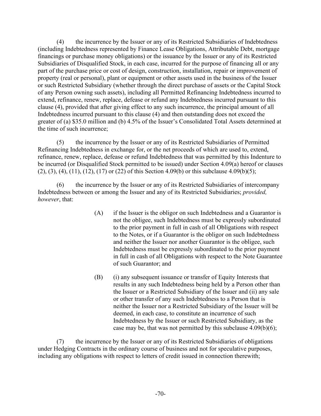 -70- (4) the incurrence by the Issuer or any of its Restricted Subsidiaries of Indebtedness (including Indebtedness represented by Finance Lease Obligations, Attributable Debt, mortgage financings or purchase money obligations) or the issuance by the Issuer or any of its Restricted Subsidiaries of Disqualified Stock, in each case, incurred for the purpose of financing all or any part of the purchase price or cost of design, construction, installation, repair or improvement of property (real or personal), plant or equipment or other assets used in the business of the Issuer or such Restricted Subsidiary (whether through the direct purchase of assets or the Capital Stock of any Person owning such assets), including all Permitted Refinancing Indebtedness incurred to extend, refinance, renew, replace, defease or refund any Indebtedness incurred pursuant to this clause (4), provided that after giving effect to any such incurrence, the principal amount of all Indebtedness incurred pursuant to this clause (4) and then outstanding does not exceed the greater of (a) $35.0 million and (b) 4.5% of the Issuer’s Consolidated Total Assets determined at the time of such incurrence; (5) the incurrence by the Issuer or any of its Restricted Subsidiaries of Permitted Refinancing Indebtedness in exchange for, or the net proceeds of which are used to, extend, refinance, renew, replace, defease or refund Indebtedness that was permitted by this Indenture to be incurred (or Disqualified Stock permitted to be issued) under Section 4.09(a) hereof or clauses (2), (3), (4), (11), (12), (17) or (22) of this Section 4.09(b) or this subclause 4.09(b)(5); (6) the incurrence by the Issuer or any of its Restricted Subsidiaries of intercompany Indebtedness between or among the Issuer and any of its Restricted Subsidiaries; provided, however, that: (A) if the Issuer is the obligor on such Indebtedness and a Guarantor is not the obligee, such Indebtedness must be expressly subordinated to the prior payment in full in cash of all Obligations with respect to the Notes, or if a Guarantor is the obligor on such Indebtedness and neither the Issuer nor another Guarantor is the obligee, such Indebtedness must be expressly subordinated to the prior payment in full in cash of all Obligations with respect to the Note Guarantee of such Guarantor; and (B) (i) any subsequent issuance or transfer of Equity Interests that results in any such Indebtedness being held by a Person other than the Issuer or a Restricted Subsidiary of the Issuer and (ii) any sale or other transfer of any such Indebtedness to a Person that is neither the Issuer nor a Restricted Subsidiary of the Issuer will be deemed, in each case, to constitute an incurrence of such Indebtedness by the Issuer or such Restricted Subsidiary, as the case may be, that was not permitted by this subclause 4.09(b)(6); (7) the incurrence by the Issuer or any of its Restricted Subsidiaries of obligations under Hedging Contracts in the ordinary course of business and not for speculative purposes, including any obligations with respect to letters of credit issued in connection therewith;