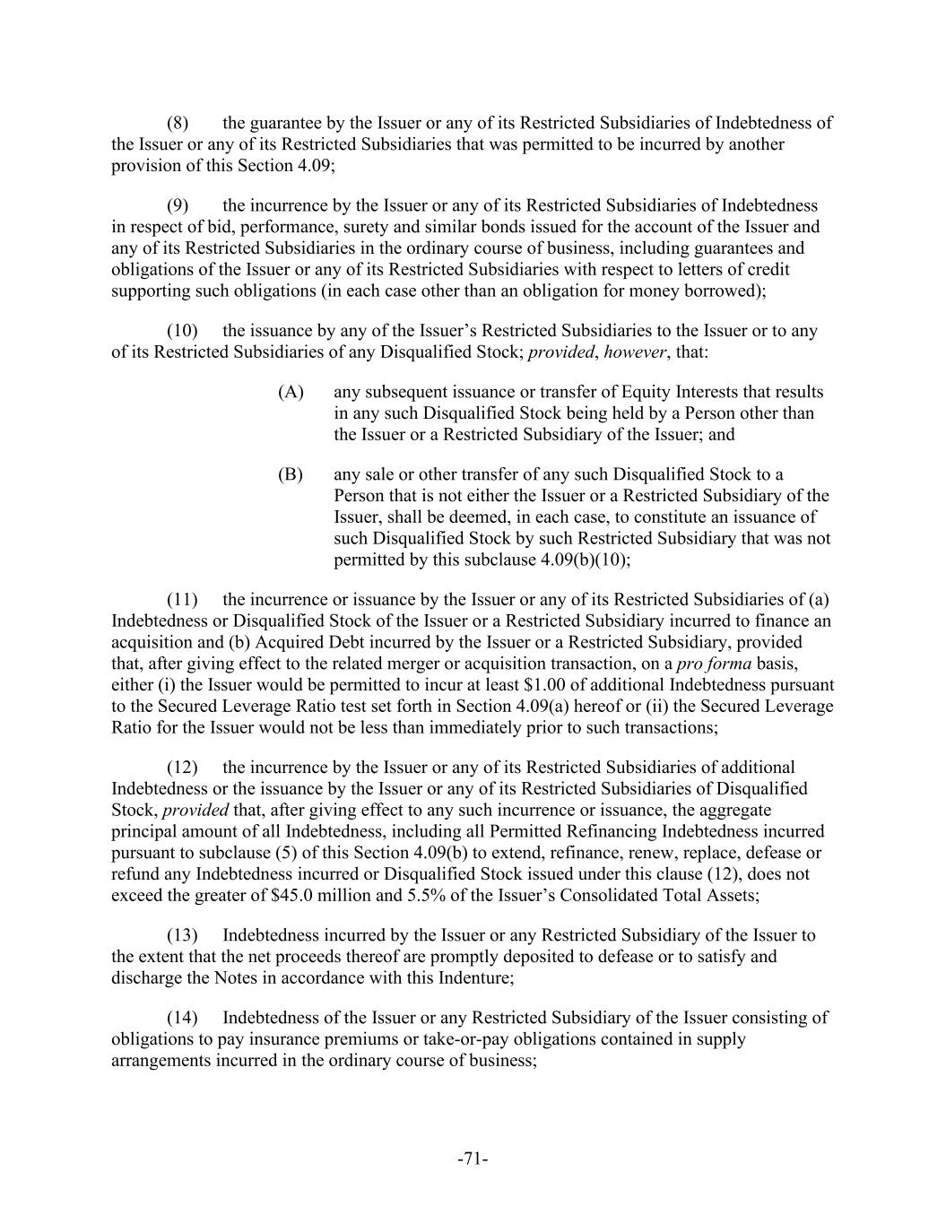 -71- (8) the guarantee by the Issuer or any of its Restricted Subsidiaries of Indebtedness of the Issuer or any of its Restricted Subsidiaries that was permitted to be incurred by another provision of this Section 4.09; (9) the incurrence by the Issuer or any of its Restricted Subsidiaries of Indebtedness in respect of bid, performance, surety and similar bonds issued for the account of the Issuer and any of its Restricted Subsidiaries in the ordinary course of business, including guarantees and obligations of the Issuer or any of its Restricted Subsidiaries with respect to letters of credit supporting such obligations (in each case other than an obligation for money borrowed); (10) the issuance by any of the Issuer’s Restricted Subsidiaries to the Issuer or to any of its Restricted Subsidiaries of any Disqualified Stock; provided, however, that: (A) any subsequent issuance or transfer of Equity Interests that results in any such Disqualified Stock being held by a Person other than the Issuer or a Restricted Subsidiary of the Issuer; and (B) any sale or other transfer of any such Disqualified Stock to a Person that is not either the Issuer or a Restricted Subsidiary of the Issuer, shall be deemed, in each case, to constitute an issuance of such Disqualified Stock by such Restricted Subsidiary that was not permitted by this subclause 4.09(b)(10); (11) the incurrence or issuance by the Issuer or any of its Restricted Subsidiaries of (a) Indebtedness or Disqualified Stock of the Issuer or a Restricted Subsidiary incurred to finance an acquisition and (b) Acquired Debt incurred by the Issuer or a Restricted Subsidiary, provided that, after giving effect to the related merger or acquisition transaction, on a pro forma basis, either (i) the Issuer would be permitted to incur at least $1.00 of additional Indebtedness pursuant to the Secured Leverage Ratio test set forth in Section 4.09(a) hereof or (ii) the Secured Leverage Ratio for the Issuer would not be less than immediately prior to such transactions; (12) the incurrence by the Issuer or any of its Restricted Subsidiaries of additional Indebtedness or the issuance by the Issuer or any of its Restricted Subsidiaries of Disqualified Stock, provided that, after giving effect to any such incurrence or issuance, the aggregate principal amount of all Indebtedness, including all Permitted Refinancing Indebtedness incurred pursuant to subclause (5) of this Section 4.09(b) to extend, refinance, renew, replace, defease or refund any Indebtedness incurred or Disqualified Stock issued under this clause (12), does not exceed the greater of $45.0 million and 5.5% of the Issuer’s Consolidated Total Assets; (13) Indebtedness incurred by the Issuer or any Restricted Subsidiary of the Issuer to the extent that the net proceeds thereof are promptly deposited to defease or to satisfy and discharge the Notes in accordance with this Indenture; (14) Indebtedness of the Issuer or any Restricted Subsidiary of the Issuer consisting of obligations to pay insurance premiums or take-or-pay obligations contained in supply arrangements incurred in the ordinary course of business;