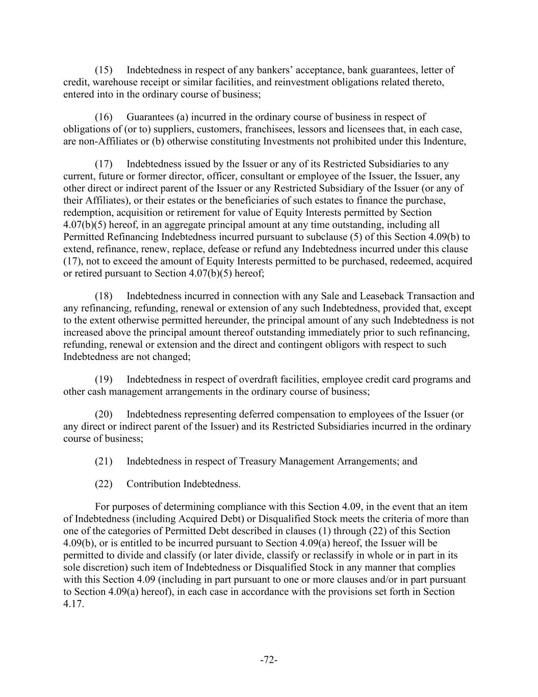 -72- (15) Indebtedness in respect of any bankers’ acceptance, bank guarantees, letter of credit, warehouse receipt or similar facilities, and reinvestment obligations related thereto, entered into in the ordinary course of business; (16) Guarantees (a) incurred in the ordinary course of business in respect of obligations of (or to) suppliers, customers, franchisees, lessors and licensees that, in each case, are non-Affiliates or (b) otherwise constituting Investments not prohibited under this Indenture, (17) Indebtedness issued by the Issuer or any of its Restricted Subsidiaries to any current, future or former director, officer, consultant or employee of the Issuer, the Issuer, any other direct or indirect parent of the Issuer or any Restricted Subsidiary of the Issuer (or any of their Affiliates), or their estates or the beneficiaries of such estates to finance the purchase, redemption, acquisition or retirement for value of Equity Interests permitted by Section 4.07(b)(5) hereof, in an aggregate principal amount at any time outstanding, including all Permitted Refinancing Indebtedness incurred pursuant to subclause (5) of this Section 4.09(b) to extend, refinance, renew, replace, defease or refund any Indebtedness incurred under this clause (17), not to exceed the amount of Equity Interests permitted to be purchased, redeemed, acquired or retired pursuant to Section 4.07(b)(5) hereof; (18) Indebtedness incurred in connection with any Sale and Leaseback Transaction and any refinancing, refunding, renewal or extension of any such Indebtedness, provided that, except to the extent otherwise permitted hereunder, the principal amount of any such Indebtedness is not increased above the principal amount thereof outstanding immediately prior to such refinancing, refunding, renewal or extension and the direct and contingent obligors with respect to such Indebtedness are not changed; (19) Indebtedness in respect of overdraft facilities, employee credit card programs and other cash management arrangements in the ordinary course of business; (20) Indebtedness representing deferred compensation to employees of the Issuer (or any direct or indirect parent of the Issuer) and its Restricted Subsidiaries incurred in the ordinary course of business; (21) Indebtedness in respect of Treasury Management Arrangements; and (22) Contribution Indebtedness. For purposes of determining compliance with this Section 4.09, in the event that an item of Indebtedness (including Acquired Debt) or Disqualified Stock meets the criteria of more than one of the categories of Permitted Debt described in clauses (1) through (22) of this Section 4.09(b), or is entitled to be incurred pursuant to Section 4.09(a) hereof, the Issuer will be permitted to divide and classify (or later divide, classify or reclassify in whole or in part in its sole discretion) such item of Indebtedness or Disqualified Stock in any manner that complies with this Section 4.09 (including in part pursuant to one or more clauses and/or in part pursuant to Section 4.09(a) hereof), in each case in accordance with the provisions set forth in Section 4.17.