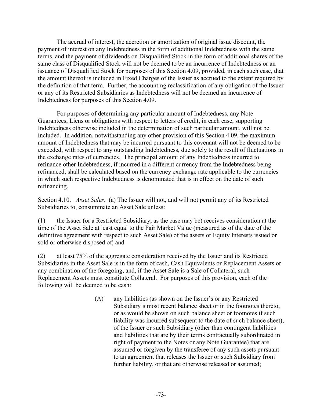 -73- The accrual of interest, the accretion or amortization of original issue discount, the payment of interest on any Indebtedness in the form of additional Indebtedness with the same terms, and the payment of dividends on Disqualified Stock in the form of additional shares of the same class of Disqualified Stock will not be deemed to be an incurrence of Indebtedness or an issuance of Disqualified Stock for purposes of this Section 4.09, provided, in each such case, that the amount thereof is included in Fixed Charges of the Issuer as accrued to the extent required by the definition of that term. Further, the accounting reclassification of any obligation of the Issuer or any of its Restricted Subsidiaries as Indebtedness will not be deemed an incurrence of Indebtedness for purposes of this Section 4.09. For purposes of determining any particular amount of Indebtedness, any Note Guarantees, Liens or obligations with respect to letters of credit, in each case, supporting Indebtedness otherwise included in the determination of such particular amount, will not be included. In addition, notwithstanding any other provision of this Section 4.09, the maximum amount of Indebtedness that may be incurred pursuant to this covenant will not be deemed to be exceeded, with respect to any outstanding Indebtedness, due solely to the result of fluctuations in the exchange rates of currencies. The principal amount of any Indebtedness incurred to refinance other Indebtedness, if incurred in a different currency from the Indebtedness being refinanced, shall be calculated based on the currency exchange rate applicable to the currencies in which such respective Indebtedness is denominated that is in effect on the date of such refinancing. Section 4.10. Asset Sales. (a) The Issuer will not, and will not permit any of its Restricted Subsidiaries to, consummate an Asset Sale unless: (1) the Issuer (or a Restricted Subsidiary, as the case may be) receives consideration at the time of the Asset Sale at least equal to the Fair Market Value (measured as of the date of the definitive agreement with respect to such Asset Sale) of the assets or Equity Interests issued or sold or otherwise disposed of; and (2) at least 75% of the aggregate consideration received by the Issuer and its Restricted Subsidiaries in the Asset Sale is in the form of cash, Cash Equivalents or Replacement Assets or any combination of the foregoing, and, if the Asset Sale is a Sale of Collateral, such Replacement Assets must constitute Collateral. For purposes of this provision, each of the following will be deemed to be cash: (A) any liabilities (as shown on the Issuer’s or any Restricted Subsidiary’s most recent balance sheet or in the footnotes thereto, or as would be shown on such balance sheet or footnotes if such liability was incurred subsequent to the date of such balance sheet), of the Issuer or such Subsidiary (other than contingent liabilities and liabilities that are by their terms contractually subordinated in right of payment to the Notes or any Note Guarantee) that are assumed or forgiven by the transferee of any such assets pursuant to an agreement that releases the Issuer or such Subsidiary from further liability, or that are otherwise released or assumed;