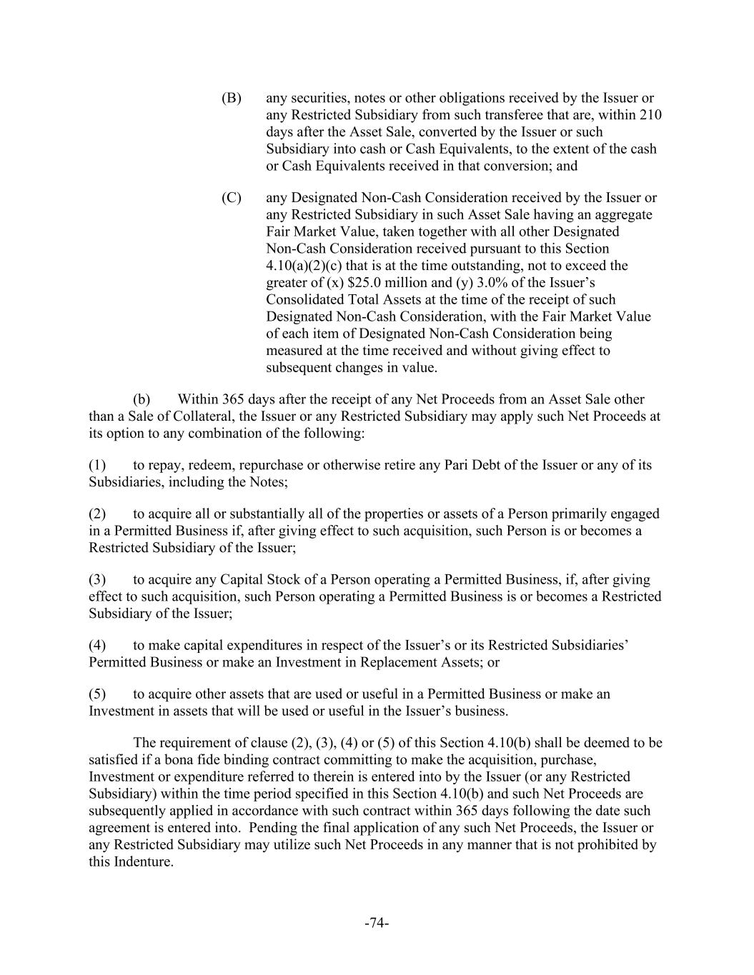 -74- (B) any securities, notes or other obligations received by the Issuer or any Restricted Subsidiary from such transferee that are, within 210 days after the Asset Sale, converted by the Issuer or such Subsidiary into cash or Cash Equivalents, to the extent of the cash or Cash Equivalents received in that conversion; and (C) any Designated Non-Cash Consideration received by the Issuer or any Restricted Subsidiary in such Asset Sale having an aggregate Fair Market Value, taken together with all other Designated Non-Cash Consideration received pursuant to this Section 4.10(a)(2)(c) that is at the time outstanding, not to exceed the greater of (x) $25.0 million and (y) 3.0% of the Issuer’s Consolidated Total Assets at the time of the receipt of such Designated Non-Cash Consideration, with the Fair Market Value of each item of Designated Non-Cash Consideration being measured at the time received and without giving effect to subsequent changes in value. (b) Within 365 days after the receipt of any Net Proceeds from an Asset Sale other than a Sale of Collateral, the Issuer or any Restricted Subsidiary may apply such Net Proceeds at its option to any combination of the following: (1) to repay, redeem, repurchase or otherwise retire any Pari Debt of the Issuer or any of its Subsidiaries, including the Notes; (2) to acquire all or substantially all of the properties or assets of a Person primarily engaged in a Permitted Business if, after giving effect to such acquisition, such Person is or becomes a Restricted Subsidiary of the Issuer; (3) to acquire any Capital Stock of a Person operating a Permitted Business, if, after giving effect to such acquisition, such Person operating a Permitted Business is or becomes a Restricted Subsidiary of the Issuer; (4) to make capital expenditures in respect of the Issuer’s or its Restricted Subsidiaries’ Permitted Business or make an Investment in Replacement Assets; or (5) to acquire other assets that are used or useful in a Permitted Business or make an Investment in assets that will be used or useful in the Issuer’s business. The requirement of clause (2), (3), (4) or (5) of this Section 4.10(b) shall be deemed to be satisfied if a bona fide binding contract committing to make the acquisition, purchase, Investment or expenditure referred to therein is entered into by the Issuer (or any Restricted Subsidiary) within the time period specified in this Section 4.10(b) and such Net Proceeds are subsequently applied in accordance with such contract within 365 days following the date such agreement is entered into. Pending the final application of any such Net Proceeds, the Issuer or any Restricted Subsidiary may utilize such Net Proceeds in any manner that is not prohibited by this Indenture.