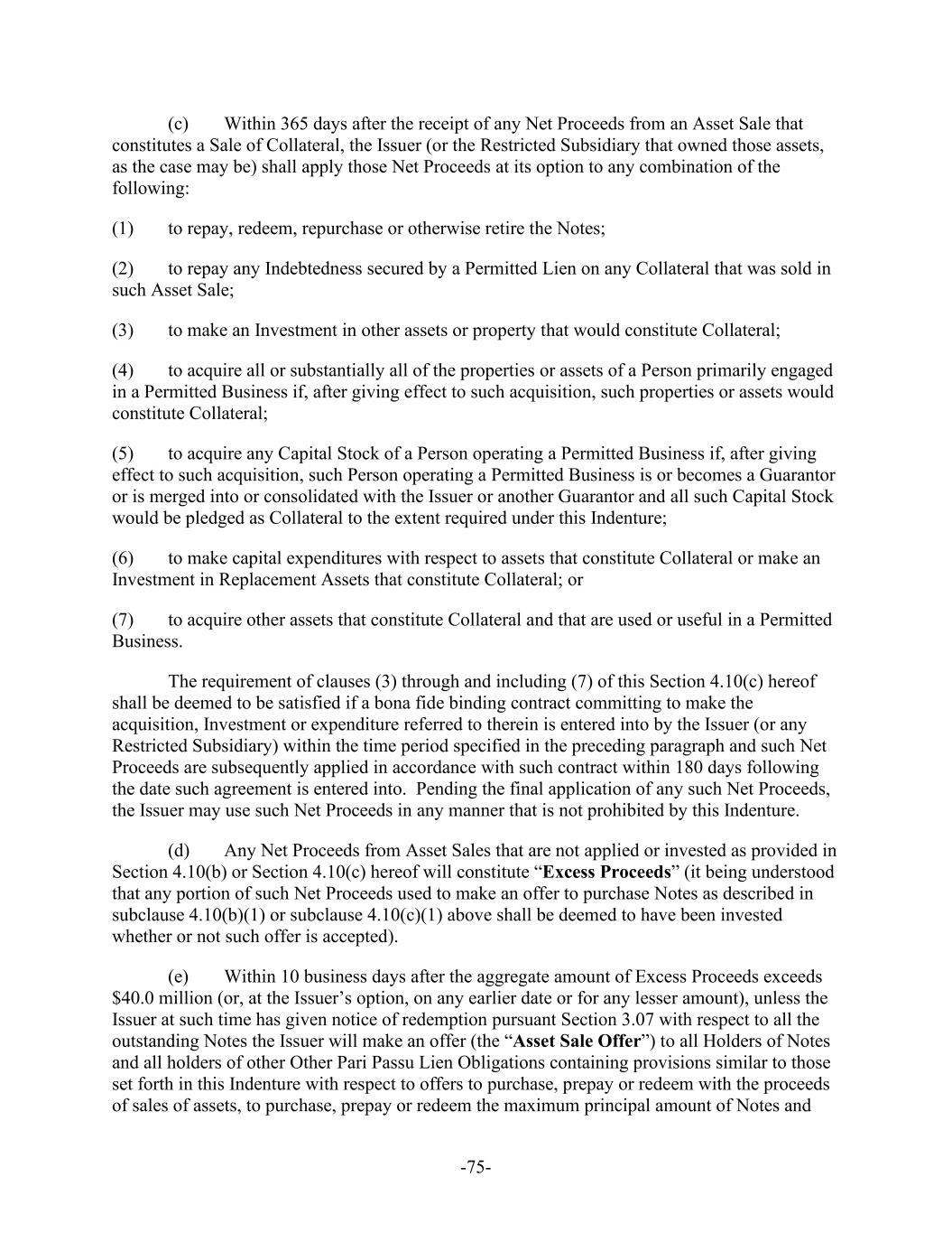 -75- (c) Within 365 days after the receipt of any Net Proceeds from an Asset Sale that constitutes a Sale of Collateral, the Issuer (or the Restricted Subsidiary that owned those assets, as the case may be) shall apply those Net Proceeds at its option to any combination of the following: (1) to repay, redeem, repurchase or otherwise retire the Notes; (2) to repay any Indebtedness secured by a Permitted Lien on any Collateral that was sold in such Asset Sale; (3) to make an Investment in other assets or property that would constitute Collateral; (4) to acquire all or substantially all of the properties or assets of a Person primarily engaged in a Permitted Business if, after giving effect to such acquisition, such properties or assets would constitute Collateral; (5) to acquire any Capital Stock of a Person operating a Permitted Business if, after giving effect to such acquisition, such Person operating a Permitted Business is or becomes a Guarantor or is merged into or consolidated with the Issuer or another Guarantor and all such Capital Stock would be pledged as Collateral to the extent required under this Indenture; (6) to make capital expenditures with respect to assets that constitute Collateral or make an Investment in Replacement Assets that constitute Collateral; or (7) to acquire other assets that constitute Collateral and that are used or useful in a Permitted Business. The requirement of clauses (3) through and including (7) of this Section 4.10(c) hereof shall be deemed to be satisfied if a bona fide binding contract committing to make the acquisition, Investment or expenditure referred to therein is entered into by the Issuer (or any Restricted Subsidiary) within the time period specified in the preceding paragraph and such Net Proceeds are subsequently applied in accordance with such contract within 180 days following the date such agreement is entered into. Pending the final application of any such Net Proceeds, the Issuer may use such Net Proceeds in any manner that is not prohibited by this Indenture. (d) Any Net Proceeds from Asset Sales that are not applied or invested as provided in Section 4.10(b) or Section 4.10(c) hereof will constitute “Excess Proceeds” (it being understood that any portion of such Net Proceeds used to make an offer to purchase Notes as described in subclause 4.10(b)(1) or subclause 4.10(c)(1) above shall be deemed to have been invested whether or not such offer is accepted). (e) Within 10 business days after the aggregate amount of Excess Proceeds exceeds $40.0 million (or, at the Issuer’s option, on any earlier date or for any lesser amount), unless the Issuer at such time has given notice of redemption pursuant Section 3.07 with respect to all the outstanding Notes the Issuer will make an offer (the “Asset Sale Offer”) to all Holders of Notes and all holders of other Other Pari Passu Lien Obligations containing provisions similar to those set forth in this Indenture with respect to offers to purchase, prepay or redeem with the proceeds of sales of assets, to purchase, prepay or redeem the maximum principal amount of Notes and
