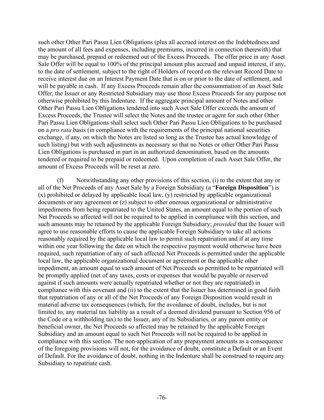 -76- such other Other Pari Passu Lien Obligations (plus all accrued interest on the Indebtedness and the amount of all fees and expenses, including premiums, incurred in connection therewith) that may be purchased, prepaid or redeemed out of the Excess Proceeds. The offer price in any Asset Sale Offer will be equal to 100% of the principal amount plus accrued and unpaid interest, if any, to the date of settlement, subject to the right of Holders of record on the relevant Record Date to receive interest due on an Interest Payment Date that is on or prior to the date of settlement, and will be payable in cash. If any Excess Proceeds remain after the consummation of an Asset Sale Offer, the Issuer or any Restricted Subsidiary may use those Excess Proceeds for any purpose not otherwise prohibited by this Indenture. If the aggregate principal amount of Notes and other Other Pari Passu Lien Obligations tendered into such Asset Sale Offer exceeds the amount of Excess Proceeds, the Trustee will select the Notes and the trustee or agent for such other Other Pari Passu Lien Obligations shall select such Other Pari Passu Lien Obligations to be purchased on a pro rata basis (in compliance with the requirements of the principal national securities exchange, if any, on which the Notes are listed so long as the Trustee has actual knowledge of such listing) but with such adjustments as necessary so that no Notes or other Other Pari Passu Lien Obligations is purchased in part in an authorized denomination, based on the amounts tendered or required to be prepaid or redeemed. Upon completion of each Asset Sale Offer, the amount of Excess Proceeds will be reset at zero. (f) Notwithstanding any other provisions of this section, (i) to the extent that any or all of the Net Proceeds of any Asset Sale by a Foreign Subsidiary (a “Foreign Disposition”) is (x) prohibited or delayed by applicable local law, (y) restricted by applicable organizational documents or any agreement or (z) subject to other onerous organizational or administrative impediments from being repatriated to the United States, an amount equal to the portion of such Net Proceeds so affected will not be required to be applied in compliance with this section, and such amounts may be retained by the applicable Foreign Subsidiary; provided that the Issuer will agree to use reasonable efforts to cause the applicable Foreign Subsidiary to take all actions reasonably required by the applicable local law to permit such repatriation and if at any time within one year following the date on which the respective payment would otherwise have been required, such repatriation of any of such affected Net Proceeds is permitted under the applicable local law, the applicable organizational document or agreement or the applicable other impediment, an amount equal to such amount of Net Proceeds so permitted to be repatriated will be promptly applied (net of any taxes, costs or expenses that would be payable or reserved against if such amounts were actually repatriated whether or not they are repatriated) in compliance with this covenant and (ii) to the extent that the Issuer has determined in good faith that repatriation of any or all of the Net Proceeds of any Foreign Disposition would result in material adverse tax consequences (which, for the avoidance of doubt, includes, but is not limited to, any material tax liability as a result of a deemed dividend pursuant to Section 956 of the Code or a withholding tax) to the Issuer, any of its Subsidiaries, or any parent entity or beneficial owner, the Net Proceeds so affected may be retained by the applicable Foreign Subsidiary and an amount equal to such Net Proceeds will not be required to be applied in compliance with this section. The non-application of any prepayment amounts as a consequence of the foregoing provisions will not, for the avoidance of doubt, constitute a Default or an Event of Default. For the avoidance of doubt, nothing in the Indenture shall be construed to require any Subsidiary to repatriate cash.