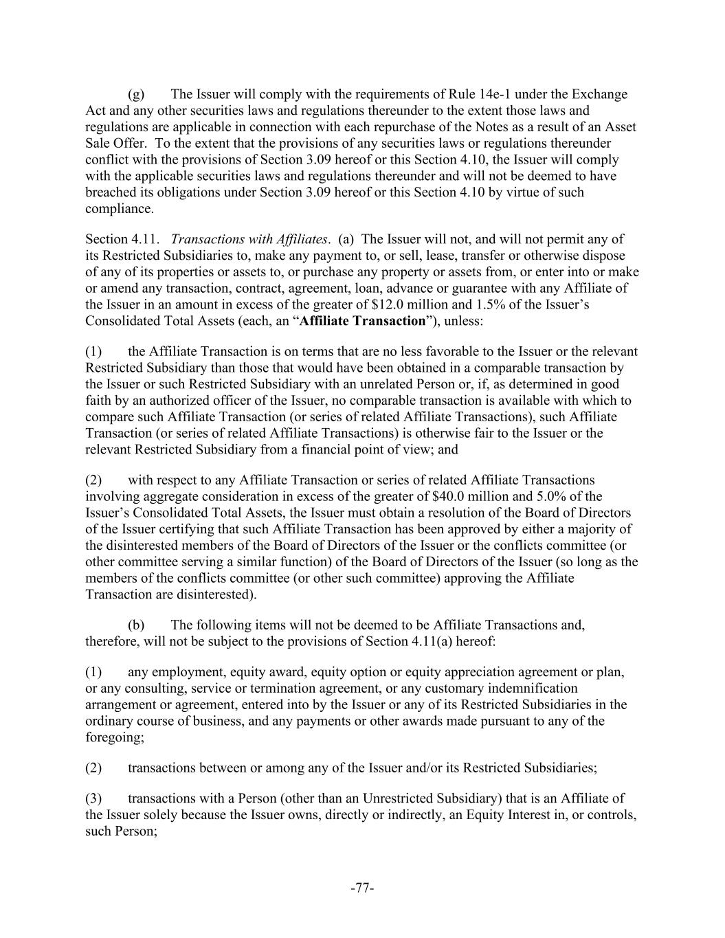 -77- (g) The Issuer will comply with the requirements of Rule 14e-1 under the Exchange Act and any other securities laws and regulations thereunder to the extent those laws and regulations are applicable in connection with each repurchase of the Notes as a result of an Asset Sale Offer. To the extent that the provisions of any securities laws or regulations thereunder conflict with the provisions of Section 3.09 hereof or this Section 4.10, the Issuer will comply with the applicable securities laws and regulations thereunder and will not be deemed to have breached its obligations under Section 3.09 hereof or this Section 4.10 by virtue of such compliance. Section 4.11. Transactions with Affiliates. (a) The Issuer will not, and will not permit any of its Restricted Subsidiaries to, make any payment to, or sell, lease, transfer or otherwise dispose of any of its properties or assets to, or purchase any property or assets from, or enter into or make or amend any transaction, contract, agreement, loan, advance or guarantee with any Affiliate of the Issuer in an amount in excess of the greater of $12.0 million and 1.5% of the Issuer’s Consolidated Total Assets (each, an “Affiliate Transaction”), unless: (1) the Affiliate Transaction is on terms that are no less favorable to the Issuer or the relevant Restricted Subsidiary than those that would have been obtained in a comparable transaction by the Issuer or such Restricted Subsidiary with an unrelated Person or, if, as determined in good faith by an authorized officer of the Issuer, no comparable transaction is available with which to compare such Affiliate Transaction (or series of related Affiliate Transactions), such Affiliate Transaction (or series of related Affiliate Transactions) is otherwise fair to the Issuer or the relevant Restricted Subsidiary from a financial point of view; and (2) with respect to any Affiliate Transaction or series of related Affiliate Transactions involving aggregate consideration in excess of the greater of $40.0 million and 5.0% of the Issuer’s Consolidated Total Assets, the Issuer must obtain a resolution of the Board of Directors of the Issuer certifying that such Affiliate Transaction has been approved by either a majority of the disinterested members of the Board of Directors of the Issuer or the conflicts committee (or other committee serving a similar function) of the Board of Directors of the Issuer (so long as the members of the conflicts committee (or other such committee) approving the Affiliate Transaction are disinterested). (b) The following items will not be deemed to be Affiliate Transactions and, therefore, will not be subject to the provisions of Section 4.11(a) hereof: (1) any employment, equity award, equity option or equity appreciation agreement or plan, or any consulting, service or termination agreement, or any customary indemnification arrangement or agreement, entered into by the Issuer or any of its Restricted Subsidiaries in the ordinary course of business, and any payments or other awards made pursuant to any of the foregoing; (2) transactions between or among any of the Issuer and/or its Restricted Subsidiaries; (3) transactions with a Person (other than an Unrestricted Subsidiary) that is an Affiliate of the Issuer solely because the Issuer owns, directly or indirectly, an Equity Interest in, or controls, such Person;