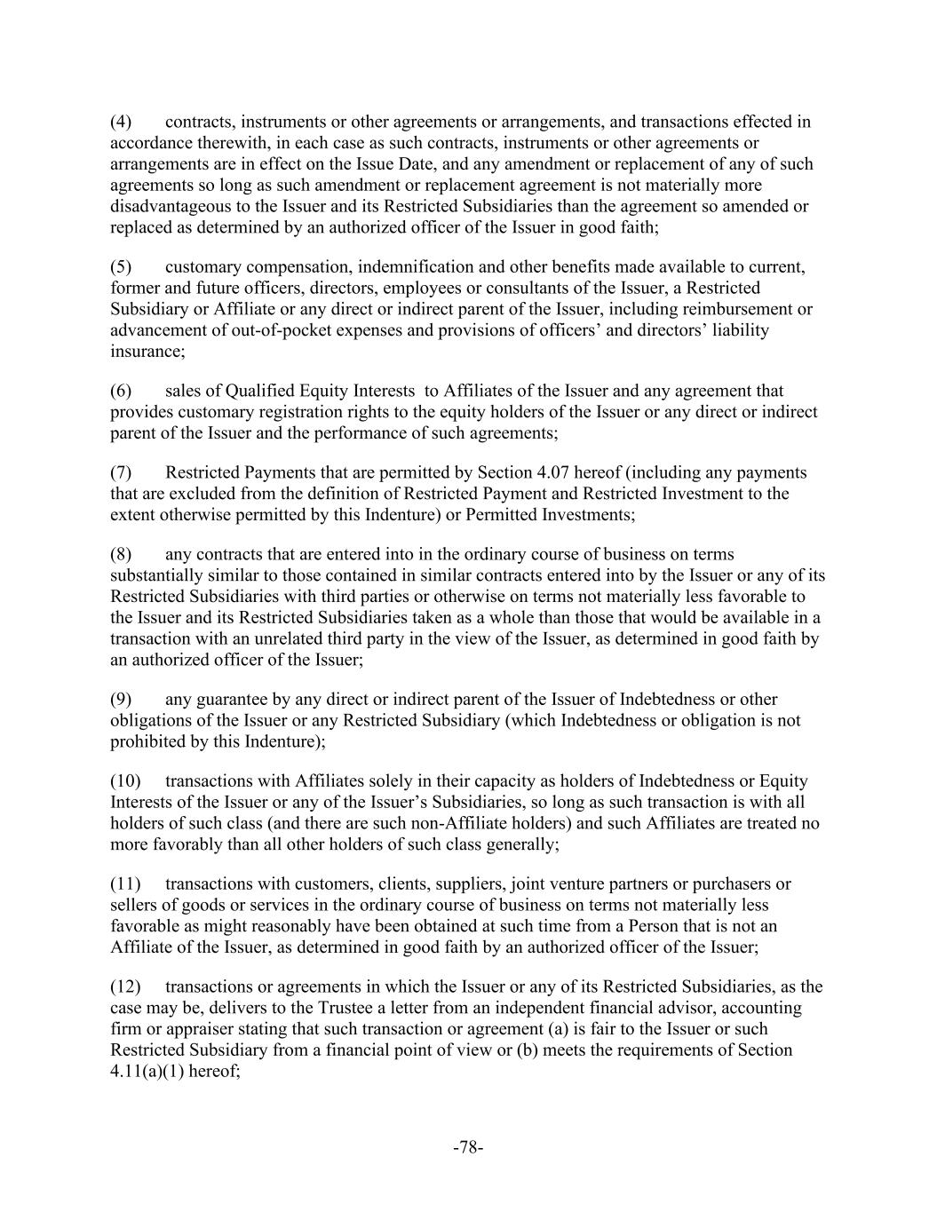 -78- (4) contracts, instruments or other agreements or arrangements, and transactions effected in accordance therewith, in each case as such contracts, instruments or other agreements or arrangements are in effect on the Issue Date, and any amendment or replacement of any of such agreements so long as such amendment or replacement agreement is not materially more disadvantageous to the Issuer and its Restricted Subsidiaries than the agreement so amended or replaced as determined by an authorized officer of the Issuer in good faith; (5) customary compensation, indemnification and other benefits made available to current, former and future officers, directors, employees or consultants of the Issuer, a Restricted Subsidiary or Affiliate or any direct or indirect parent of the Issuer, including reimbursement or advancement of out-of-pocket expenses and provisions of officers’ and directors’ liability insurance; (6) sales of Qualified Equity Interests to Affiliates of the Issuer and any agreement that provides customary registration rights to the equity holders of the Issuer or any direct or indirect parent of the Issuer and the performance of such agreements; (7) Restricted Payments that are permitted by Section 4.07 hereof (including any payments that are excluded from the definition of Restricted Payment and Restricted Investment to the extent otherwise permitted by this Indenture) or Permitted Investments; (8) any contracts that are entered into in the ordinary course of business on terms substantially similar to those contained in similar contracts entered into by the Issuer or any of its Restricted Subsidiaries with third parties or otherwise on terms not materially less favorable to the Issuer and its Restricted Subsidiaries taken as a whole than those that would be available in a transaction with an unrelated third party in the view of the Issuer, as determined in good faith by an authorized officer of the Issuer; (9) any guarantee by any direct or indirect parent of the Issuer of Indebtedness or other obligations of the Issuer or any Restricted Subsidiary (which Indebtedness or obligation is not prohibited by this Indenture); (10) transactions with Affiliates solely in their capacity as holders of Indebtedness or Equity Interests of the Issuer or any of the Issuer’s Subsidiaries, so long as such transaction is with all holders of such class (and there are such non-Affiliate holders) and such Affiliates are treated no more favorably than all other holders of such class generally; (11) transactions with customers, clients, suppliers, joint venture partners or purchasers or sellers of goods or services in the ordinary course of business on terms not materially less favorable as might reasonably have been obtained at such time from a Person that is not an Affiliate of the Issuer, as determined in good faith by an authorized officer of the Issuer; (12) transactions or agreements in which the Issuer or any of its Restricted Subsidiaries, as the case may be, delivers to the Trustee a letter from an independent financial advisor, accounting firm or appraiser stating that such transaction or agreement (a) is fair to the Issuer or such Restricted Subsidiary from a financial point of view or (b) meets the requirements of Section 4.11(a)(1) hereof;
