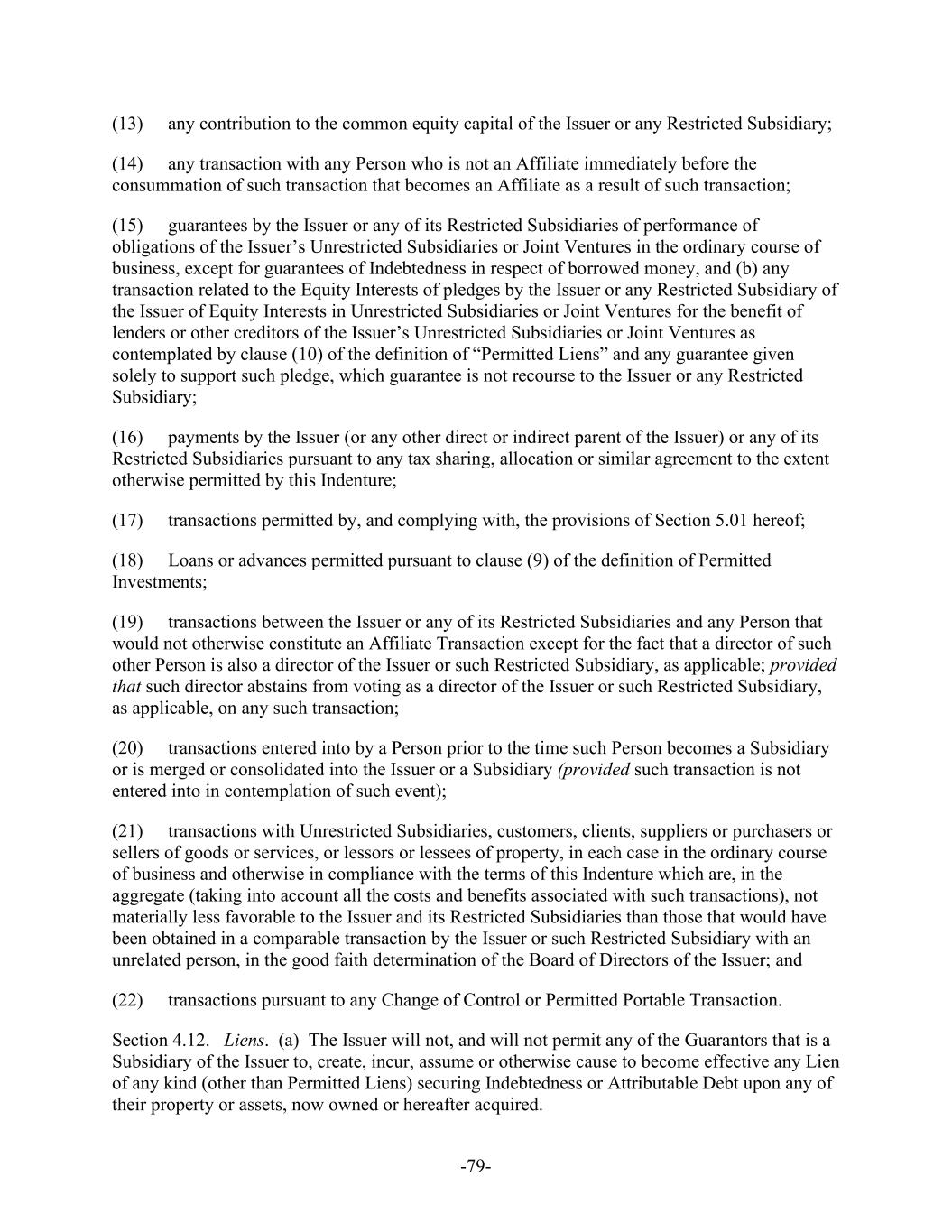 -79- (13) any contribution to the common equity capital of the Issuer or any Restricted Subsidiary; (14) any transaction with any Person who is not an Affiliate immediately before the consummation of such transaction that becomes an Affiliate as a result of such transaction; (15) guarantees by the Issuer or any of its Restricted Subsidiaries of performance of obligations of the Issuer’s Unrestricted Subsidiaries or Joint Ventures in the ordinary course of business, except for guarantees of Indebtedness in respect of borrowed money, and (b) any transaction related to the Equity Interests of pledges by the Issuer or any Restricted Subsidiary of the Issuer of Equity Interests in Unrestricted Subsidiaries or Joint Ventures for the benefit of lenders or other creditors of the Issuer’s Unrestricted Subsidiaries or Joint Ventures as contemplated by clause (10) of the definition of “Permitted Liens” and any guarantee given solely to support such pledge, which guarantee is not recourse to the Issuer or any Restricted Subsidiary; (16) payments by the Issuer (or any other direct or indirect parent of the Issuer) or any of its Restricted Subsidiaries pursuant to any tax sharing, allocation or similar agreement to the extent otherwise permitted by this Indenture; (17) transactions permitted by, and complying with, the provisions of Section 5.01 hereof; (18) Loans or advances permitted pursuant to clause (9) of the definition of Permitted Investments; (19) transactions between the Issuer or any of its Restricted Subsidiaries and any Person that would not otherwise constitute an Affiliate Transaction except for the fact that a director of such other Person is also a director of the Issuer or such Restricted Subsidiary, as applicable; provided that such director abstains from voting as a director of the Issuer or such Restricted Subsidiary, as applicable, on any such transaction; (20) transactions entered into by a Person prior to the time such Person becomes a Subsidiary or is merged or consolidated into the Issuer or a Subsidiary (provided such transaction is not entered into in contemplation of such event); (21) transactions with Unrestricted Subsidiaries, customers, clients, suppliers or purchasers or sellers of goods or services, or lessors or lessees of property, in each case in the ordinary course of business and otherwise in compliance with the terms of this Indenture which are, in the aggregate (taking into account all the costs and benefits associated with such transactions), not materially less favorable to the Issuer and its Restricted Subsidiaries than those that would have been obtained in a comparable transaction by the Issuer or such Restricted Subsidiary with an unrelated person, in the good faith determination of the Board of Directors of the Issuer; and (22) transactions pursuant to any Change of Control or Permitted Portable Transaction. Section 4.12. Liens. (a) The Issuer will not, and will not permit any of the Guarantors that is a Subsidiary of the Issuer to, create, incur, assume or otherwise cause to become effective any Lien of any kind (other than Permitted Liens) securing Indebtedness or Attributable Debt upon any of their property or assets, now owned or hereafter acquired.