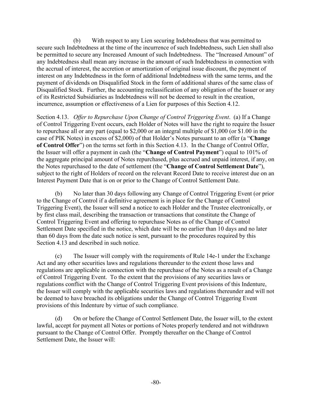 -80- (b) With respect to any Lien securing Indebtedness that was permitted to secure such Indebtedness at the time of the incurrence of such Indebtedness, such Lien shall also be permitted to secure any Increased Amount of such Indebtedness. The “Increased Amount” of any Indebtedness shall mean any increase in the amount of such Indebtedness in connection with the accrual of interest, the accretion or amortization of original issue discount, the payment of interest on any Indebtedness in the form of additional Indebtedness with the same terms, and the payment of dividends on Disqualified Stock in the form of additional shares of the same class of Disqualified Stock. Further, the accounting reclassification of any obligation of the Issuer or any of its Restricted Subsidiaries as Indebtedness will not be deemed to result in the creation, incurrence, assumption or effectiveness of a Lien for purposes of this Section 4.12. Section 4.13. Offer to Repurchase Upon Change of Control Triggering Event. (a) If a Change of Control Triggering Event occurs, each Holder of Notes will have the right to require the Issuer to repurchase all or any part (equal to $2,000 or an integral multiple of $1,000 (or $1.00 in the case of PIK Notes) in excess of $2,000) of that Holder’s Notes pursuant to an offer (a “Change of Control Offer”) on the terms set forth in this Section 4.13. In the Change of Control Offer, the Issuer will offer a payment in cash (the “Change of Control Payment”) equal to 101% of the aggregate principal amount of Notes repurchased, plus accrued and unpaid interest, if any, on the Notes repurchased to the date of settlement (the “Change of Control Settlement Date”), subject to the right of Holders of record on the relevant Record Date to receive interest due on an Interest Payment Date that is on or prior to the Change of Control Settlement Date. (b) No later than 30 days following any Change of Control Triggering Event (or prior to the Change of Control if a definitive agreement is in place for the Change of Control Triggering Event), the Issuer will send a notice to each Holder and the Trustee electronically, or by first class mail, describing the transaction or transactions that constitute the Change of Control Triggering Event and offering to repurchase Notes as of the Change of Control Settlement Date specified in the notice, which date will be no earlier than 10 days and no later than 60 days from the date such notice is sent, pursuant to the procedures required by this Section 4.13 and described in such notice. (c) The Issuer will comply with the requirements of Rule 14e-1 under the Exchange Act and any other securities laws and regulations thereunder to the extent those laws and regulations are applicable in connection with the repurchase of the Notes as a result of a Change of Control Triggering Event. To the extent that the provisions of any securities laws or regulations conflict with the Change of Control Triggering Event provisions of this Indenture, the Issuer will comply with the applicable securities laws and regulations thereunder and will not be deemed to have breached its obligations under the Change of Control Triggering Event provisions of this Indenture by virtue of such compliance. (d) On or before the Change of Control Settlement Date, the Issuer will, to the extent lawful, accept for payment all Notes or portions of Notes properly tendered and not withdrawn pursuant to the Change of Control Offer. Promptly thereafter on the Change of Control Settlement Date, the Issuer will: