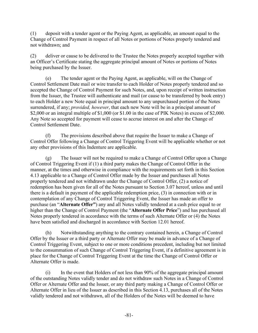 -81- (1) deposit with a tender agent or the Paying Agent, as applicable, an amount equal to the Change of Control Payment in respect of all Notes or portions of Notes properly tendered and not withdrawn; and (2) deliver or cause to be delivered to the Trustee the Notes properly accepted together with an Officer’s Certificate stating the aggregate principal amount of Notes or portions of Notes being purchased by the Issuer. (e) The tender agent or the Paying Agent, as applicable, will on the Change of Control Settlement Date mail or wire transfer to each Holder of Notes properly tendered and so accepted the Change of Control Payment for such Notes, and, upon receipt of written instruction from the Issuer, the Trustee will authenticate and mail (or cause to be transferred by book entry) to each Holder a new Note equal in principal amount to any unpurchased portion of the Notes surrendered, if any; provided, however, that each new Note will be in a principal amount of $2,000 or an integral multiple of $1,000 (or $1.00 in the case of PIK Notes) in excess of $2,000. Any Note so accepted for payment will cease to accrue interest on and after the Change of Control Settlement Date. (f) The provisions described above that require the Issuer to make a Change of Control Offer following a Change of Control Triggering Event will be applicable whether or not any other provisions of this Indenture are applicable. (g) The Issuer will not be required to make a Change of Control Offer upon a Change of Control Triggering Event if (1) a third party makes the Change of Control Offer in the manner, at the times and otherwise in compliance with the requirements set forth in this Section 4.13 applicable to a Change of Control Offer made by the Issuer and purchases all Notes properly tendered and not withdrawn under the Change of Control Offer, (2) a notice of redemption has been given for all of the Notes pursuant to Section 3.07 hereof, unless and until there is a default in payment of the applicable redemption price, (3) in connection with or in contemplation of any Change of Control Triggering Event, the Issuer has made an offer to purchase (an “Alternate Offer”) any and all Notes validly tendered at a cash price equal to or higher than the Change of Control Payment (the “Alternate Offer Price”) and has purchased all Notes properly tendered in accordance with the terms of such Alternate Offer or (4) the Notes have been satisfied and discharged in accordance with Section 12.01 hereof. (h) Notwithstanding anything to the contrary contained herein, a Change of Control Offer by the Issuer or a third party or Alternate Offer may be made in advance of a Change of Control Triggering Event, subject to one or more conditions precedent, including but not limited to the consummation of such Change of Control Triggering Event, if a definitive agreement is in place for the Change of Control Triggering Event at the time the Change of Control Offer or Alternate Offer is made. (i) In the event that Holders of not less than 90% of the aggregate principal amount of the outstanding Notes validly tender and do not withdraw such Notes in a Change of Control Offer or Alternate Offer and the Issuer, or any third party making a Change of Control Offer or Alternate Offer in lieu of the Issuer as described in this Section 4.13, purchases all of the Notes validly tendered and not withdrawn, all of the Holders of the Notes will be deemed to have
