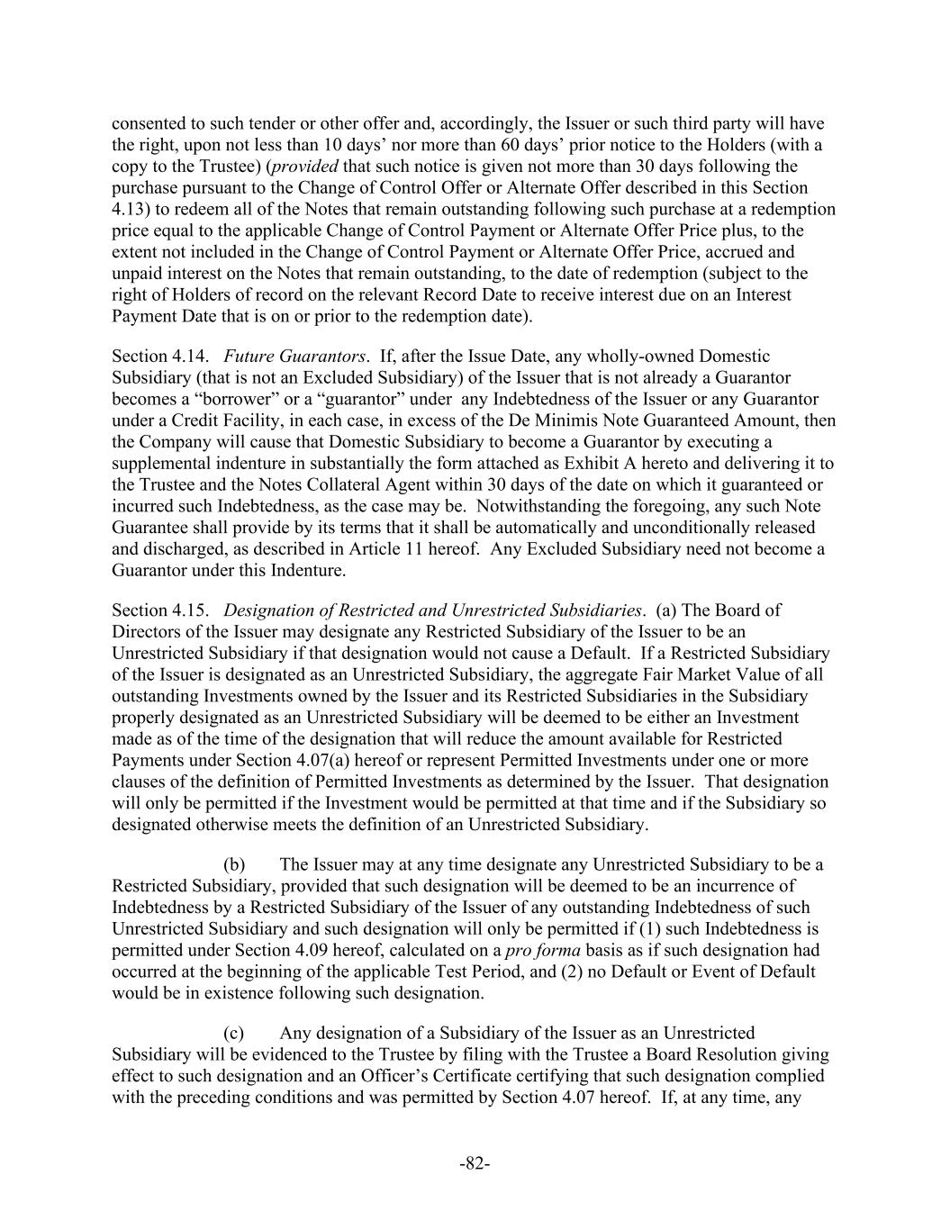 -82- consented to such tender or other offer and, accordingly, the Issuer or such third party will have the right, upon not less than 10 days’ nor more than 60 days’ prior notice to the Holders (with a copy to the Trustee) (provided that such notice is given not more than 30 days following the purchase pursuant to the Change of Control Offer or Alternate Offer described in this Section 4.13) to redeem all of the Notes that remain outstanding following such purchase at a redemption price equal to the applicable Change of Control Payment or Alternate Offer Price plus, to the extent not included in the Change of Control Payment or Alternate Offer Price, accrued and unpaid interest on the Notes that remain outstanding, to the date of redemption (subject to the right of Holders of record on the relevant Record Date to receive interest due on an Interest Payment Date that is on or prior to the redemption date). Section 4.14. Future Guarantors. If, after the Issue Date, any wholly-owned Domestic Subsidiary (that is not an Excluded Subsidiary) of the Issuer that is not already a Guarantor becomes a “borrower” or a “guarantor” under any Indebtedness of the Issuer or any Guarantor under a Credit Facility, in each case, in excess of the De Minimis Note Guaranteed Amount, then the Company will cause that Domestic Subsidiary to become a Guarantor by executing a supplemental indenture in substantially the form attached as Exhibit A hereto and delivering it to the Trustee and the Notes Collateral Agent within 30 days of the date on which it guaranteed or incurred such Indebtedness, as the case may be. Notwithstanding the foregoing, any such Note Guarantee shall provide by its terms that it shall be automatically and unconditionally released and discharged, as described in Article 11 hereof. Any Excluded Subsidiary need not become a Guarantor under this Indenture. Section 4.15. Designation of Restricted and Unrestricted Subsidiaries. (a) The Board of Directors of the Issuer may designate any Restricted Subsidiary of the Issuer to be an Unrestricted Subsidiary if that designation would not cause a Default. If a Restricted Subsidiary of the Issuer is designated as an Unrestricted Subsidiary, the aggregate Fair Market Value of all outstanding Investments owned by the Issuer and its Restricted Subsidiaries in the Subsidiary properly designated as an Unrestricted Subsidiary will be deemed to be either an Investment made as of the time of the designation that will reduce the amount available for Restricted Payments under Section 4.07(a) hereof or represent Permitted Investments under one or more clauses of the definition of Permitted Investments as determined by the Issuer. That designation will only be permitted if the Investment would be permitted at that time and if the Subsidiary so designated otherwise meets the definition of an Unrestricted Subsidiary. (b) The Issuer may at any time designate any Unrestricted Subsidiary to be a Restricted Subsidiary, provided that such designation will be deemed to be an incurrence of Indebtedness by a Restricted Subsidiary of the Issuer of any outstanding Indebtedness of such Unrestricted Subsidiary and such designation will only be permitted if (1) such Indebtedness is permitted under Section 4.09 hereof, calculated on a pro forma basis as if such designation had occurred at the beginning of the applicable Test Period, and (2) no Default or Event of Default would be in existence following such designation. (c) Any designation of a Subsidiary of the Issuer as an Unrestricted Subsidiary will be evidenced to the Trustee by filing with the Trustee a Board Resolution giving effect to such designation and an Officer’s Certificate certifying that such designation complied with the preceding conditions and was permitted by Section 4.07 hereof. If, at any time, any