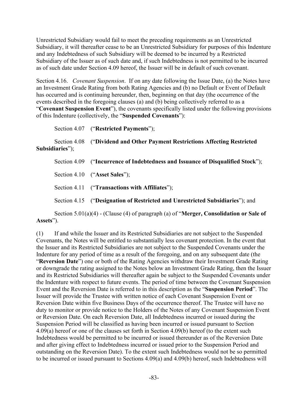 -83- Unrestricted Subsidiary would fail to meet the preceding requirements as an Unrestricted Subsidiary, it will thereafter cease to be an Unrestricted Subsidiary for purposes of this Indenture and any Indebtedness of such Subsidiary will be deemed to be incurred by a Restricted Subsidiary of the Issuer as of such date and, if such Indebtedness is not permitted to be incurred as of such date under Section 4.09 hereof, the Issuer will be in default of such covenant. Section 4.16. Covenant Suspension. If on any date following the Issue Date, (a) the Notes have an Investment Grade Rating from both Rating Agencies and (b) no Default or Event of Default has occurred and is continuing hereunder, then, beginning on that day (the occurrence of the events described in the foregoing clauses (a) and (b) being collectively referred to as a “Covenant Suspension Event”), the covenants specifically listed under the following provisions of this Indenture (collectively, the “Suspended Covenants”): Section 4.07 (“Restricted Payments”); Section 4.08 (“Dividend and Other Payment Restrictions Affecting Restricted Subsidiaries”); Section 4.09 (“Incurrence of Indebtedness and Issuance of Disqualified Stock”); Section 4.10 (“Asset Sales”); Section 4.11 (“Transactions with Affiliates”); Section 4.15 (“Designation of Restricted and Unrestricted Subsidiaries”); and Section 5.01(a)(4) - (Clause (4) of paragraph (a) of “Merger, Consolidation or Sale of Assets”). (1) If and while the Issuer and its Restricted Subsidiaries are not subject to the Suspended Covenants, the Notes will be entitled to substantially less covenant protection. In the event that the Issuer and its Restricted Subsidiaries are not subject to the Suspended Covenants under the Indenture for any period of time as a result of the foregoing, and on any subsequent date (the “Reversion Date”) one or both of the Rating Agencies withdraw their Investment Grade Rating or downgrade the rating assigned to the Notes below an Investment Grade Rating, then the Issuer and its Restricted Subsidiaries will thereafter again be subject to the Suspended Covenants under the Indenture with respect to future events. The period of time between the Covenant Suspension Event and the Reversion Date is referred to in this description as the “Suspension Period”. The Issuer will provide the Trustee with written notice of each Covenant Suspension Event or Reversion Date within five Business Days of the occurrence thereof. The Trustee will have no duty to monitor or provide notice to the Holders of the Notes of any Covenant Suspension Event or Reversion Date. On each Reversion Date, all Indebtedness incurred or issued during the Suspension Period will be classified as having been incurred or issued pursuant to Section 4.09(a) hereof or one of the clauses set forth in Section 4.09(b) hereof (to the extent such Indebtedness would be permitted to be incurred or issued thereunder as of the Reversion Date and after giving effect to Indebtedness incurred or issued prior to the Suspension Period and outstanding on the Reversion Date). To the extent such Indebtedness would not be so permitted to be incurred or issued pursuant to Sections 4.09(a) and 4.09(b) hereof, such Indebtedness will
