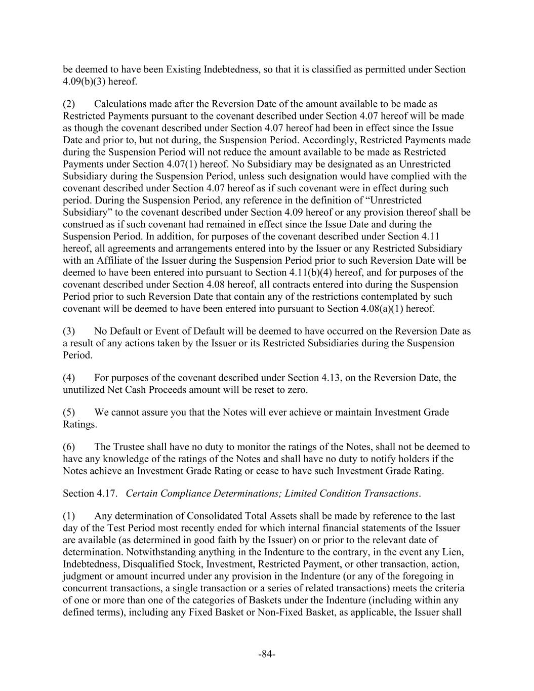 -84- be deemed to have been Existing Indebtedness, so that it is classified as permitted under Section 4.09(b)(3) hereof. (2) Calculations made after the Reversion Date of the amount available to be made as Restricted Payments pursuant to the covenant described under Section 4.07 hereof will be made as though the covenant described under Section 4.07 hereof had been in effect since the Issue Date and prior to, but not during, the Suspension Period. Accordingly, Restricted Payments made during the Suspension Period will not reduce the amount available to be made as Restricted Payments under Section 4.07(1) hereof. No Subsidiary may be designated as an Unrestricted Subsidiary during the Suspension Period, unless such designation would have complied with the covenant described under Section 4.07 hereof as if such covenant were in effect during such period. During the Suspension Period, any reference in the definition of “Unrestricted Subsidiary” to the covenant described under Section 4.09 hereof or any provision thereof shall be construed as if such covenant had remained in effect since the Issue Date and during the Suspension Period. In addition, for purposes of the covenant described under Section 4.11 hereof, all agreements and arrangements entered into by the Issuer or any Restricted Subsidiary with an Affiliate of the Issuer during the Suspension Period prior to such Reversion Date will be deemed to have been entered into pursuant to Section 4.11(b)(4) hereof, and for purposes of the covenant described under Section 4.08 hereof, all contracts entered into during the Suspension Period prior to such Reversion Date that contain any of the restrictions contemplated by such covenant will be deemed to have been entered into pursuant to Section 4.08(a)(1) hereof. (3) No Default or Event of Default will be deemed to have occurred on the Reversion Date as a result of any actions taken by the Issuer or its Restricted Subsidiaries during the Suspension Period. (4) For purposes of the covenant described under Section 4.13, on the Reversion Date, the unutilized Net Cash Proceeds amount will be reset to zero. (5) We cannot assure you that the Notes will ever achieve or maintain Investment Grade Ratings. (6) The Trustee shall have no duty to monitor the ratings of the Notes, shall not be deemed to have any knowledge of the ratings of the Notes and shall have no duty to notify holders if the Notes achieve an Investment Grade Rating or cease to have such Investment Grade Rating. Section 4.17. Certain Compliance Determinations; Limited Condition Transactions. (1) Any determination of Consolidated Total Assets shall be made by reference to the last day of the Test Period most recently ended for which internal financial statements of the Issuer are available (as determined in good faith by the Issuer) on or prior to the relevant date of determination. Notwithstanding anything in the Indenture to the contrary, in the event any Lien, Indebtedness, Disqualified Stock, Investment, Restricted Payment, or other transaction, action, judgment or amount incurred under any provision in the Indenture (or any of the foregoing in concurrent transactions, a single transaction or a series of related transactions) meets the criteria of one or more than one of the categories of Baskets under the Indenture (including within any defined terms), including any Fixed Basket or Non-Fixed Basket, as applicable, the Issuer shall