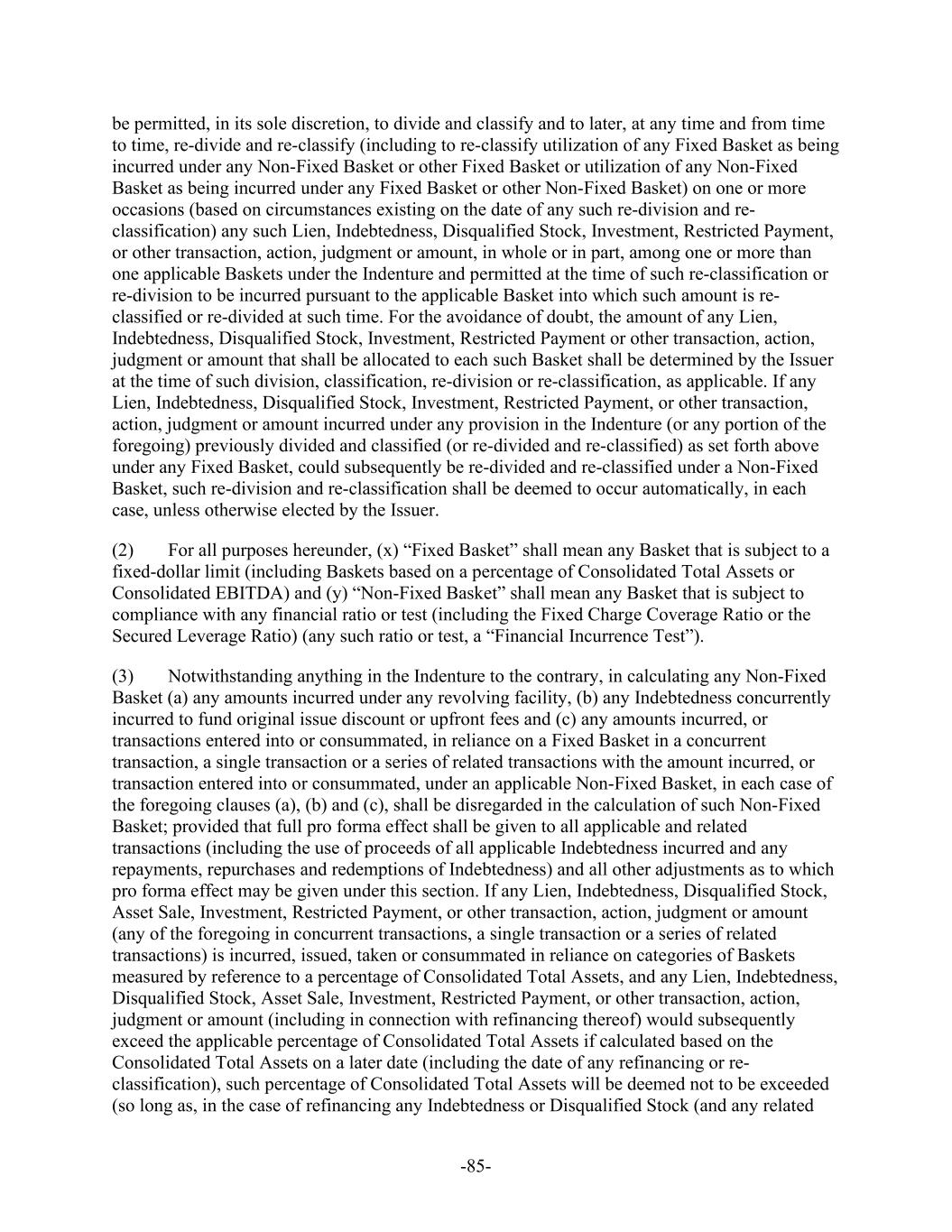-85- be permitted, in its sole discretion, to divide and classify and to later, at any time and from time to time, re-divide and re-classify (including to re-classify utilization of any Fixed Basket as being incurred under any Non-Fixed Basket or other Fixed Basket or utilization of any Non-Fixed Basket as being incurred under any Fixed Basket or other Non-Fixed Basket) on one or more occasions (based on circumstances existing on the date of any such re-division and re- classification) any such Lien, Indebtedness, Disqualified Stock, Investment, Restricted Payment, or other transaction, action, judgment or amount, in whole or in part, among one or more than one applicable Baskets under the Indenture and permitted at the time of such re-classification or re-division to be incurred pursuant to the applicable Basket into which such amount is re- classified or re-divided at such time. For the avoidance of doubt, the amount of any Lien, Indebtedness, Disqualified Stock, Investment, Restricted Payment or other transaction, action, judgment or amount that shall be allocated to each such Basket shall be determined by the Issuer at the time of such division, classification, re-division or re-classification, as applicable. If any Lien, Indebtedness, Disqualified Stock, Investment, Restricted Payment, or other transaction, action, judgment or amount incurred under any provision in the Indenture (or any portion of the foregoing) previously divided and classified (or re-divided and re-classified) as set forth above under any Fixed Basket, could subsequently be re-divided and re-classified under a Non-Fixed Basket, such re-division and re-classification shall be deemed to occur automatically, in each case, unless otherwise elected by the Issuer. (2) For all purposes hereunder, (x) “Fixed Basket” shall mean any Basket that is subject to a fixed-dollar limit (including Baskets based on a percentage of Consolidated Total Assets or Consolidated EBITDA) and (y) “Non-Fixed Basket” shall mean any Basket that is subject to compliance with any financial ratio or test (including the Fixed Charge Coverage Ratio or the Secured Leverage Ratio) (any such ratio or test, a “Financial Incurrence Test”). (3) Notwithstanding anything in the Indenture to the contrary, in calculating any Non-Fixed Basket (a) any amounts incurred under any revolving facility, (b) any Indebtedness concurrently incurred to fund original issue discount or upfront fees and (c) any amounts incurred, or transactions entered into or consummated, in reliance on a Fixed Basket in a concurrent transaction, a single transaction or a series of related transactions with the amount incurred, or transaction entered into or consummated, under an applicable Non-Fixed Basket, in each case of the foregoing clauses (a), (b) and (c), shall be disregarded in the calculation of such Non-Fixed Basket; provided that full pro forma effect shall be given to all applicable and related transactions (including the use of proceeds of all applicable Indebtedness incurred and any repayments, repurchases and redemptions of Indebtedness) and all other adjustments as to which pro forma effect may be given under this section. If any Lien, Indebtedness, Disqualified Stock, Asset Sale, Investment, Restricted Payment, or other transaction, action, judgment or amount (any of the foregoing in concurrent transactions, a single transaction or a series of related transactions) is incurred, issued, taken or consummated in reliance on categories of Baskets measured by reference to a percentage of Consolidated Total Assets, and any Lien, Indebtedness, Disqualified Stock, Asset Sale, Investment, Restricted Payment, or other transaction, action, judgment or amount (including in connection with refinancing thereof) would subsequently exceed the applicable percentage of Consolidated Total Assets if calculated based on the Consolidated Total Assets on a later date (including the date of any refinancing or re- classification), such percentage of Consolidated Total Assets will be deemed not to be exceeded (so long as, in the case of refinancing any Indebtedness or Disqualified Stock (and any related
