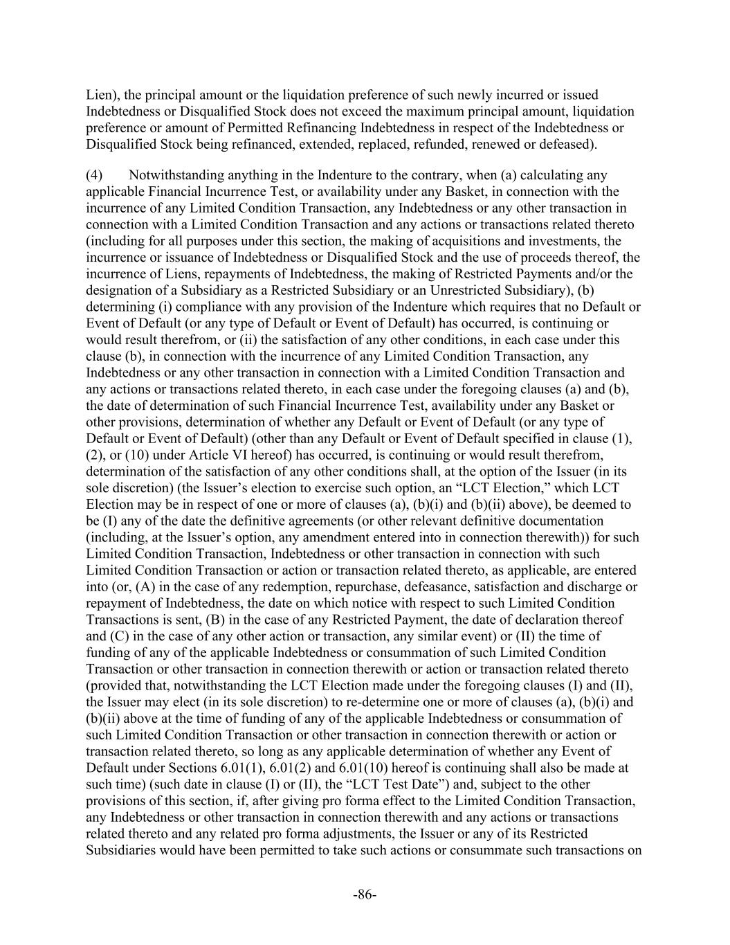 -86- Lien), the principal amount or the liquidation preference of such newly incurred or issued Indebtedness or Disqualified Stock does not exceed the maximum principal amount, liquidation preference or amount of Permitted Refinancing Indebtedness in respect of the Indebtedness or Disqualified Stock being refinanced, extended, replaced, refunded, renewed or defeased). (4) Notwithstanding anything in the Indenture to the contrary, when (a) calculating any applicable Financial Incurrence Test, or availability under any Basket, in connection with the incurrence of any Limited Condition Transaction, any Indebtedness or any other transaction in connection with a Limited Condition Transaction and any actions or transactions related thereto (including for all purposes under this section, the making of acquisitions and investments, the incurrence or issuance of Indebtedness or Disqualified Stock and the use of proceeds thereof, the incurrence of Liens, repayments of Indebtedness, the making of Restricted Payments and/or the designation of a Subsidiary as a Restricted Subsidiary or an Unrestricted Subsidiary), (b) determining (i) compliance with any provision of the Indenture which requires that no Default or Event of Default (or any type of Default or Event of Default) has occurred, is continuing or would result therefrom, or (ii) the satisfaction of any other conditions, in each case under this clause (b), in connection with the incurrence of any Limited Condition Transaction, any Indebtedness or any other transaction in connection with a Limited Condition Transaction and any actions or transactions related thereto, in each case under the foregoing clauses (a) and (b), the date of determination of such Financial Incurrence Test, availability under any Basket or other provisions, determination of whether any Default or Event of Default (or any type of Default or Event of Default) (other than any Default or Event of Default specified in clause (1), (2), or (10) under Article VI hereof) has occurred, is continuing or would result therefrom, determination of the satisfaction of any other conditions shall, at the option of the Issuer (in its sole discretion) (the Issuer’s election to exercise such option, an “LCT Election,” which LCT Election may be in respect of one or more of clauses (a), (b)(i) and (b)(ii) above), be deemed to be (I) any of the date the definitive agreements (or other relevant definitive documentation (including, at the Issuer’s option, any amendment entered into in connection therewith)) for such Limited Condition Transaction, Indebtedness or other transaction in connection with such Limited Condition Transaction or action or transaction related thereto, as applicable, are entered into (or, (A) in the case of any redemption, repurchase, defeasance, satisfaction and discharge or repayment of Indebtedness, the date on which notice with respect to such Limited Condition Transactions is sent, (B) in the case of any Restricted Payment, the date of declaration thereof and (C) in the case of any other action or transaction, any similar event) or (II) the time of funding of any of the applicable Indebtedness or consummation of such Limited Condition Transaction or other transaction in connection therewith or action or transaction related thereto (provided that, notwithstanding the LCT Election made under the foregoing clauses (I) and (II), the Issuer may elect (in its sole discretion) to re-determine one or more of clauses (a), (b)(i) and (b)(ii) above at the time of funding of any of the applicable Indebtedness or consummation of such Limited Condition Transaction or other transaction in connection therewith or action or transaction related thereto, so long as any applicable determination of whether any Event of Default under Sections 6.01(1), 6.01(2) and 6.01(10) hereof is continuing shall also be made at such time) (such date in clause (I) or (II), the “LCT Test Date”) and, subject to the other provisions of this section, if, after giving pro forma effect to the Limited Condition Transaction, any Indebtedness or other transaction in connection therewith and any actions or transactions related thereto and any related pro forma adjustments, the Issuer or any of its Restricted Subsidiaries would have been permitted to take such actions or consummate such transactions on