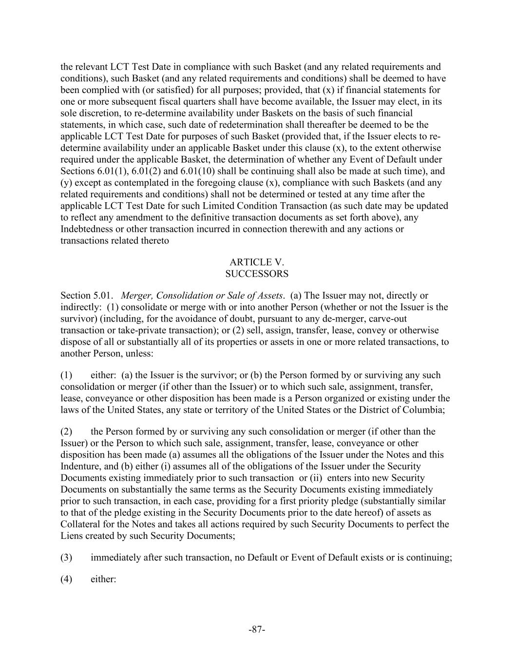 -87- the relevant LCT Test Date in compliance with such Basket (and any related requirements and conditions), such Basket (and any related requirements and conditions) shall be deemed to have been complied with (or satisfied) for all purposes; provided, that (x) if financial statements for one or more subsequent fiscal quarters shall have become available, the Issuer may elect, in its sole discretion, to re-determine availability under Baskets on the basis of such financial statements, in which case, such date of redetermination shall thereafter be deemed to be the applicable LCT Test Date for purposes of such Basket (provided that, if the Issuer elects to re- determine availability under an applicable Basket under this clause (x), to the extent otherwise required under the applicable Basket, the determination of whether any Event of Default under Sections 6.01(1), 6.01(2) and 6.01(10) shall be continuing shall also be made at such time), and (y) except as contemplated in the foregoing clause (x), compliance with such Baskets (and any related requirements and conditions) shall not be determined or tested at any time after the applicable LCT Test Date for such Limited Condition Transaction (as such date may be updated to reflect any amendment to the definitive transaction documents as set forth above), any Indebtedness or other transaction incurred in connection therewith and any actions or transactions related thereto ARTICLE V. SUCCESSORS Section 5.01. Merger, Consolidation or Sale of Assets. (a) The Issuer may not, directly or indirectly: (1) consolidate or merge with or into another Person (whether or not the Issuer is the survivor) (including, for the avoidance of doubt, pursuant to any de-merger, carve-out transaction or take-private transaction); or (2) sell, assign, transfer, lease, convey or otherwise dispose of all or substantially all of its properties or assets in one or more related transactions, to another Person, unless: (1) either: (a) the Issuer is the survivor; or (b) the Person formed by or surviving any such consolidation or merger (if other than the Issuer) or to which such sale, assignment, transfer, lease, conveyance or other disposition has been made is a Person organized or existing under the laws of the United States, any state or territory of the United States or the District of Columbia; (2) the Person formed by or surviving any such consolidation or merger (if other than the Issuer) or the Person to which such sale, assignment, transfer, lease, conveyance or other disposition has been made (a) assumes all the obligations of the Issuer under the Notes and this Indenture, and (b) either (i) assumes all of the obligations of the Issuer under the Security Documents existing immediately prior to such transaction or (ii) enters into new Security Documents on substantially the same terms as the Security Documents existing immediately prior to such transaction, in each case, providing for a first priority pledge (substantially similar to that of the pledge existing in the Security Documents prior to the date hereof) of assets as Collateral for the Notes and takes all actions required by such Security Documents to perfect the Liens created by such Security Documents; (3) immediately after such transaction, no Default or Event of Default exists or is continuing; (4) either: