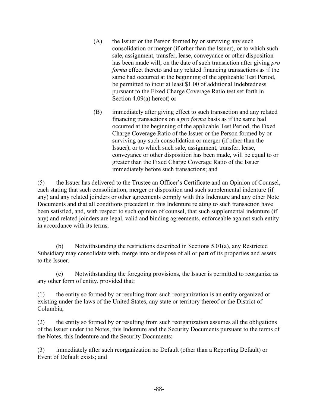 -88- (A) the Issuer or the Person formed by or surviving any such consolidation or merger (if other than the Issuer), or to which such sale, assignment, transfer, lease, conveyance or other disposition has been made will, on the date of such transaction after giving pro forma effect thereto and any related financing transactions as if the same had occurred at the beginning of the applicable Test Period, be permitted to incur at least $1.00 of additional Indebtedness pursuant to the Fixed Charge Coverage Ratio test set forth in Section 4.09(a) hereof; or (B) immediately after giving effect to such transaction and any related financing transactions on a pro forma basis as if the same had occurred at the beginning of the applicable Test Period, the Fixed Charge Coverage Ratio of the Issuer or the Person formed by or surviving any such consolidation or merger (if other than the Issuer), or to which such sale, assignment, transfer, lease, conveyance or other disposition has been made, will be equal to or greater than the Fixed Charge Coverage Ratio of the Issuer immediately before such transactions; and (5) the Issuer has delivered to the Trustee an Officer’s Certificate and an Opinion of Counsel, each stating that such consolidation, merger or disposition and such supplemental indenture (if any) and any related joinders or other agreements comply with this Indenture and any other Note Documents and that all conditions precedent in this Indenture relating to such transaction have been satisfied, and, with respect to such opinion of counsel, that such supplemental indenture (if any) and related joinders are legal, valid and binding agreements, enforceable against such entity in accordance with its terms. (b) Notwithstanding the restrictions described in Sections 5.01(a), any Restricted Subsidiary may consolidate with, merge into or dispose of all or part of its properties and assets to the Issuer. (c) Notwithstanding the foregoing provisions, the Issuer is permitted to reorganize as any other form of entity, provided that: (1) the entity so formed by or resulting from such reorganization is an entity organized or existing under the laws of the United States, any state or territory thereof or the District of Columbia; (2) the entity so formed by or resulting from such reorganization assumes all the obligations of the Issuer under the Notes, this Indenture and the Security Documents pursuant to the terms of the Notes, this Indenture and the Security Documents; (3) immediately after such reorganization no Default (other than a Reporting Default) or Event of Default exists; and