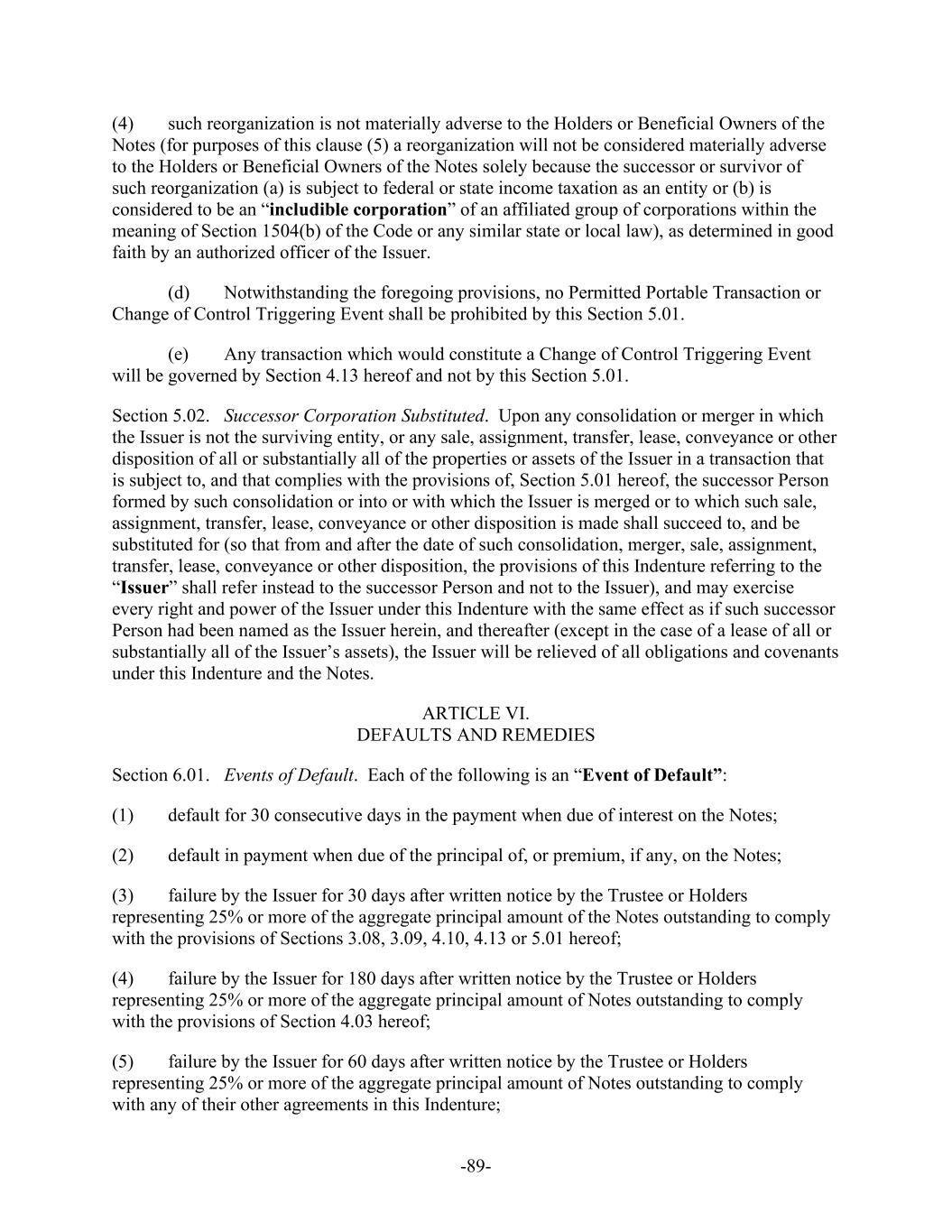 -89- (4) such reorganization is not materially adverse to the Holders or Beneficial Owners of the Notes (for purposes of this clause (5) a reorganization will not be considered materially adverse to the Holders or Beneficial Owners of the Notes solely because the successor or survivor of such reorganization (a) is subject to federal or state income taxation as an entity or (b) is considered to be an “includible corporation” of an affiliated group of corporations within the meaning of Section 1504(b) of the Code or any similar state or local law), as determined in good faith by an authorized officer of the Issuer. (d) Notwithstanding the foregoing provisions, no Permitted Portable Transaction or Change of Control Triggering Event shall be prohibited by this Section 5.01. (e) Any transaction which would constitute a Change of Control Triggering Event will be governed by Section 4.13 hereof and not by this Section 5.01. Section 5.02. Successor Corporation Substituted. Upon any consolidation or merger in which the Issuer is not the surviving entity, or any sale, assignment, transfer, lease, conveyance or other disposition of all or substantially all of the properties or assets of the Issuer in a transaction that is subject to, and that complies with the provisions of, Section 5.01 hereof, the successor Person formed by such consolidation or into or with which the Issuer is merged or to which such sale, assignment, transfer, lease, conveyance or other disposition is made shall succeed to, and be substituted for (so that from and after the date of such consolidation, merger, sale, assignment, transfer, lease, conveyance or other disposition, the provisions of this Indenture referring to the “Issuer” shall refer instead to the successor Person and not to the Issuer), and may exercise every right and power of the Issuer under this Indenture with the same effect as if such successor Person had been named as the Issuer herein, and thereafter (except in the case of a lease of all or substantially all of the Issuer’s assets), the Issuer will be relieved of all obligations and covenants under this Indenture and the Notes. ARTICLE VI. DEFAULTS AND REMEDIES Section 6.01. Events of Default. Each of the following is an “Event of Default”: (1) default for 30 consecutive days in the payment when due of interest on the Notes; (2) default in payment when due of the principal of, or premium, if any, on the Notes; (3) failure by the Issuer for 30 days after written notice by the Trustee or Holders representing 25% or more of the aggregate principal amount of the Notes outstanding to comply with the provisions of Sections 3.08, 3.09, 4.10, 4.13 or 5.01 hereof; (4) failure by the Issuer for 180 days after written notice by the Trustee or Holders representing 25% or more of the aggregate principal amount of Notes outstanding to comply with the provisions of Section 4.03 hereof; (5) failure by the Issuer for 60 days after written notice by the Trustee or Holders representing 25% or more of the aggregate principal amount of Notes outstanding to comply with any of their other agreements in this Indenture;