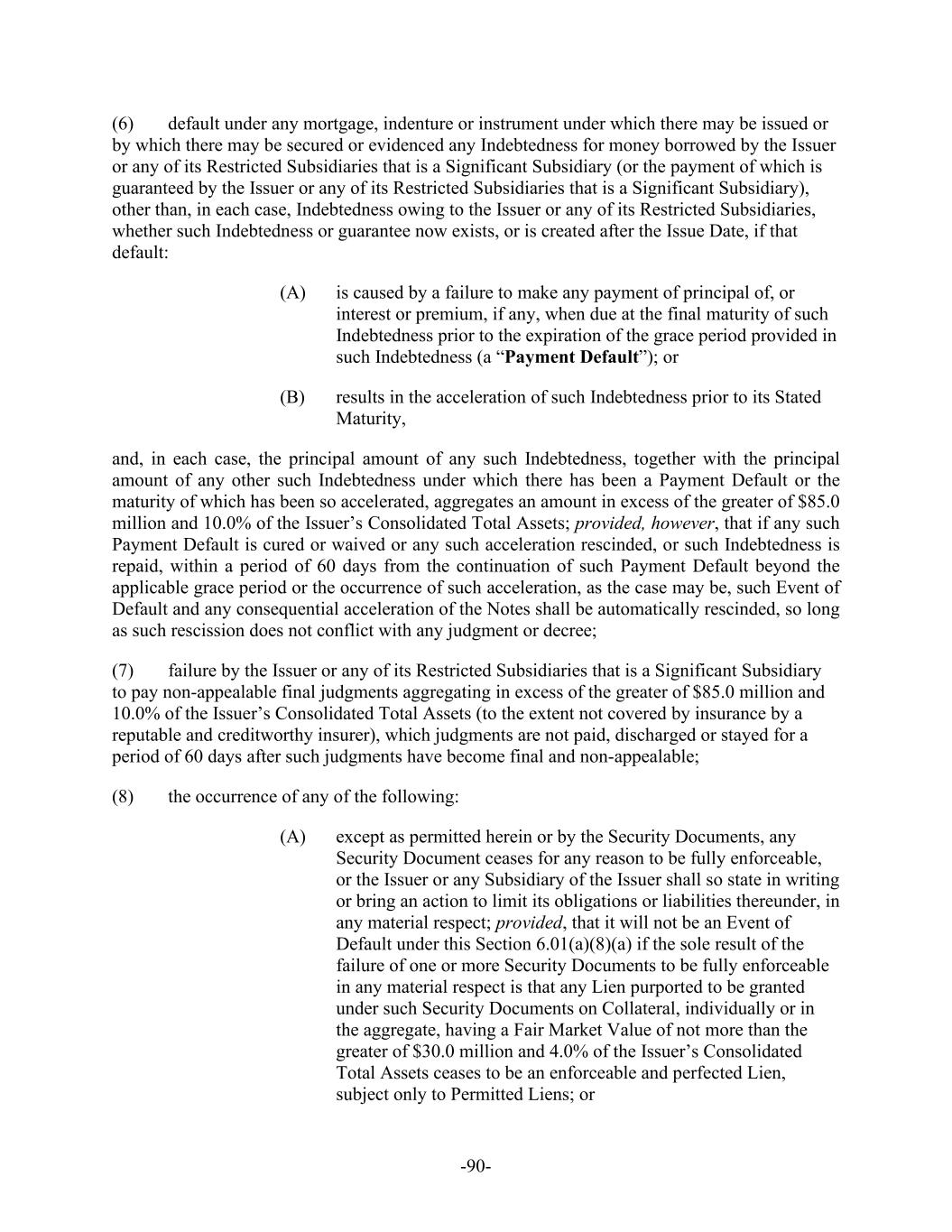 -90- (6) default under any mortgage, indenture or instrument under which there may be issued or by which there may be secured or evidenced any Indebtedness for money borrowed by the Issuer or any of its Restricted Subsidiaries that is a Significant Subsidiary (or the payment of which is guaranteed by the Issuer or any of its Restricted Subsidiaries that is a Significant Subsidiary), other than, in each case, Indebtedness owing to the Issuer or any of its Restricted Subsidiaries, whether such Indebtedness or guarantee now exists, or is created after the Issue Date, if that default: (A) is caused by a failure to make any payment of principal of, or interest or premium, if any, when due at the final maturity of such Indebtedness prior to the expiration of the grace period provided in such Indebtedness (a “Payment Default”); or (B) results in the acceleration of such Indebtedness prior to its Stated Maturity, and, in each case, the principal amount of any such Indebtedness, together with the principal amount of any other such Indebtedness under which there has been a Payment Default or the maturity of which has been so accelerated, aggregates an amount in excess of the greater of $85.0 million and 10.0% of the Issuer’s Consolidated Total Assets; provided, however, that if any such Payment Default is cured or waived or any such acceleration rescinded, or such Indebtedness is repaid, within a period of 60 days from the continuation of such Payment Default beyond the applicable grace period or the occurrence of such acceleration, as the case may be, such Event of Default and any consequential acceleration of the Notes shall be automatically rescinded, so long as such rescission does not conflict with any judgment or decree; (7) failure by the Issuer or any of its Restricted Subsidiaries that is a Significant Subsidiary to pay non-appealable final judgments aggregating in excess of the greater of $85.0 million and 10.0% of the Issuer’s Consolidated Total Assets (to the extent not covered by insurance by a reputable and creditworthy insurer), which judgments are not paid, discharged or stayed for a period of 60 days after such judgments have become final and non-appealable; (8) the occurrence of any of the following: (A) except as permitted herein or by the Security Documents, any Security Document ceases for any reason to be fully enforceable, or the Issuer or any Subsidiary of the Issuer shall so state in writing or bring an action to limit its obligations or liabilities thereunder, in any material respect; provided, that it will not be an Event of Default under this Section 6.01(a)(8)(a) if the sole result of the failure of one or more Security Documents to be fully enforceable in any material respect is that any Lien purported to be granted under such Security Documents on Collateral, individually or in the aggregate, having a Fair Market Value of not more than the greater of $30.0 million and 4.0% of the Issuer’s Consolidated Total Assets ceases to be an enforceable and perfected Lien, subject only to Permitted Liens; or