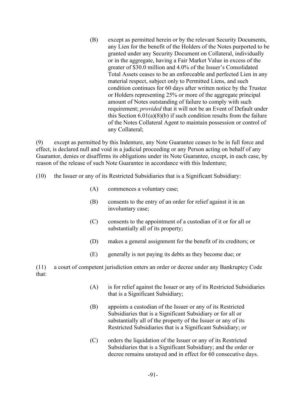 -91- (B) except as permitted herein or by the relevant Security Documents, any Lien for the benefit of the Holders of the Notes purported to be granted under any Security Document on Collateral, individually or in the aggregate, having a Fair Market Value in excess of the greater of $30.0 million and 4.0% of the Issuer’s Consolidated Total Assets ceases to be an enforceable and perfected Lien in any material respect, subject only to Permitted Liens, and such condition continues for 60 days after written notice by the Trustee or Holders representing 25% or more of the aggregate principal amount of Notes outstanding of failure to comply with such requirement; provided that it will not be an Event of Default under this Section 6.01(a)(8)(b) if such condition results from the failure of the Notes Collateral Agent to maintain possession or control of any Collateral; (9) except as permitted by this Indenture, any Note Guarantee ceases to be in full force and effect, is declared null and void in a judicial proceeding or any Person acting on behalf of any Guarantor, denies or disaffirms its obligations under its Note Guarantee, except, in each case, by reason of the release of such Note Guarantee in accordance with this Indenture; (10) the Issuer or any of its Restricted Subsidiaries that is a Significant Subsidiary: (A) commences a voluntary case; (B) consents to the entry of an order for relief against it in an involuntary case; (C) consents to the appointment of a custodian of it or for all or substantially all of its property; (D) makes a general assignment for the benefit of its creditors; or (E) generally is not paying its debts as they become due; or (11) a court of competent jurisdiction enters an order or decree under any Bankruptcy Code that: (A) is for relief against the Issuer or any of its Restricted Subsidiaries that is a Significant Subsidiary; (B) appoints a custodian of the Issuer or any of its Restricted Subsidiaries that is a Significant Subsidiary or for all or substantially all of the property of the Issuer or any of its Restricted Subsidiaries that is a Significant Subsidiary; or (C) orders the liquidation of the Issuer or any of its Restricted Subsidiaries that is a Significant Subsidiary; and the order or decree remains unstayed and in effect for 60 consecutive days.