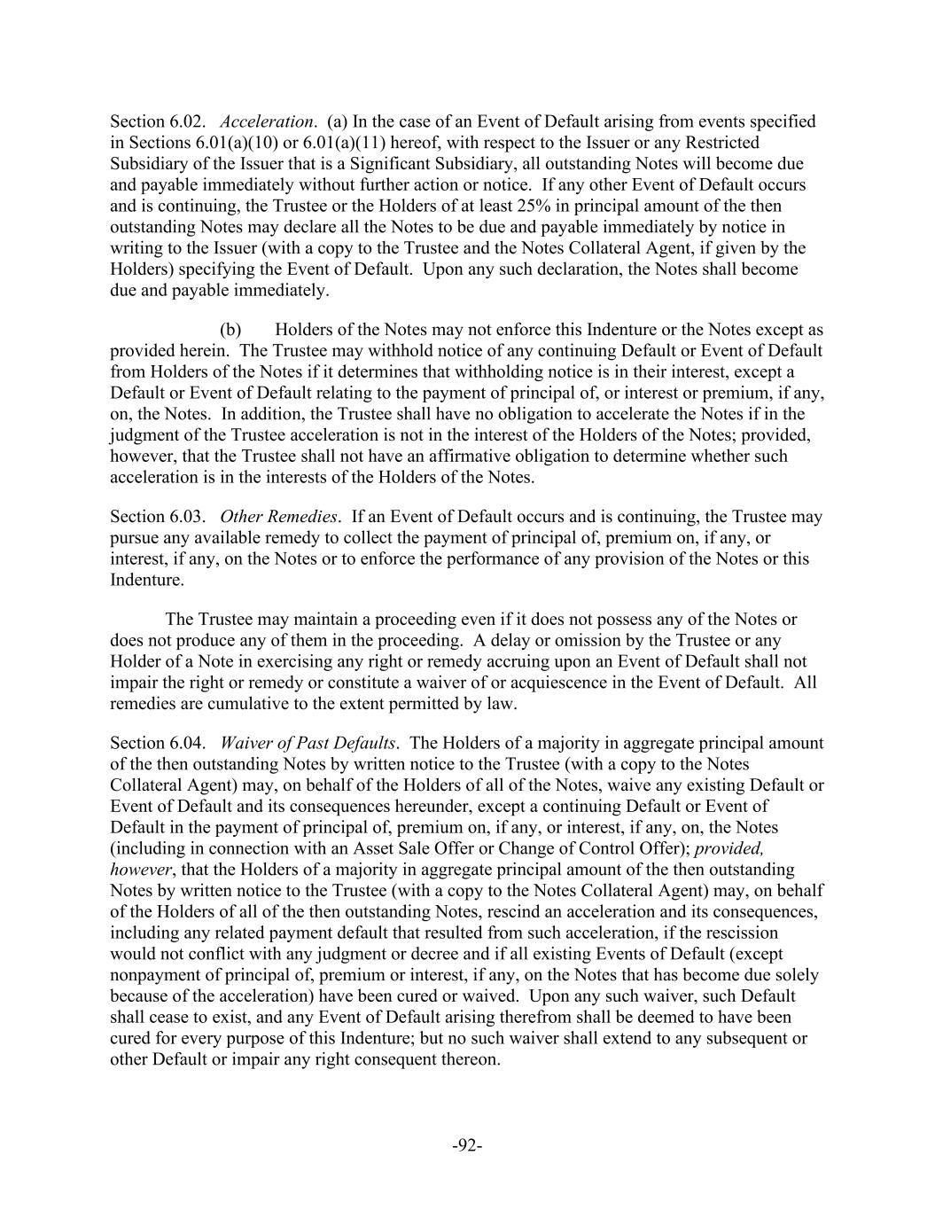 -92- Section 6.02. Acceleration. (a) In the case of an Event of Default arising from events specified in Sections 6.01(a)(10) or 6.01(a)(11) hereof, with respect to the Issuer or any Restricted Subsidiary of the Issuer that is a Significant Subsidiary, all outstanding Notes will become due and payable immediately without further action or notice. If any other Event of Default occurs and is continuing, the Trustee or the Holders of at least 25% in principal amount of the then outstanding Notes may declare all the Notes to be due and payable immediately by notice in writing to the Issuer (with a copy to the Trustee and the Notes Collateral Agent, if given by the Holders) specifying the Event of Default. Upon any such declaration, the Notes shall become due and payable immediately. (b) Holders of the Notes may not enforce this Indenture or the Notes except as provided herein. The Trustee may withhold notice of any continuing Default or Event of Default from Holders of the Notes if it determines that withholding notice is in their interest, except a Default or Event of Default relating to the payment of principal of, or interest or premium, if any, on, the Notes. In addition, the Trustee shall have no obligation to accelerate the Notes if in the judgment of the Trustee acceleration is not in the interest of the Holders of the Notes; provided, however, that the Trustee shall not have an affirmative obligation to determine whether such acceleration is in the interests of the Holders of the Notes. Section 6.03. Other Remedies. If an Event of Default occurs and is continuing, the Trustee may pursue any available remedy to collect the payment of principal of, premium on, if any, or interest, if any, on the Notes or to enforce the performance of any provision of the Notes or this Indenture. The Trustee may maintain a proceeding even if it does not possess any of the Notes or does not produce any of them in the proceeding. A delay or omission by the Trustee or any Holder of a Note in exercising any right or remedy accruing upon an Event of Default shall not impair the right or remedy or constitute a waiver of or acquiescence in the Event of Default. All remedies are cumulative to the extent permitted by law. Section 6.04. Waiver of Past Defaults. The Holders of a majority in aggregate principal amount of the then outstanding Notes by written notice to the Trustee (with a copy to the Notes Collateral Agent) may, on behalf of the Holders of all of the Notes, waive any existing Default or Event of Default and its consequences hereunder, except a continuing Default or Event of Default in the payment of principal of, premium on, if any, or interest, if any, on, the Notes (including in connection with an Asset Sale Offer or Change of Control Offer); provided, however, that the Holders of a majority in aggregate principal amount of the then outstanding Notes by written notice to the Trustee (with a copy to the Notes Collateral Agent) may, on behalf of the Holders of all of the then outstanding Notes, rescind an acceleration and its consequences, including any related payment default that resulted from such acceleration, if the rescission would not conflict with any judgment or decree and if all existing Events of Default (except nonpayment of principal of, premium or interest, if any, on the Notes that has become due solely because of the acceleration) have been cured or waived. Upon any such waiver, such Default shall cease to exist, and any Event of Default arising therefrom shall be deemed to have been cured for every purpose of this Indenture; but no such waiver shall extend to any subsequent or other Default or impair any right consequent thereon.