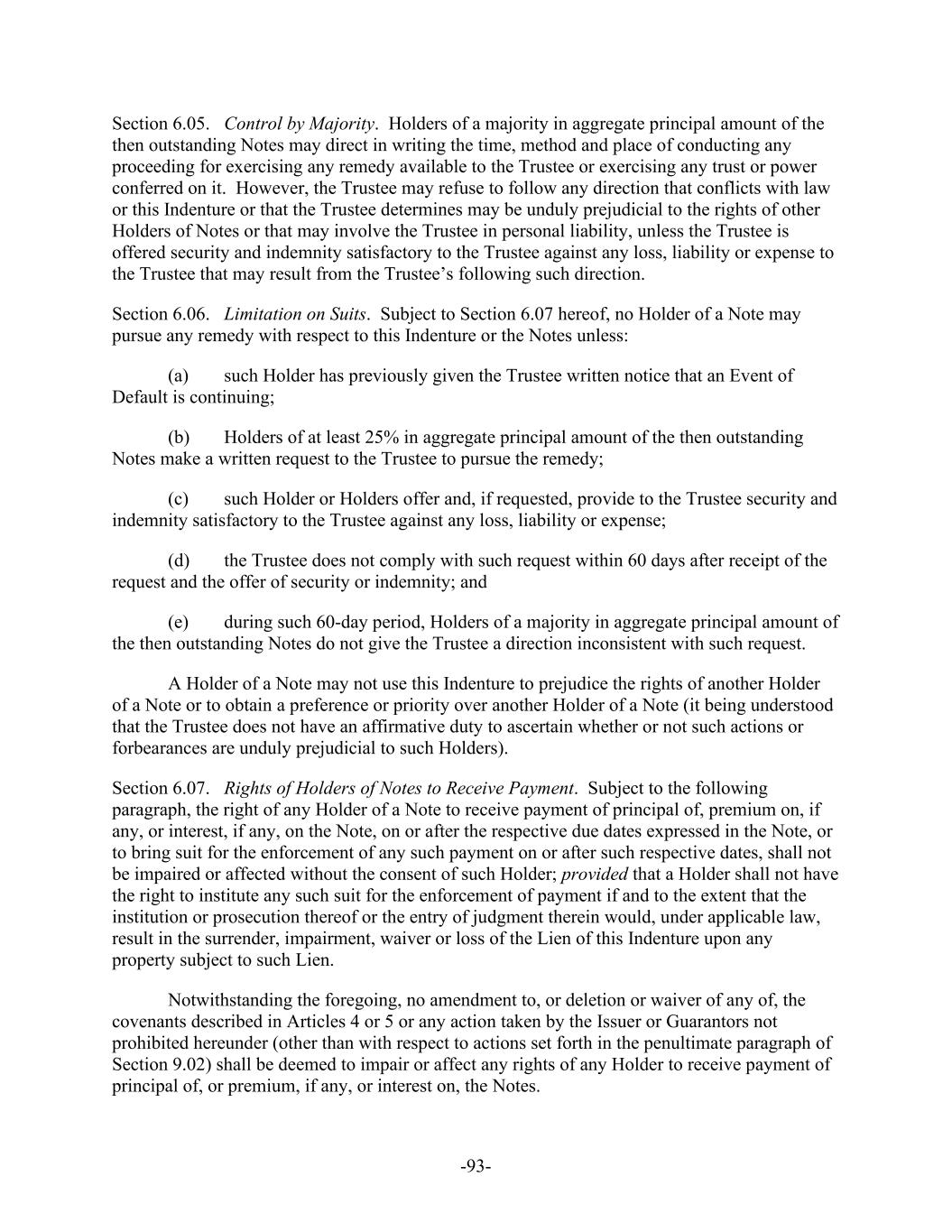 -93- Section 6.05. Control by Majority. Holders of a majority in aggregate principal amount of the then outstanding Notes may direct in writing the time, method and place of conducting any proceeding for exercising any remedy available to the Trustee or exercising any trust or power conferred on it. However, the Trustee may refuse to follow any direction that conflicts with law or this Indenture or that the Trustee determines may be unduly prejudicial to the rights of other Holders of Notes or that may involve the Trustee in personal liability, unless the Trustee is offered security and indemnity satisfactory to the Trustee against any loss, liability or expense to the Trustee that may result from the Trustee’s following such direction. Section 6.06. Limitation on Suits. Subject to Section 6.07 hereof, no Holder of a Note may pursue any remedy with respect to this Indenture or the Notes unless: (a) such Holder has previously given the Trustee written notice that an Event of Default is continuing; (b) Holders of at least 25% in aggregate principal amount of the then outstanding Notes make a written request to the Trustee to pursue the remedy; (c) such Holder or Holders offer and, if requested, provide to the Trustee security and indemnity satisfactory to the Trustee against any loss, liability or expense; (d) the Trustee does not comply with such request within 60 days after receipt of the request and the offer of security or indemnity; and (e) during such 60-day period, Holders of a majority in aggregate principal amount of the then outstanding Notes do not give the Trustee a direction inconsistent with such request. A Holder of a Note may not use this Indenture to prejudice the rights of another Holder of a Note or to obtain a preference or priority over another Holder of a Note (it being understood that the Trustee does not have an affirmative duty to ascertain whether or not such actions or forbearances are unduly prejudicial to such Holders). Section 6.07. Rights of Holders of Notes to Receive Payment. Subject to the following paragraph, the right of any Holder of a Note to receive payment of principal of, premium on, if any, or interest, if any, on the Note, on or after the respective due dates expressed in the Note, or to bring suit for the enforcement of any such payment on or after such respective dates, shall not be impaired or affected without the consent of such Holder; provided that a Holder shall not have the right to institute any such suit for the enforcement of payment if and to the extent that the institution or prosecution thereof or the entry of judgment therein would, under applicable law, result in the surrender, impairment, waiver or loss of the Lien of this Indenture upon any property subject to such Lien. Notwithstanding the foregoing, no amendment to, or deletion or waiver of any of, the covenants described in Articles 4 or 5 or any action taken by the Issuer or Guarantors not prohibited hereunder (other than with respect to actions set forth in the penultimate paragraph of Section 9.02) shall be deemed to impair or affect any rights of any Holder to receive payment of principal of, or premium, if any, or interest on, the Notes.