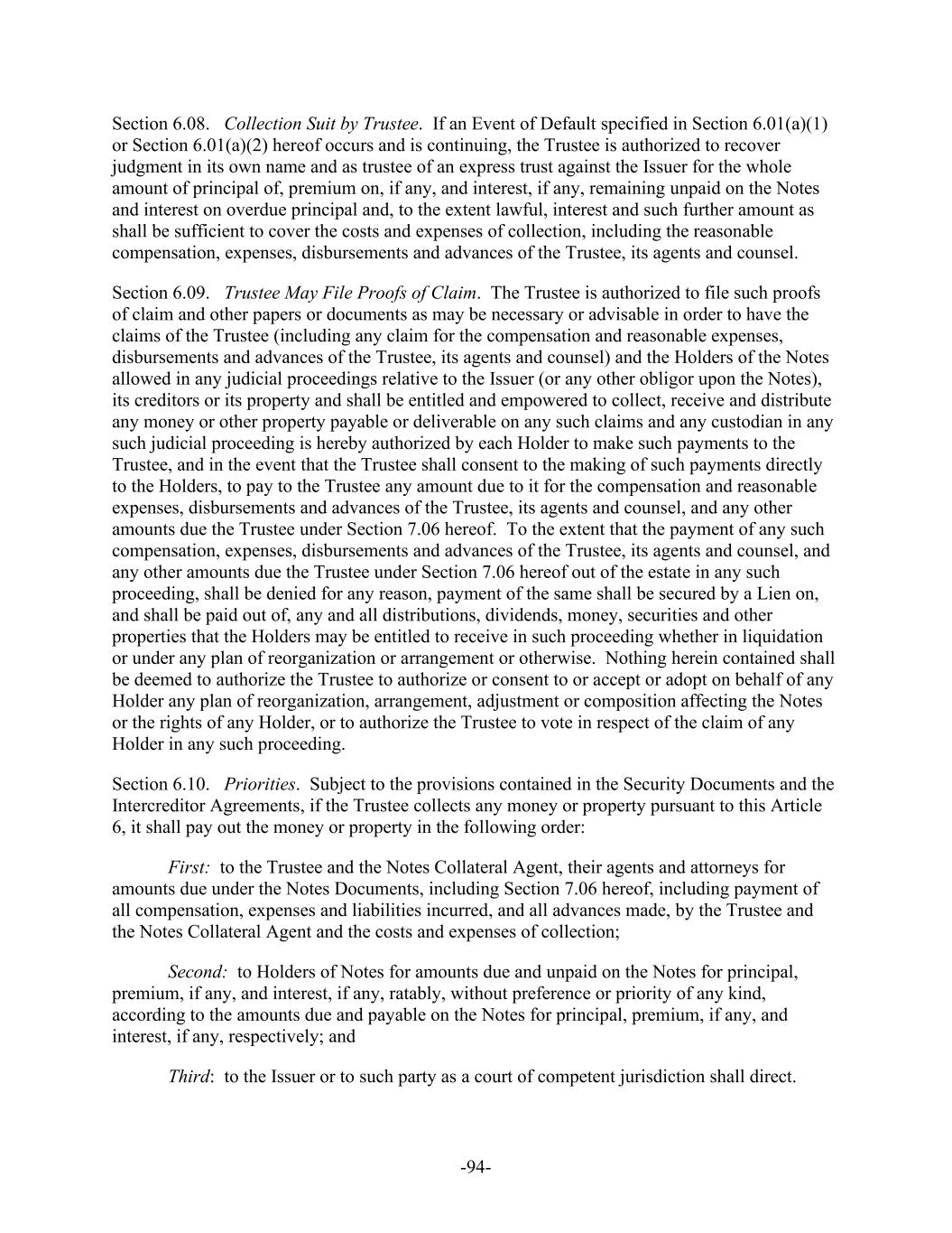 -94- Section 6.08. Collection Suit by Trustee. If an Event of Default specified in Section 6.01(a)(1) or Section 6.01(a)(2) hereof occurs and is continuing, the Trustee is authorized to recover judgment in its own name and as trustee of an express trust against the Issuer for the whole amount of principal of, premium on, if any, and interest, if any, remaining unpaid on the Notes and interest on overdue principal and, to the extent lawful, interest and such further amount as shall be sufficient to cover the costs and expenses of collection, including the reasonable compensation, expenses, disbursements and advances of the Trustee, its agents and counsel. Section 6.09. Trustee May File Proofs of Claim. The Trustee is authorized to file such proofs of claim and other papers or documents as may be necessary or advisable in order to have the claims of the Trustee (including any claim for the compensation and reasonable expenses, disbursements and advances of the Trustee, its agents and counsel) and the Holders of the Notes allowed in any judicial proceedings relative to the Issuer (or any other obligor upon the Notes), its creditors or its property and shall be entitled and empowered to collect, receive and distribute any money or other property payable or deliverable on any such claims and any custodian in any such judicial proceeding is hereby authorized by each Holder to make such payments to the Trustee, and in the event that the Trustee shall consent to the making of such payments directly to the Holders, to pay to the Trustee any amount due to it for the compensation and reasonable expenses, disbursements and advances of the Trustee, its agents and counsel, and any other amounts due the Trustee under Section 7.06 hereof. To the extent that the payment of any such compensation, expenses, disbursements and advances of the Trustee, its agents and counsel, and any other amounts due the Trustee under Section 7.06 hereof out of the estate in any such proceeding, shall be denied for any reason, payment of the same shall be secured by a Lien on, and shall be paid out of, any and all distributions, dividends, money, securities and other properties that the Holders may be entitled to receive in such proceeding whether in liquidation or under any plan of reorganization or arrangement or otherwise. Nothing herein contained shall be deemed to authorize the Trustee to authorize or consent to or accept or adopt on behalf of any Holder any plan of reorganization, arrangement, adjustment or composition affecting the Notes or the rights of any Holder, or to authorize the Trustee to vote in respect of the claim of any Holder in any such proceeding. Section 6.10. Priorities. Subject to the provisions contained in the Security Documents and the Intercreditor Agreements, if the Trustee collects any money or property pursuant to this Article 6, it shall pay out the money or property in the following order: First: to the Trustee and the Notes Collateral Agent, their agents and attorneys for amounts due under the Notes Documents, including Section 7.06 hereof, including payment of all compensation, expenses and liabilities incurred, and all advances made, by the Trustee and the Notes Collateral Agent and the costs and expenses of collection; Second: to Holders of Notes for amounts due and unpaid on the Notes for principal, premium, if any, and interest, if any, ratably, without preference or priority of any kind, according to the amounts due and payable on the Notes for principal, premium, if any, and interest, if any, respectively; and Third: to the Issuer or to such party as a court of competent jurisdiction shall direct.