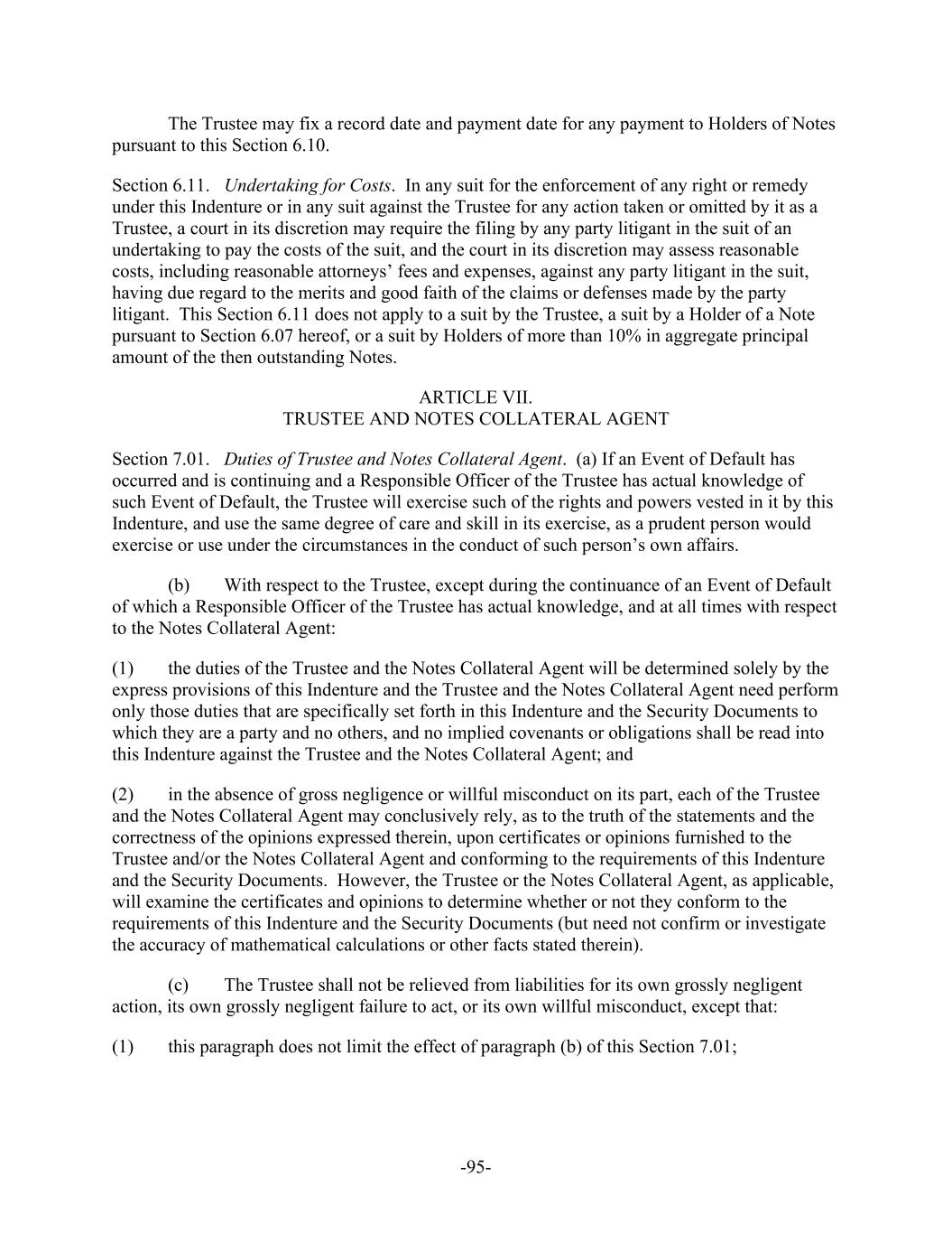 -95- The Trustee may fix a record date and payment date for any payment to Holders of Notes pursuant to this Section 6.10. Section 6.11. Undertaking for Costs. In any suit for the enforcement of any right or remedy under this Indenture or in any suit against the Trustee for any action taken or omitted by it as a Trustee, a court in its discretion may require the filing by any party litigant in the suit of an undertaking to pay the costs of the suit, and the court in its discretion may assess reasonable costs, including reasonable attorneys’ fees and expenses, against any party litigant in the suit, having due regard to the merits and good faith of the claims or defenses made by the party litigant. This Section 6.11 does not apply to a suit by the Trustee, a suit by a Holder of a Note pursuant to Section 6.07 hereof, or a suit by Holders of more than 10% in aggregate principal amount of the then outstanding Notes. ARTICLE VII. TRUSTEE AND NOTES COLLATERAL AGENT Section 7.01. Duties of Trustee and Notes Collateral Agent. (a) If an Event of Default has occurred and is continuing and a Responsible Officer of the Trustee has actual knowledge of such Event of Default, the Trustee will exercise such of the rights and powers vested in it by this Indenture, and use the same degree of care and skill in its exercise, as a prudent person would exercise or use under the circumstances in the conduct of such person’s own affairs. (b) With respect to the Trustee, except during the continuance of an Event of Default of which a Responsible Officer of the Trustee has actual knowledge, and at all times with respect to the Notes Collateral Agent: (1) the duties of the Trustee and the Notes Collateral Agent will be determined solely by the express provisions of this Indenture and the Trustee and the Notes Collateral Agent need perform only those duties that are specifically set forth in this Indenture and the Security Documents to which they are a party and no others, and no implied covenants or obligations shall be read into this Indenture against the Trustee and the Notes Collateral Agent; and (2) in the absence of gross negligence or willful misconduct on its part, each of the Trustee and the Notes Collateral Agent may conclusively rely, as to the truth of the statements and the correctness of the opinions expressed therein, upon certificates or opinions furnished to the Trustee and/or the Notes Collateral Agent and conforming to the requirements of this Indenture and the Security Documents. However, the Trustee or the Notes Collateral Agent, as applicable, will examine the certificates and opinions to determine whether or not they conform to the requirements of this Indenture and the Security Documents (but need not confirm or investigate the accuracy of mathematical calculations or other facts stated therein). (c) The Trustee shall not be relieved from liabilities for its own grossly negligent action, its own grossly negligent failure to act, or its own willful misconduct, except that: (1) this paragraph does not limit the effect of paragraph (b) of this Section 7.01;